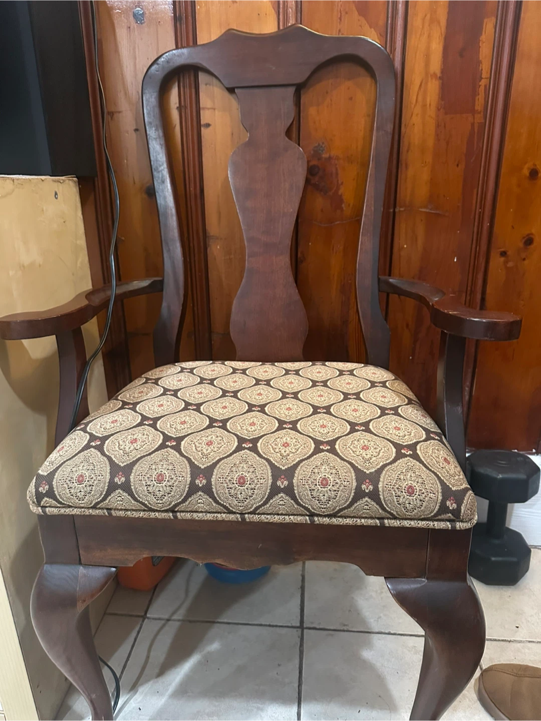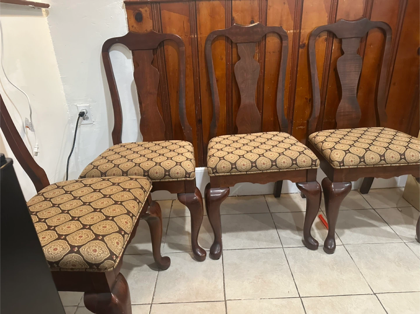 Selling a set of four antique wooden dining chairs. They feature a classic design with a patterned seat cushion. The chairs are sturdy and in good condition, perfect for adding a touch of vintage charm to your dining area!