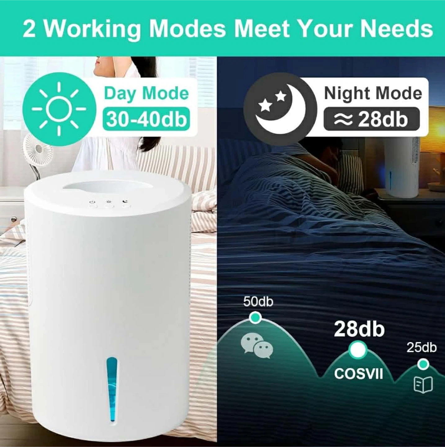 I'm selling a COSVII dehumidifier. It features both day and night modes, operating at 30-40db and ~28db respectively.