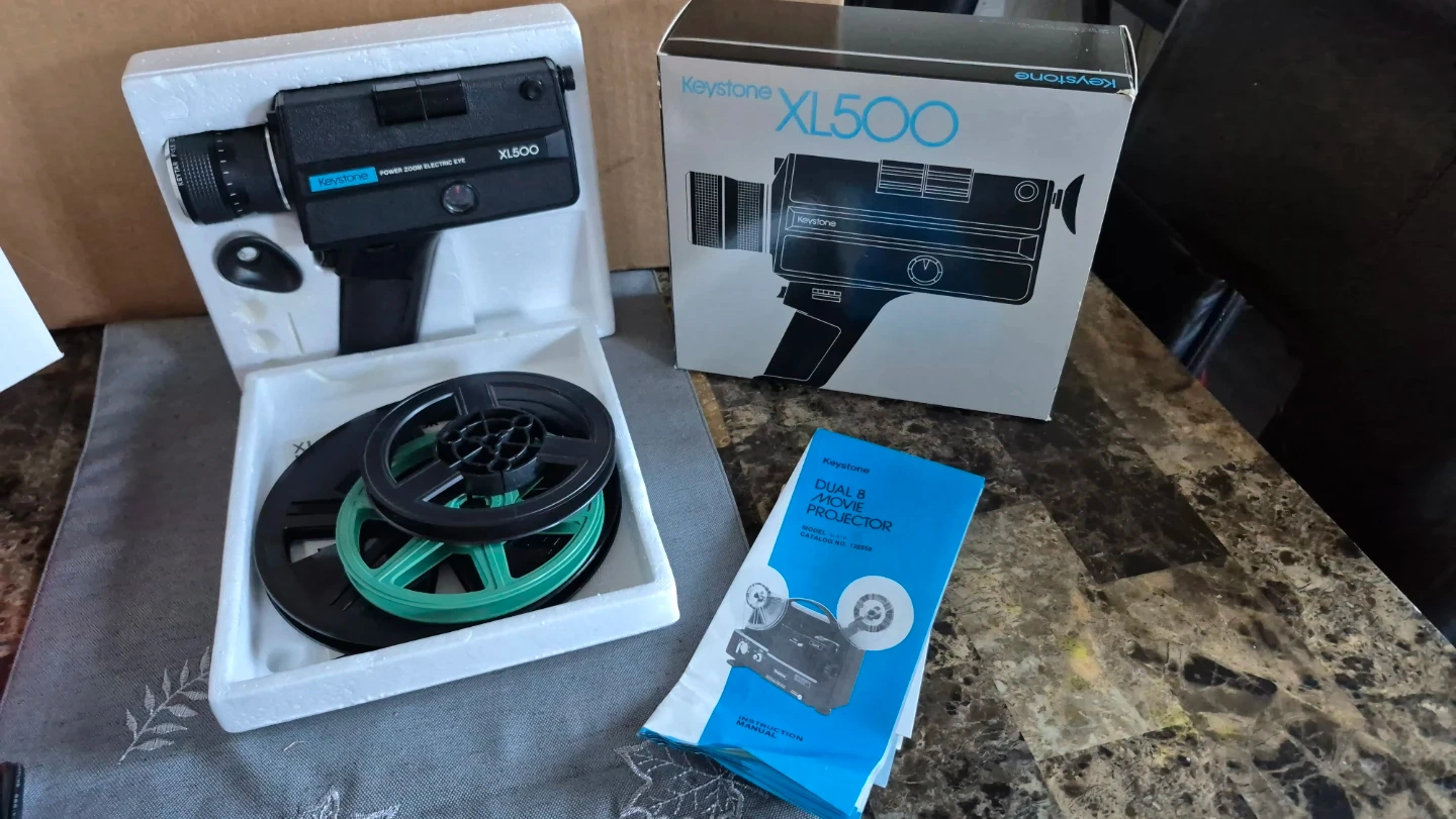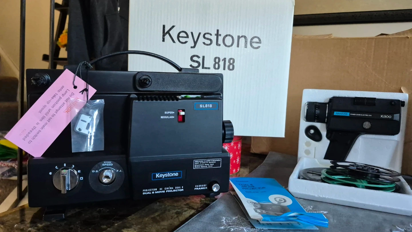 Selling a Keystone XL500 movie camera and a Keystone SL818 movie projector. Both come with their original boxes and components, including reels and cans. A great find for film enthusiasts!