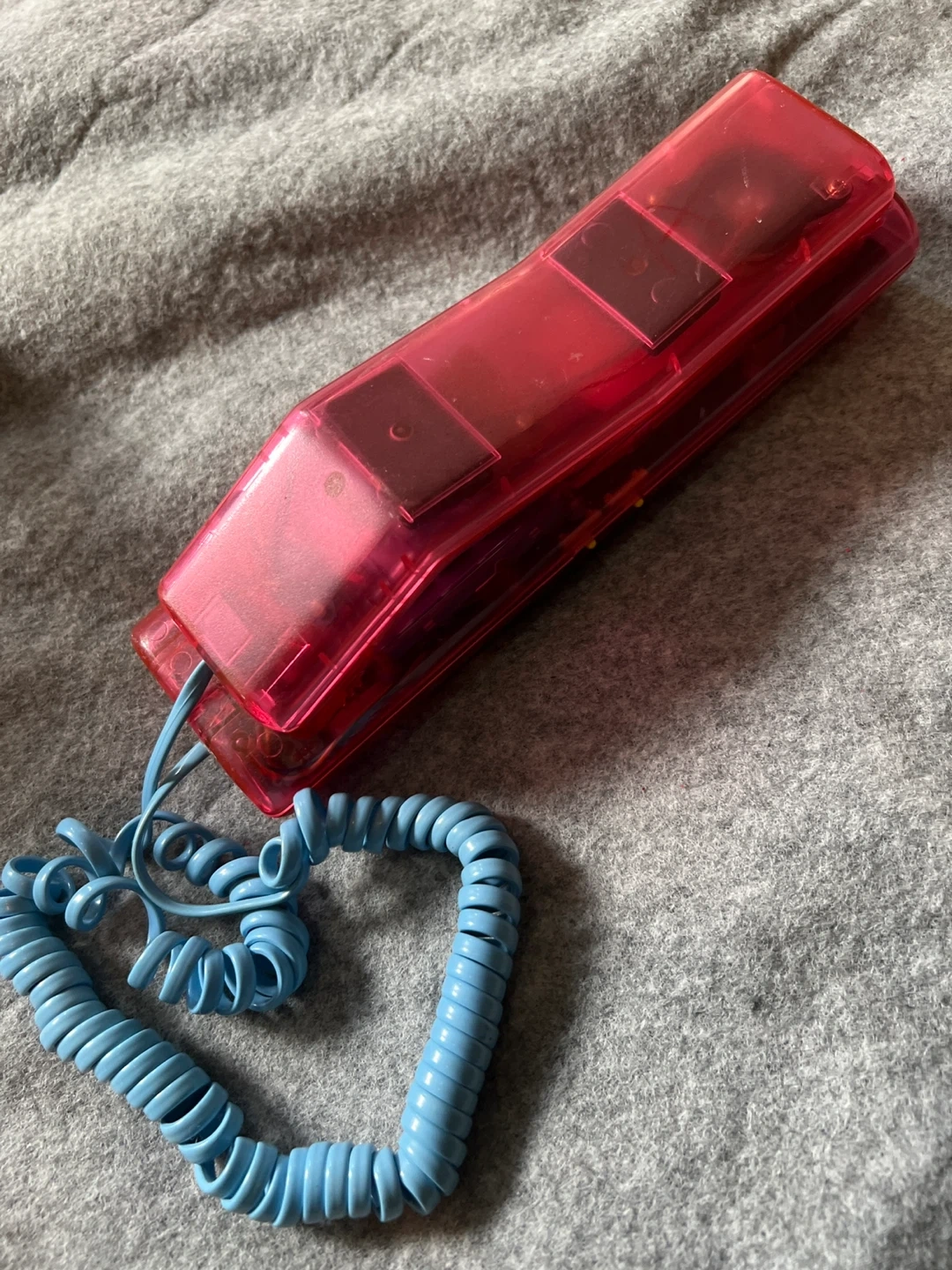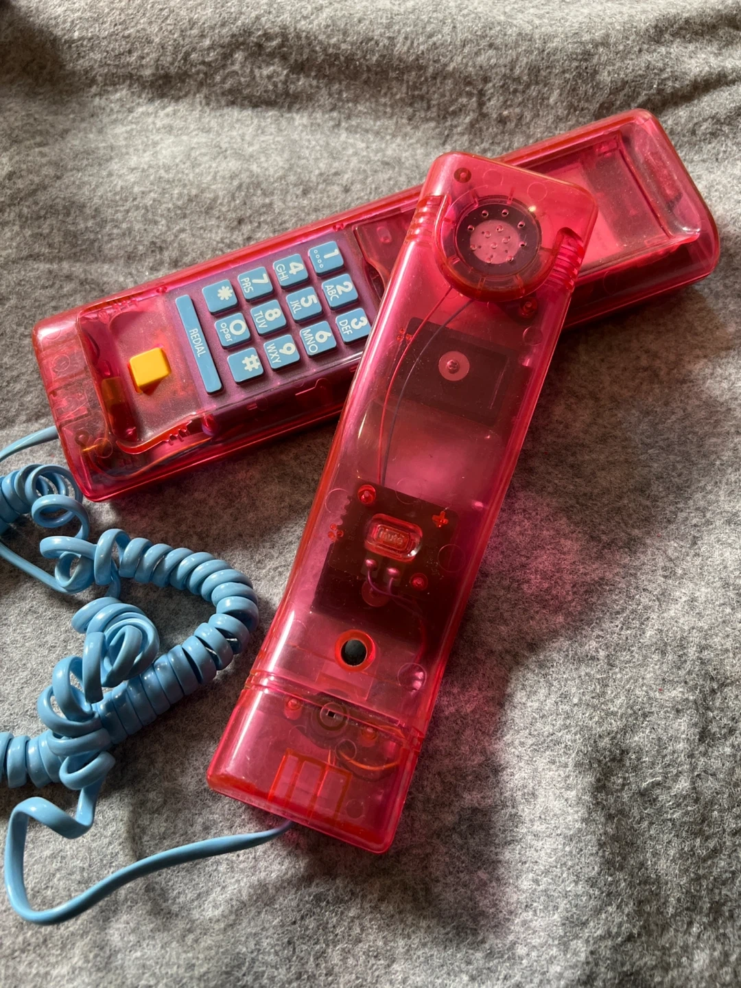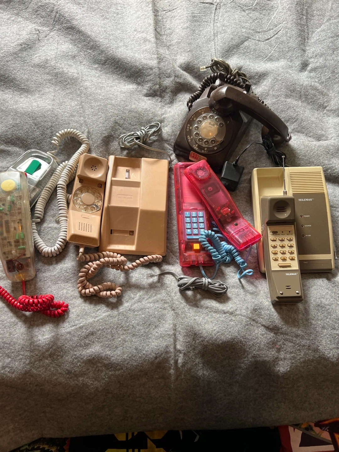 Selling a collection of vintage phones! There's a pink see-through phone with a blue cord, a beige TELEXMAX cordless phone with its base, and a rotary phone. All in used condition, perfect for collectors or those looking for a retro vibe!