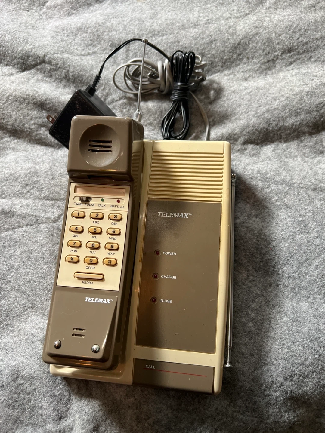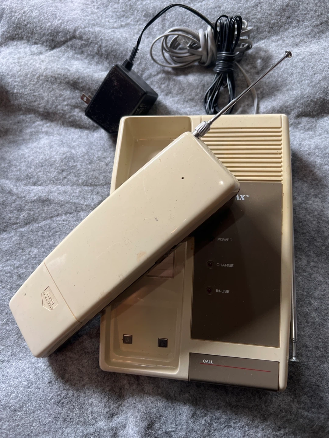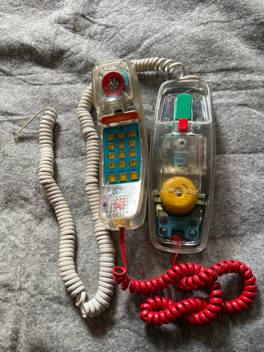 Selling a collection of vintage phones! There's a pink see-through phone with a blue cord, a beige TELEXMAX cordless phone with its base, and a rotary phone. All in used condition, perfect for collectors or those looking for a retro vibe!