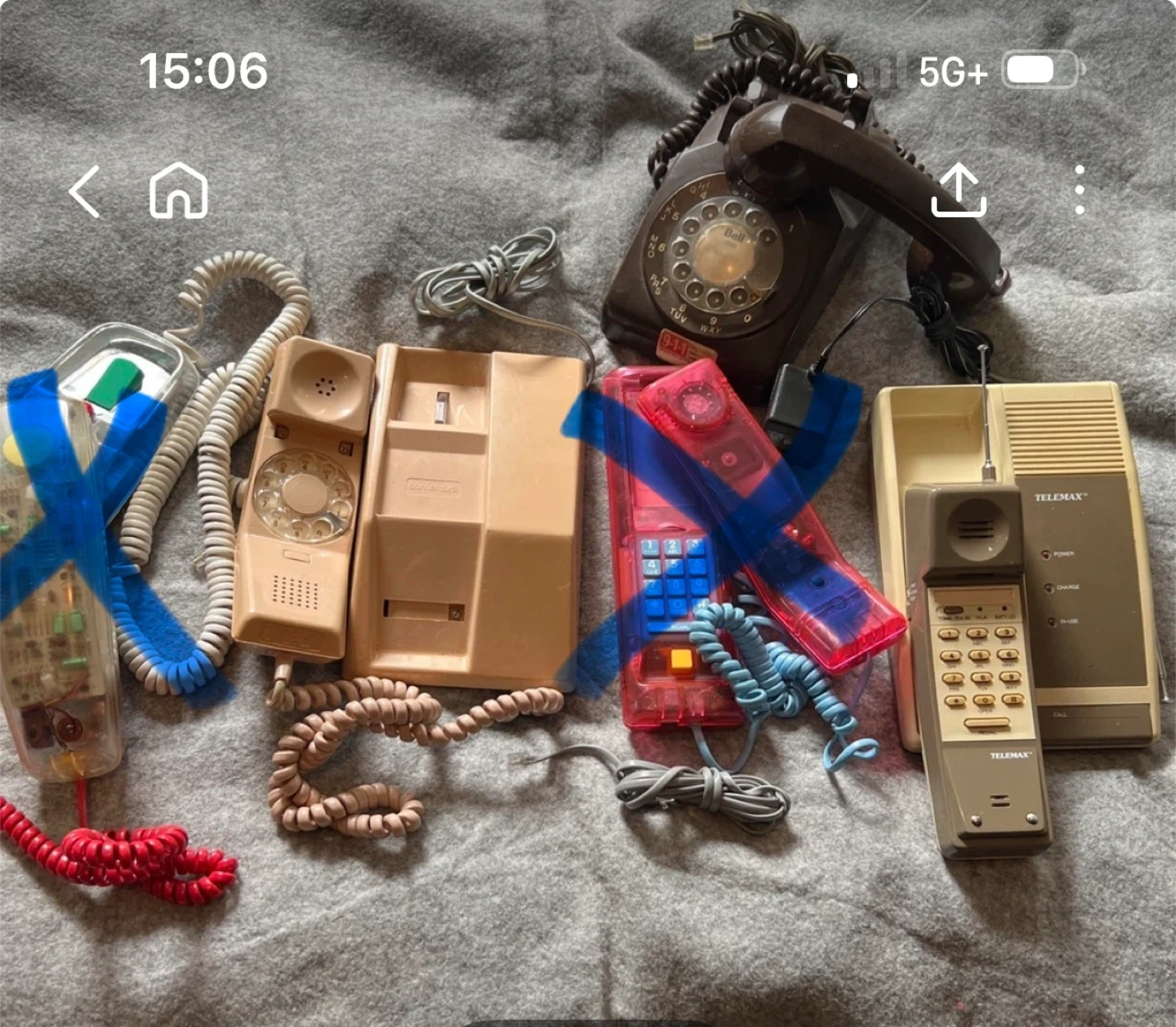 Selling a collection of 3 vintage phones! a beige TELEXMAX cordless phone with its base, and a rotary phone. All in used condition, perfect for collectors or those looking for a retro vibe!