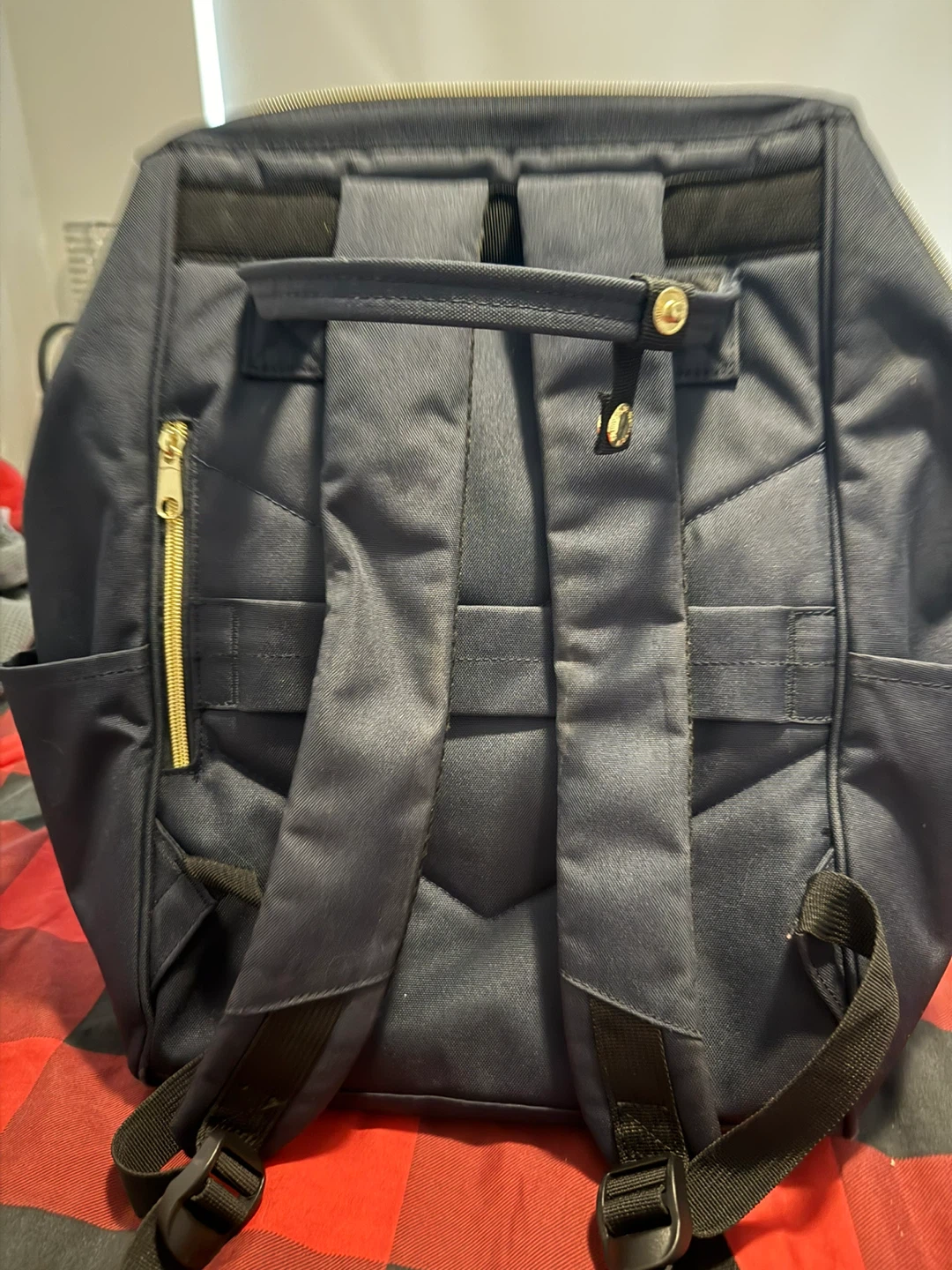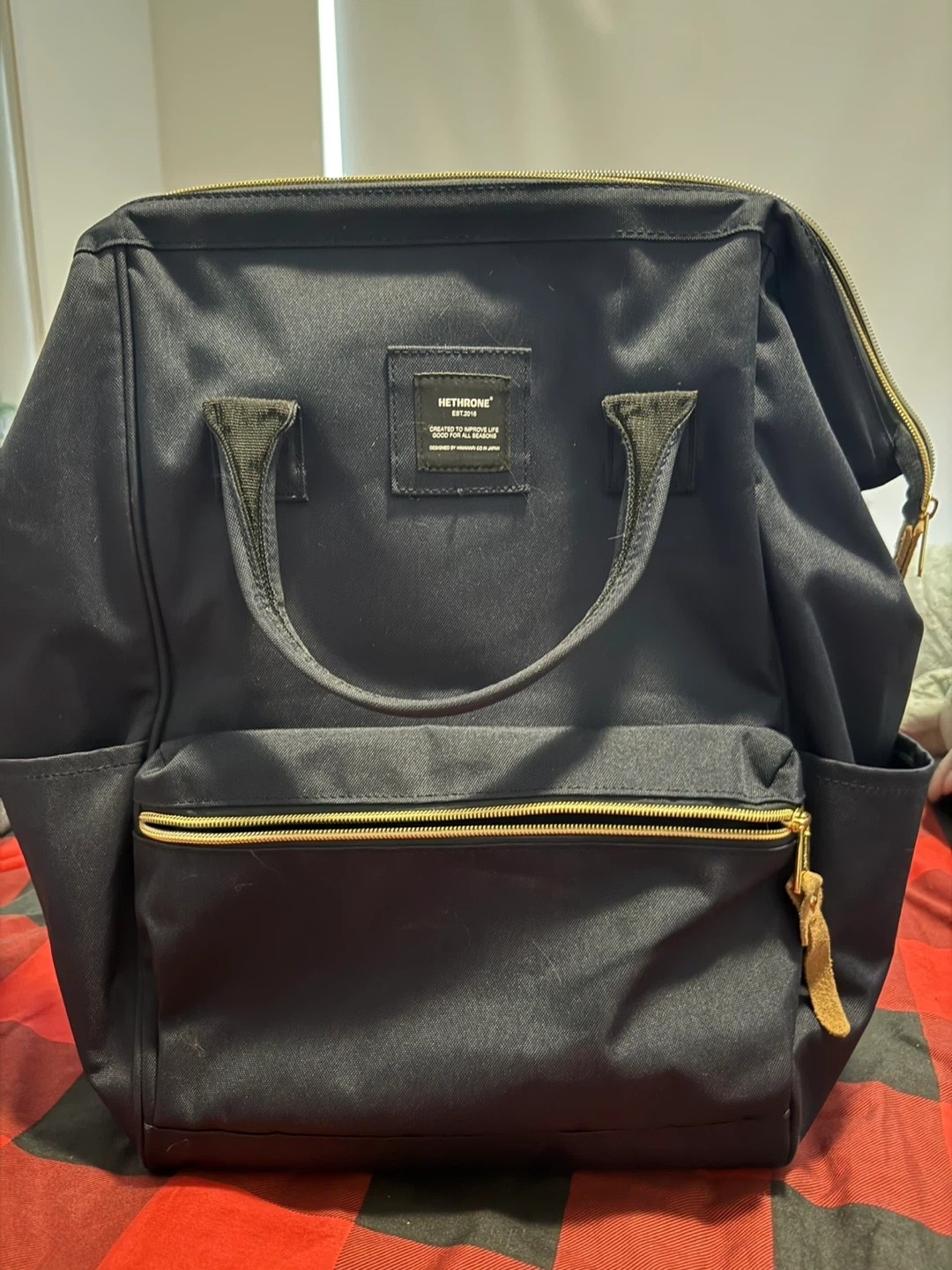 I'm selling a Hethrone diaper bag backpack in navy blue. It's in great condition and perfect for parents on the go! It features multiple compartments to keep everything organized.