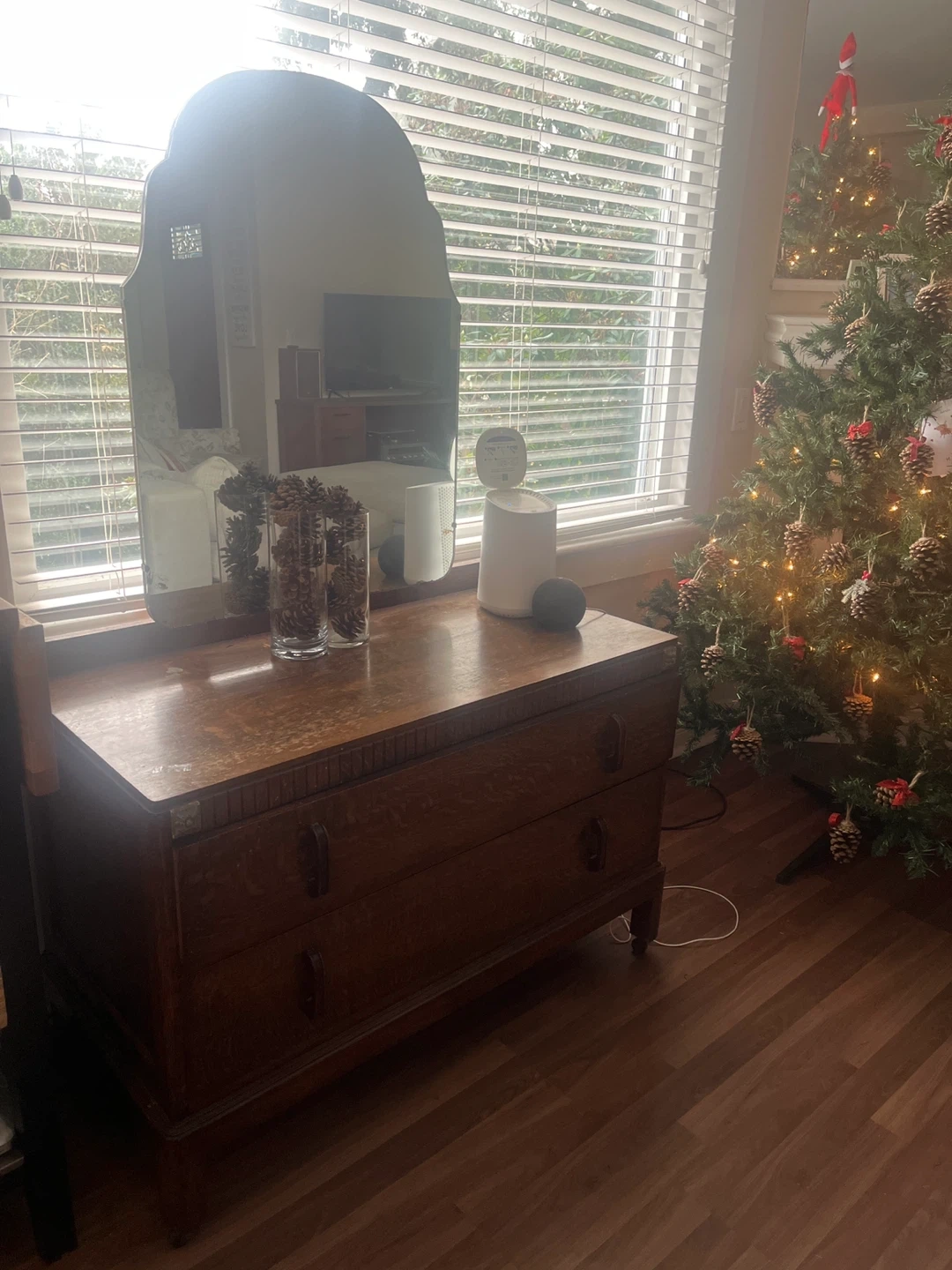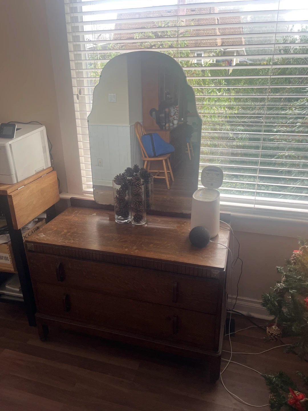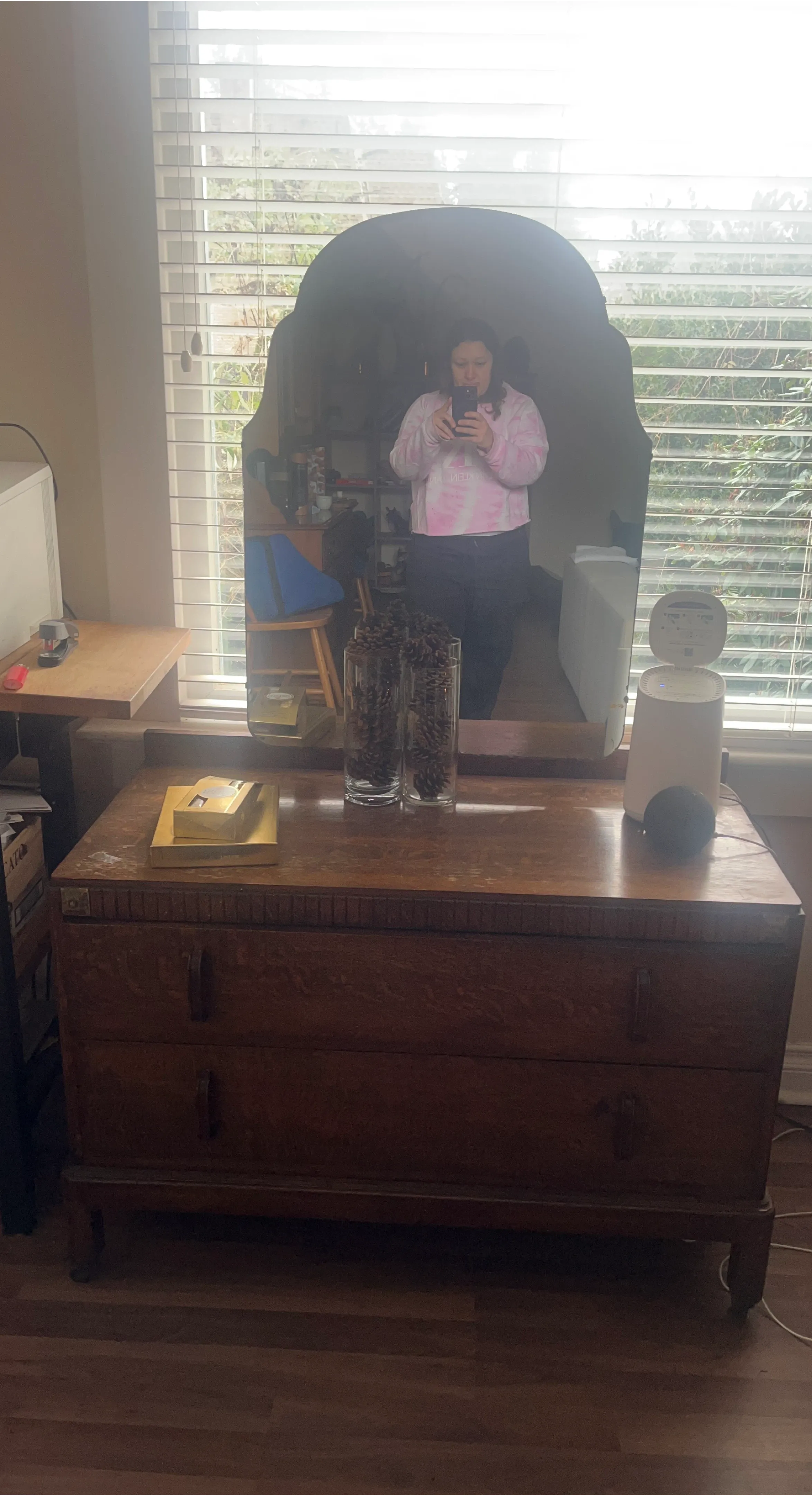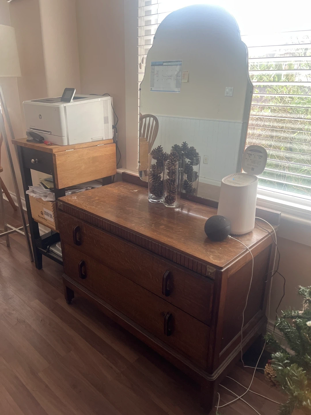 Selling a charming antique wooden dresser with an attached mirror. It has a lovely vintage look and provides ample storage with its drawers. Perfect for adding a touch of classic style to any bedroom or living space!