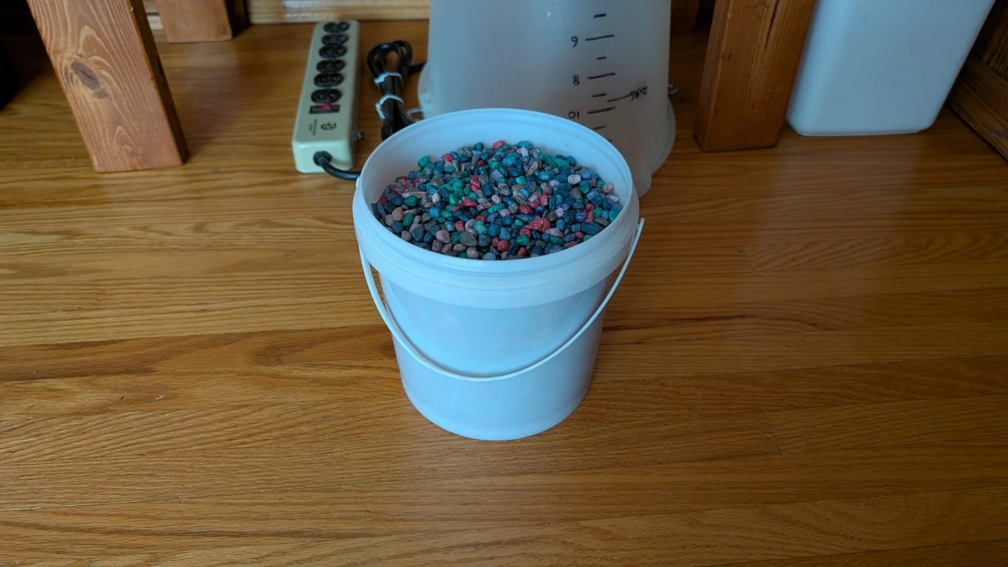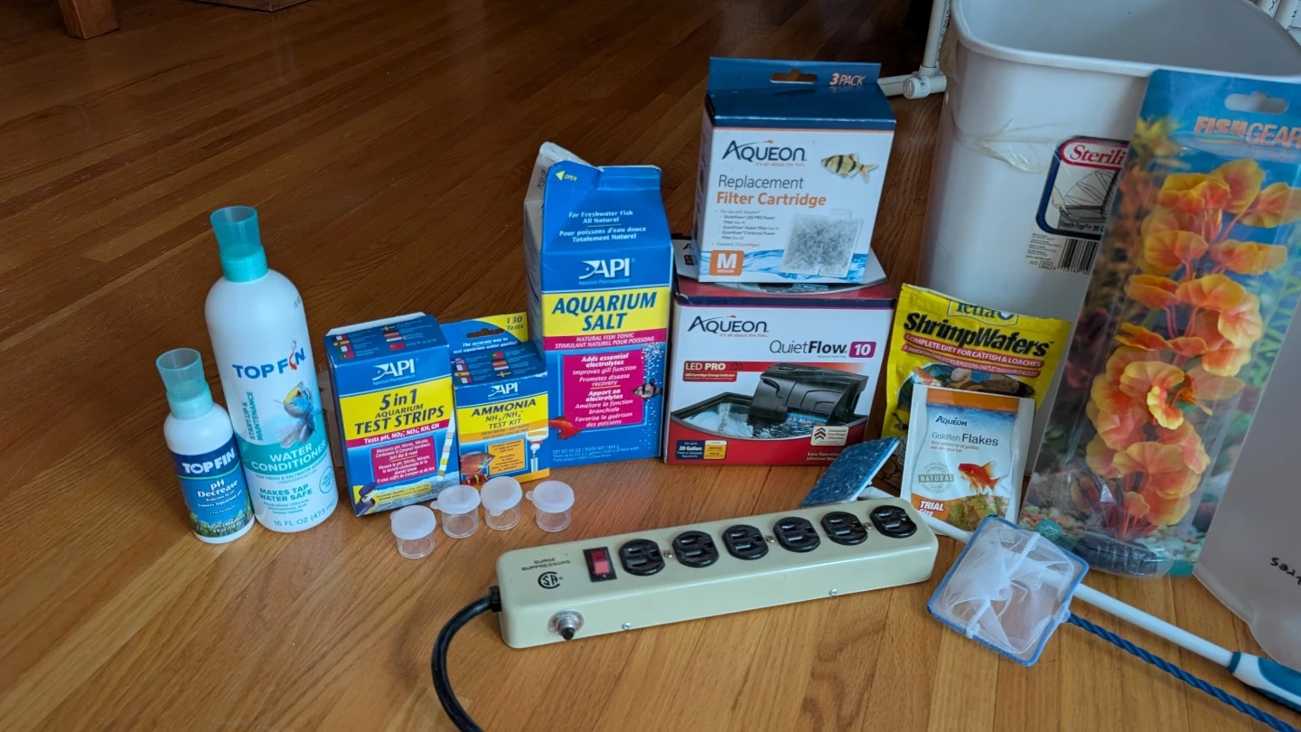 2 pumps/filters, 2 heaters, drain bucket, fresh water bucket, chemicals, cleaning gear, gravel, tank decorations, surge power bar. $75 OBO
