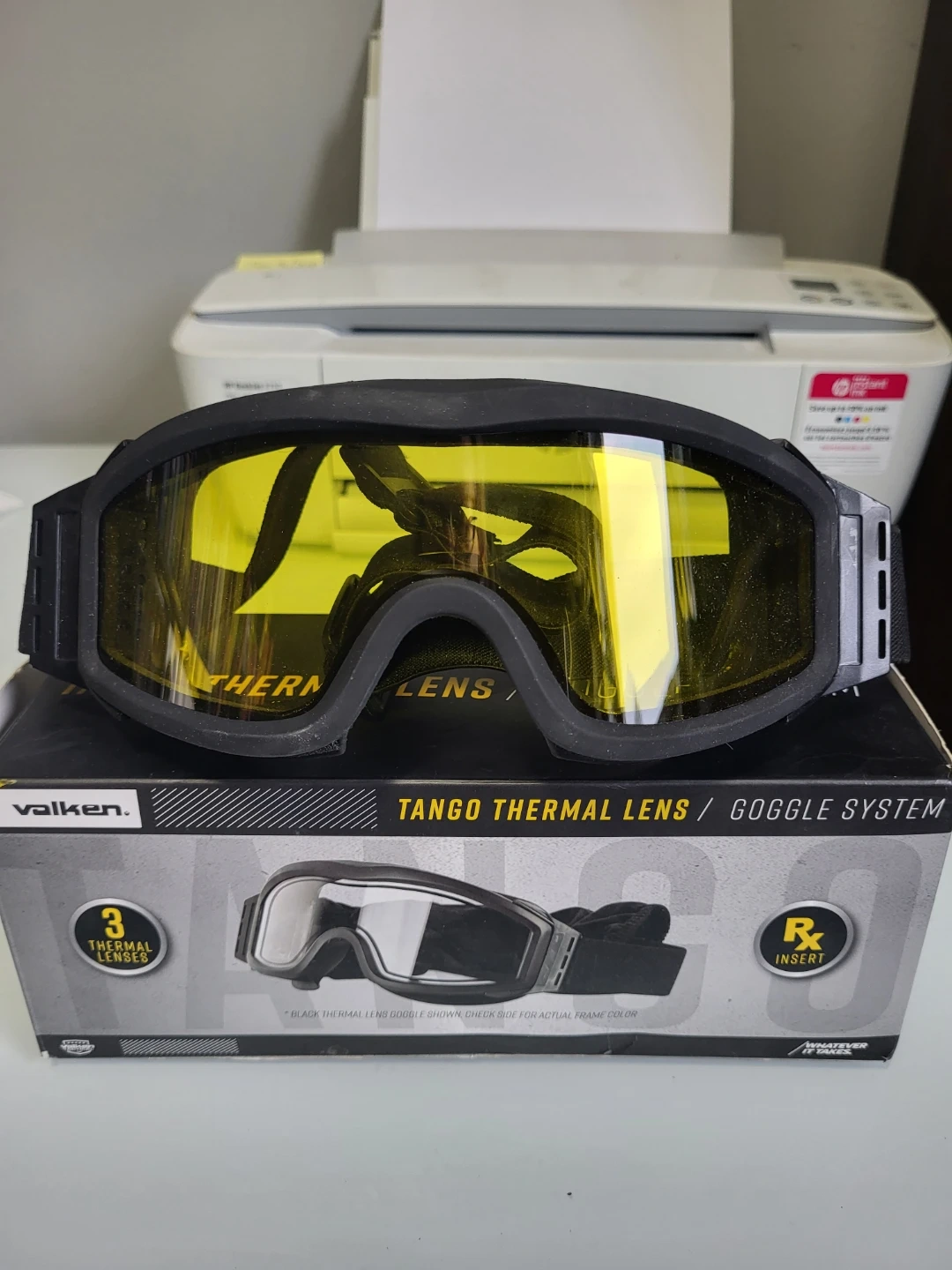 Selling a Valken Tango Thermal Lens Goggle System! It comes with three thermal lenses: clear, yellow, and gray. Also included is a carrying bag with a spare lens pocket. The lenses are multi-coated and anti-fog. The goggle system is fully sealed for eye protection and includes an adjustable strap. Box included!