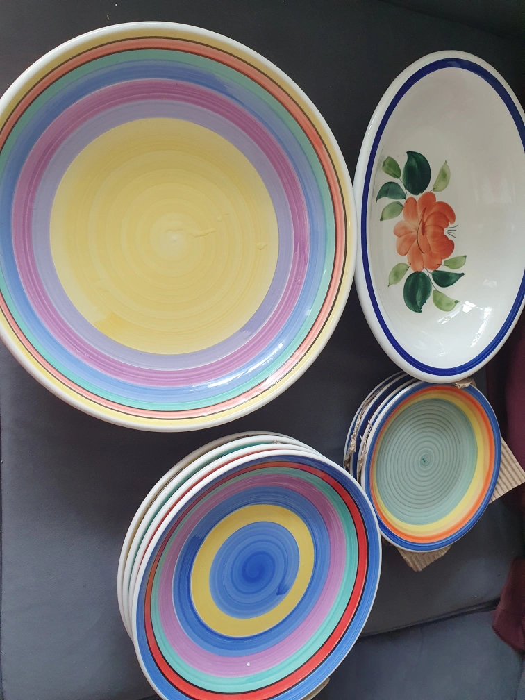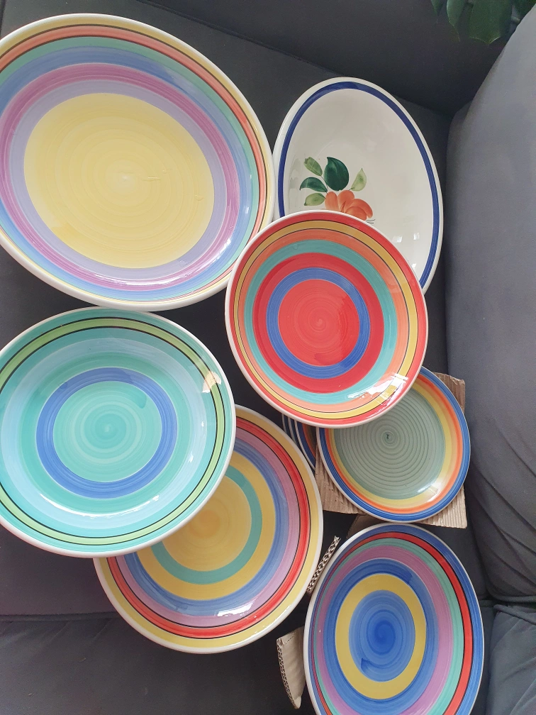 Selling a set of colourful ceramic plates! They're new set and would be perfect for adding a pop of colour to your kitchen or dining room. There's a variety of sizes, one is big, this set has different designs included in the set.