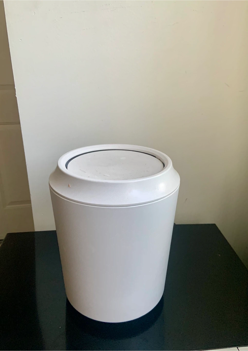 Selling a white trash can. It's in great shape and ready to use! It measures about 11 inches tall and 9 inches in diameter