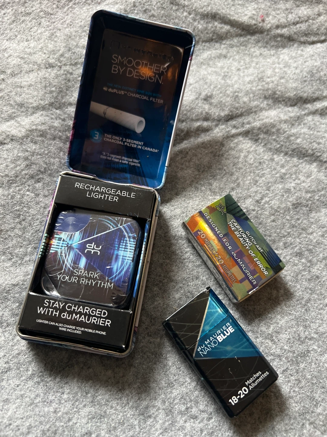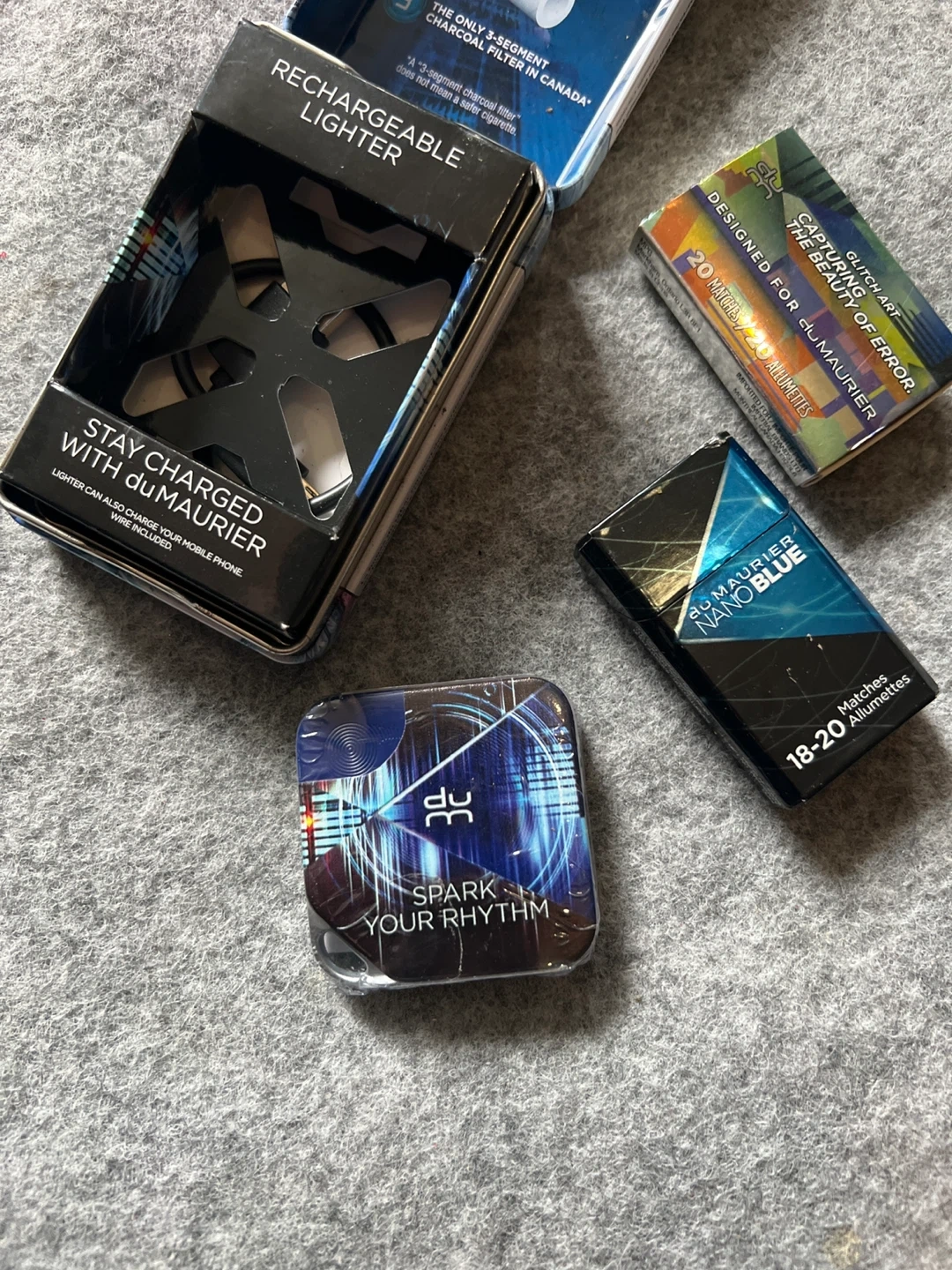 Selling a du Maurier rechargeable lighter that can also charge your mobile phone. Also included are du Maurier matches.
