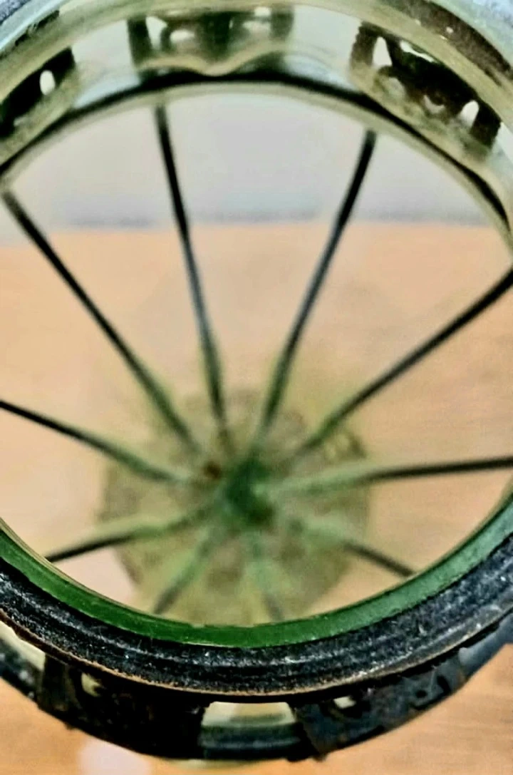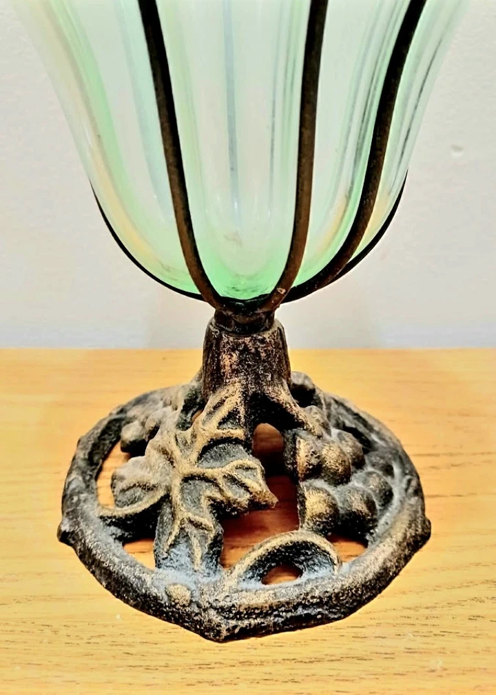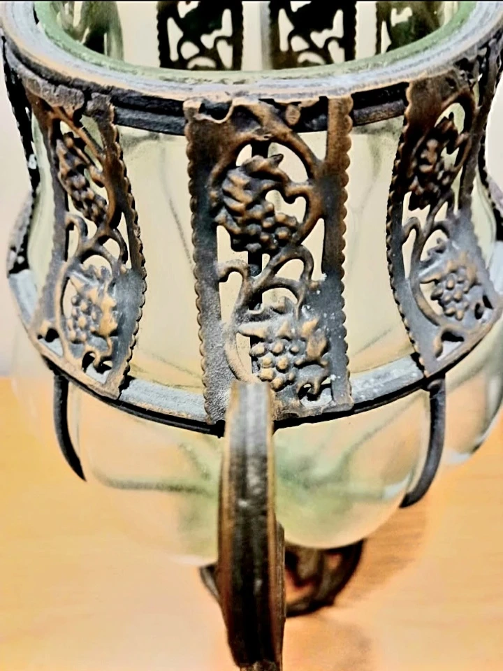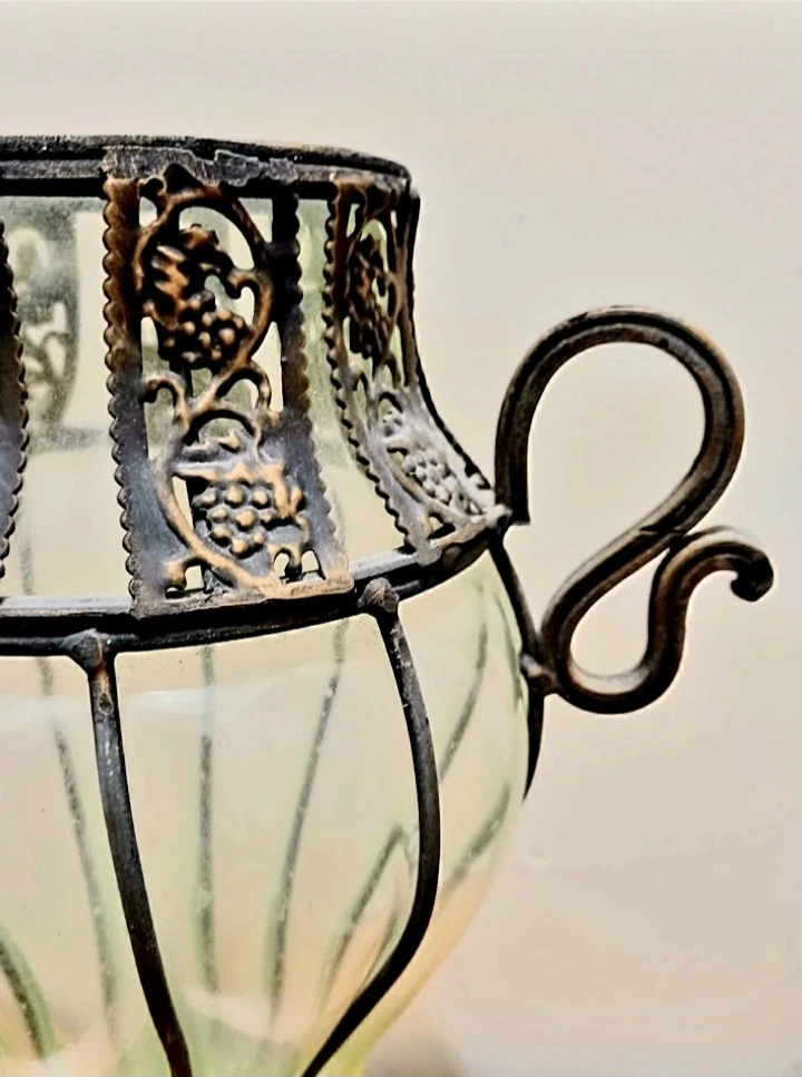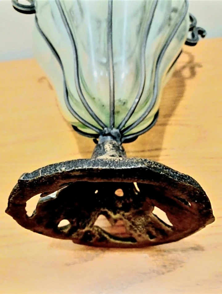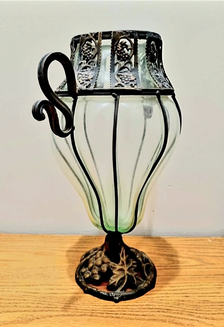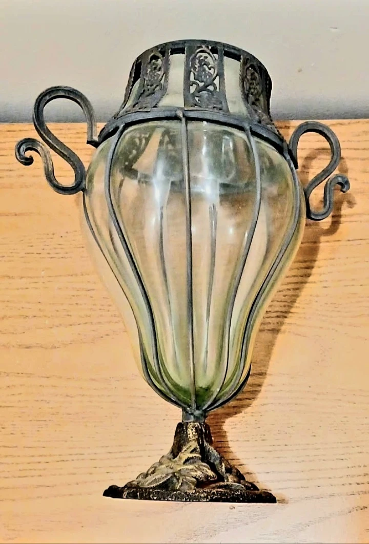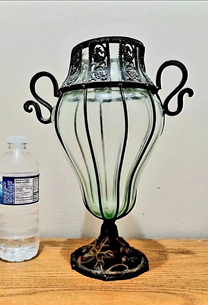 Unique, antique, stunning Victorian Hand-forged wrought iron vase that showcases exquisite craftsmanship. This piece features a Mouth Blown Glass Vase nestled within an ornate iron frame, complete with decorative handles and a detailed base.