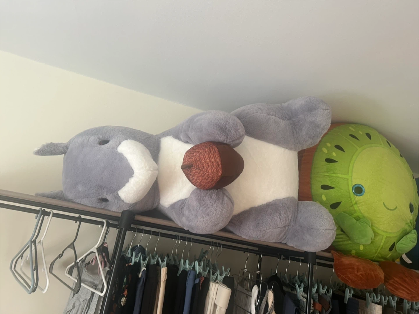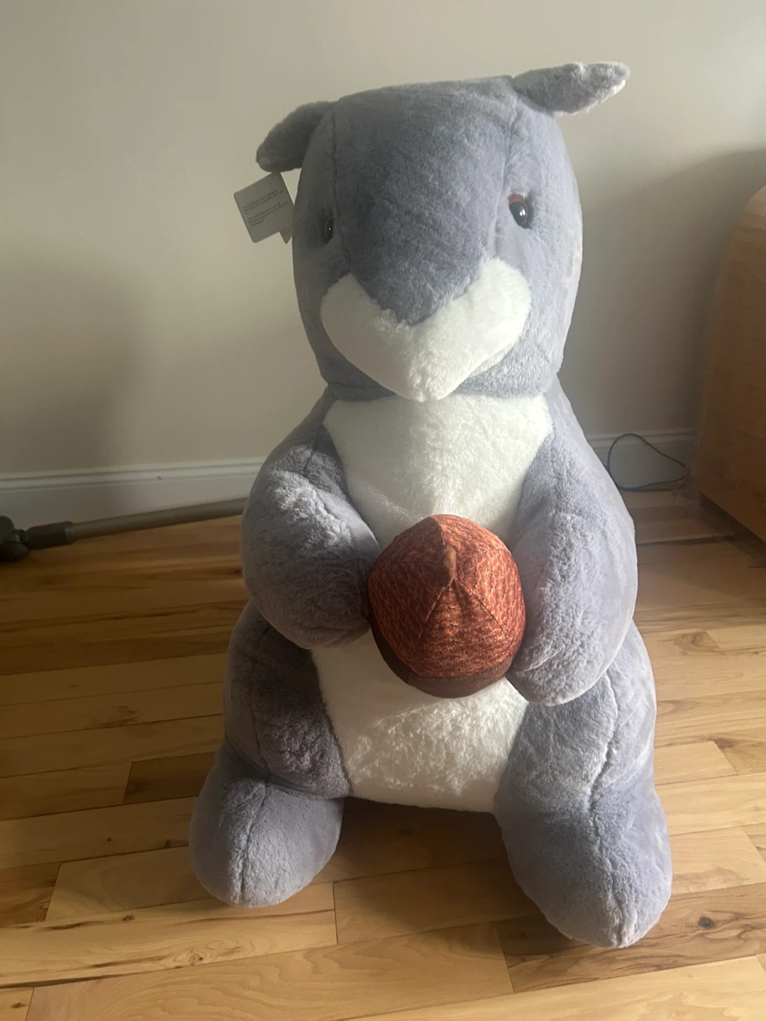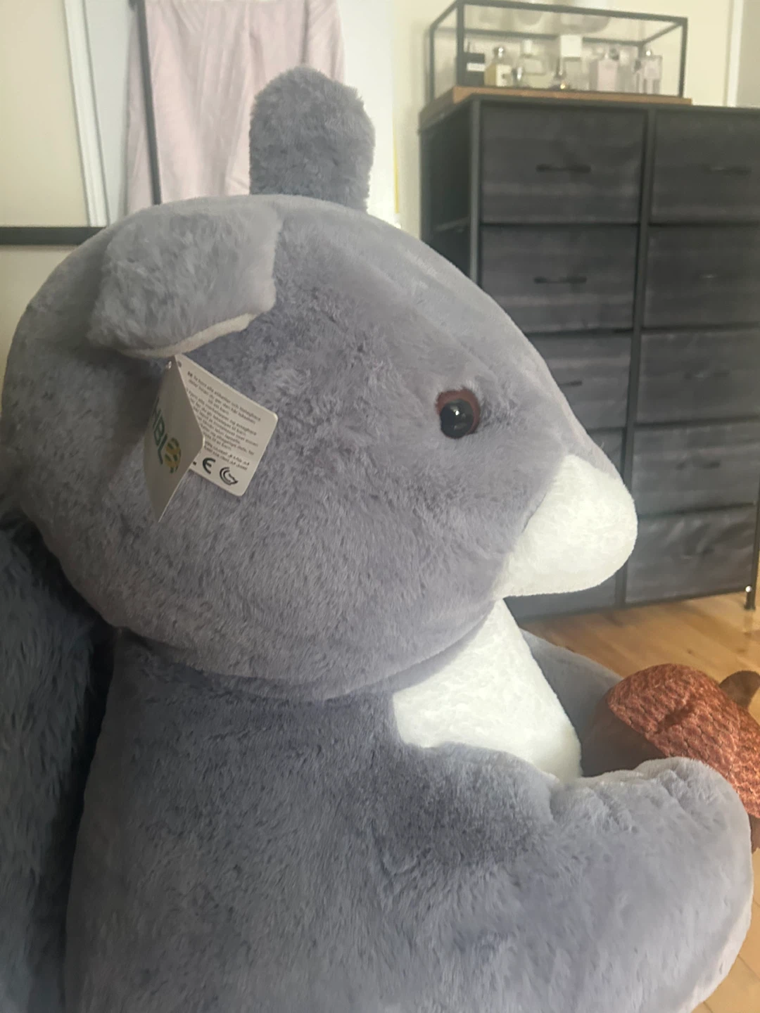 Selling a large, gray BBJ squirrel plush toy. It's in great condition and comes with a cute acorn accessory. Perfect for kids or anyone who loves cuddly toys!
