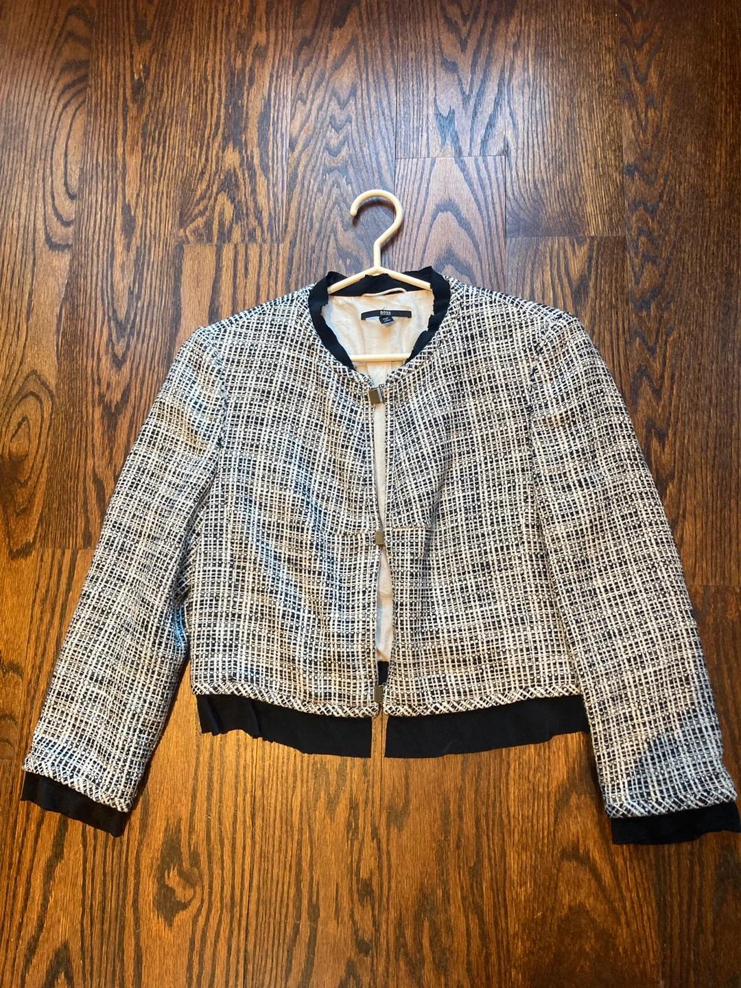 Very chic women’s blazer/jacket. Black & white tweed design with brass closures and silk trim. Size 40 Euro or 8 US. Can also fit a size 6 nicely. This exact item is currently listed on Poshmark for $250.