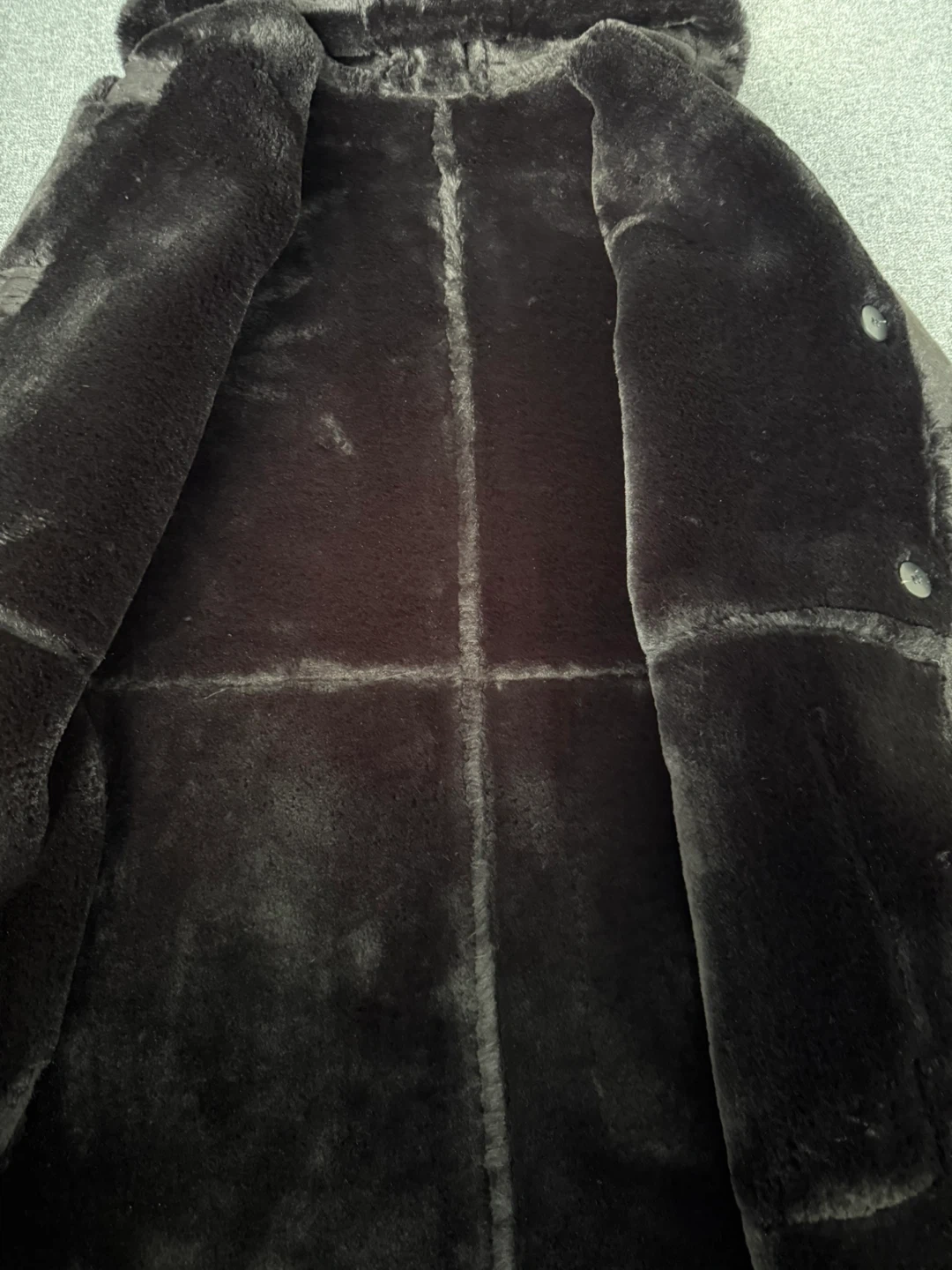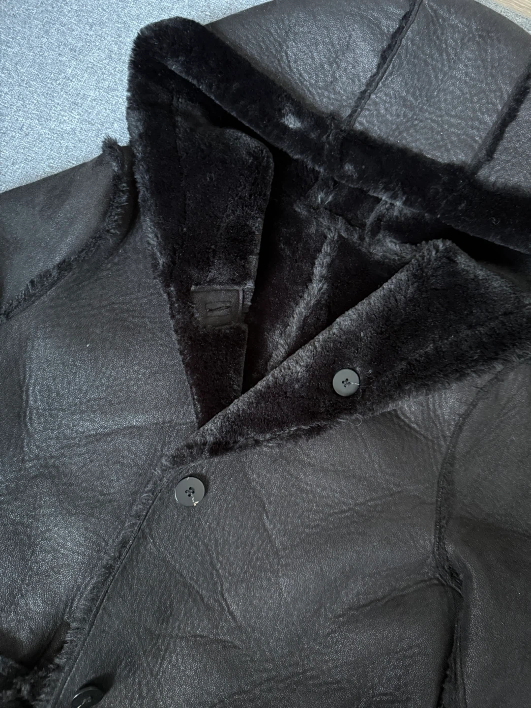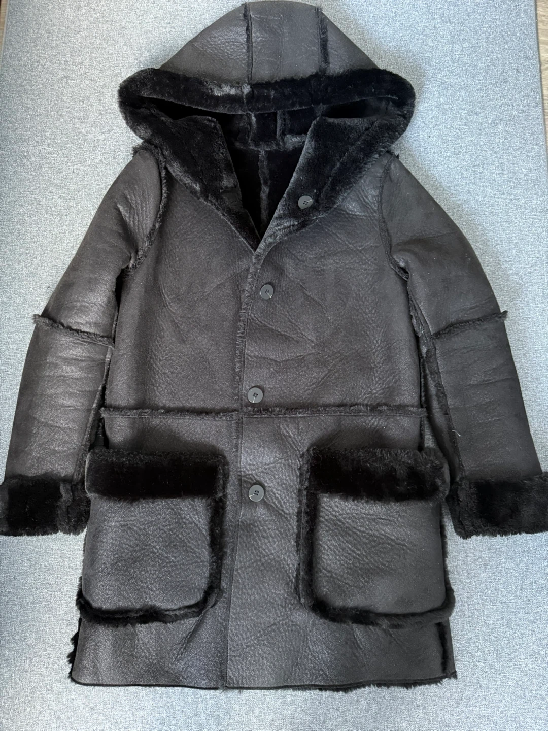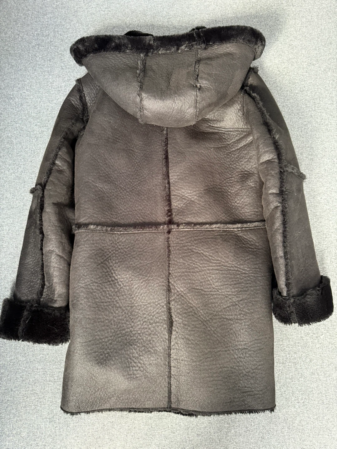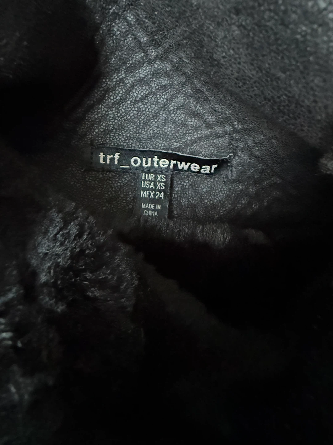 Here's a Zara TRF outerwear coat in size XS. It's a stylish black coat with a hood and faux fur trim. Perfect for keeping warm this winter!