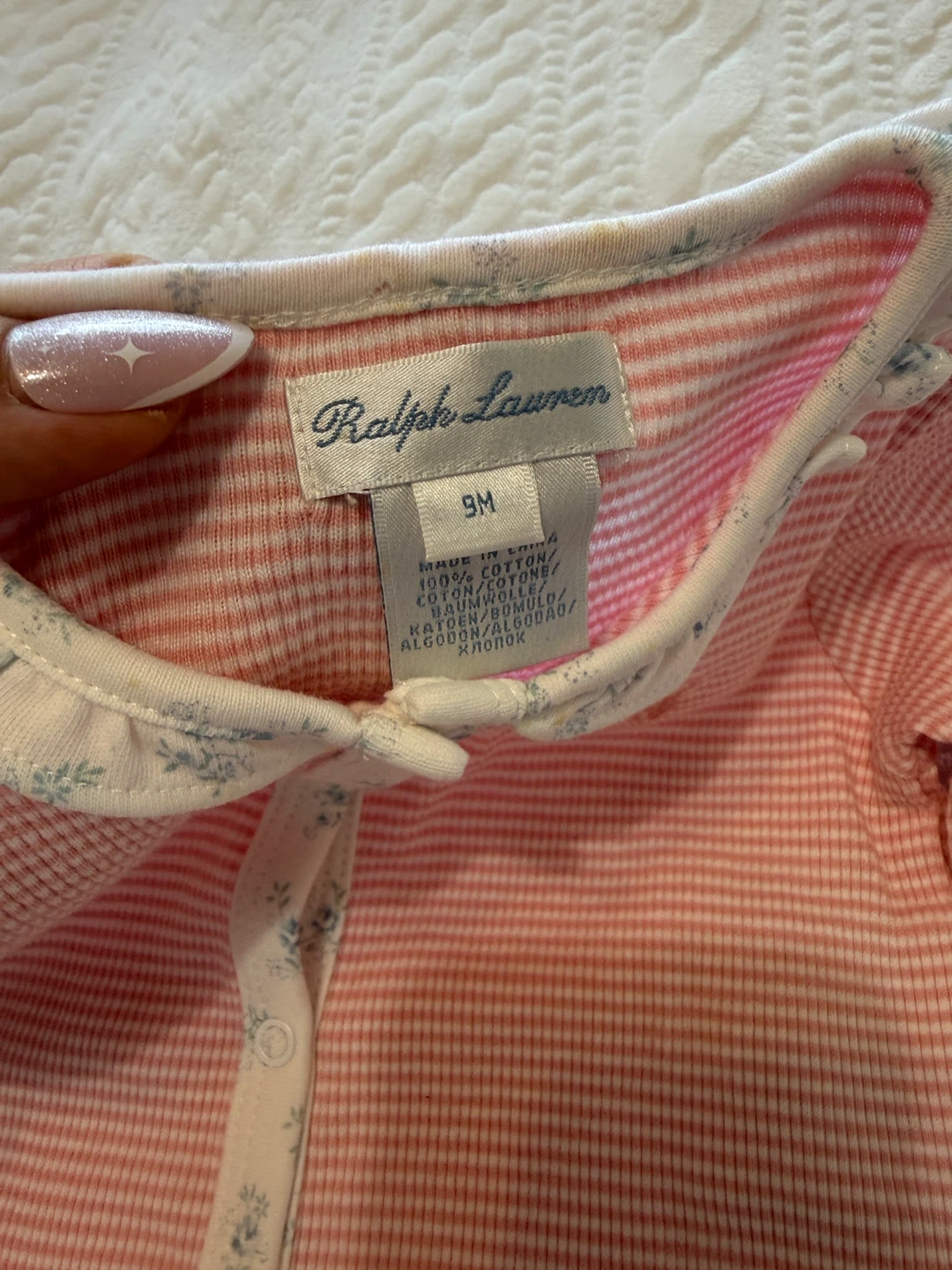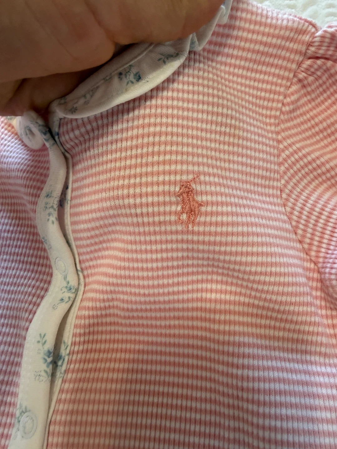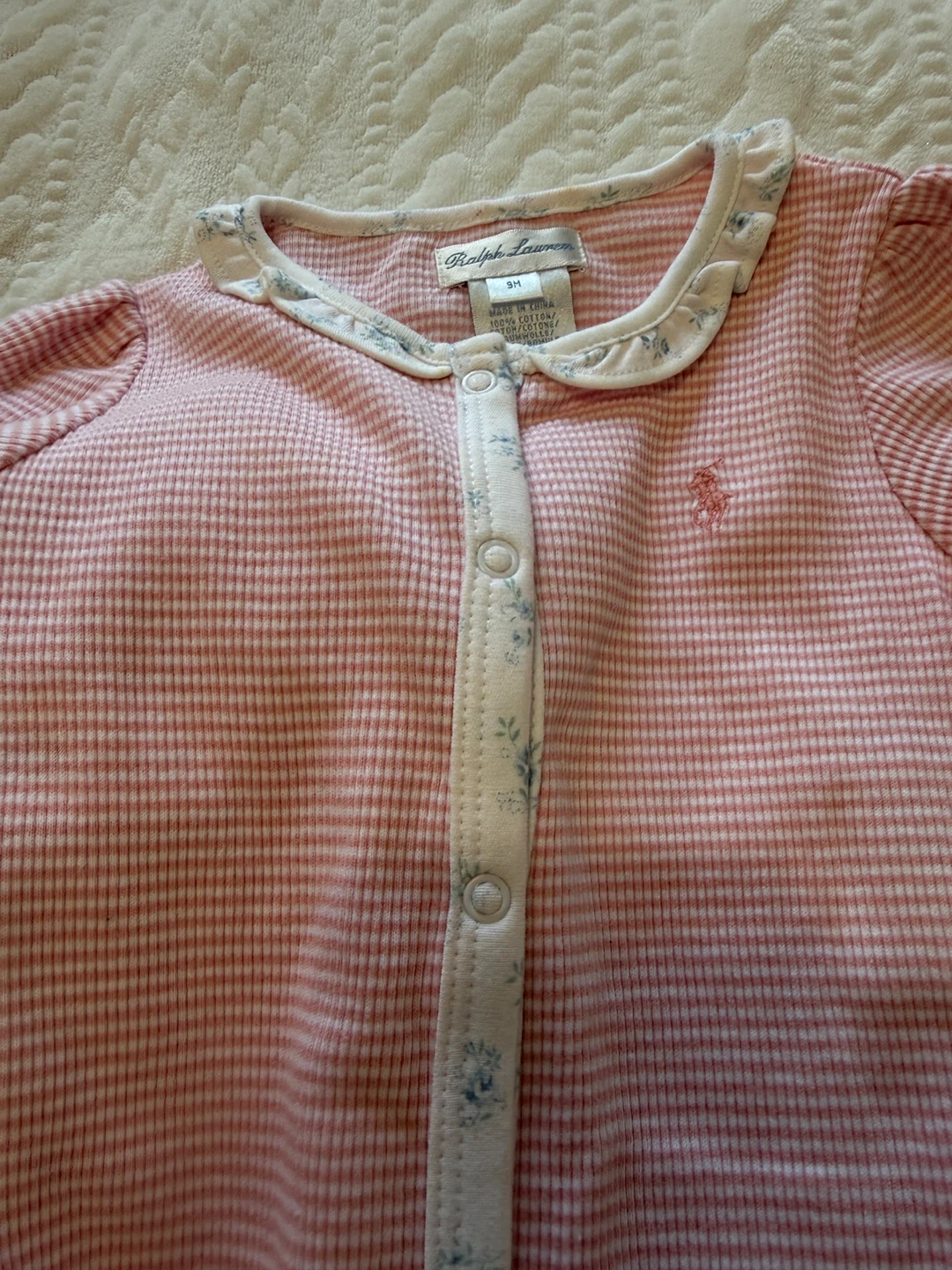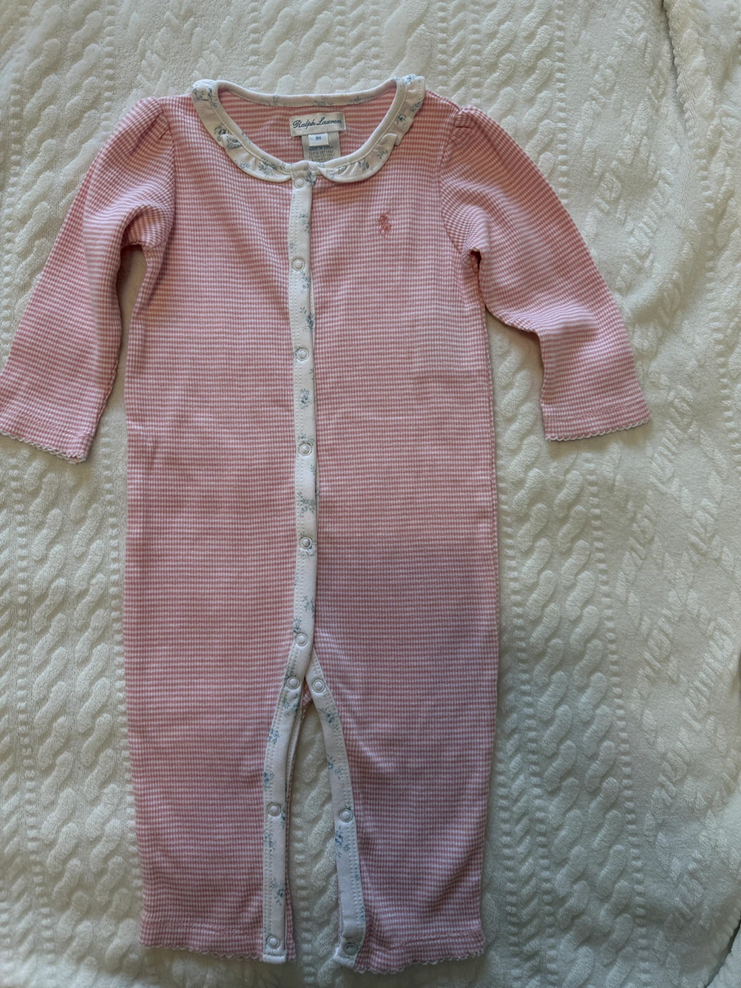 A sweet Ralph Lauren baby romper in size 9M. It features a pink and white striped pattern with a cute floral trim along the collar and button placket. Perfect for your little one!