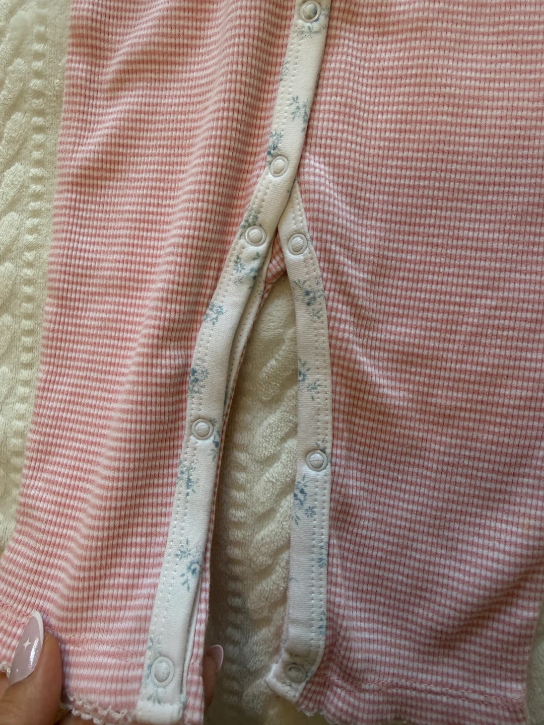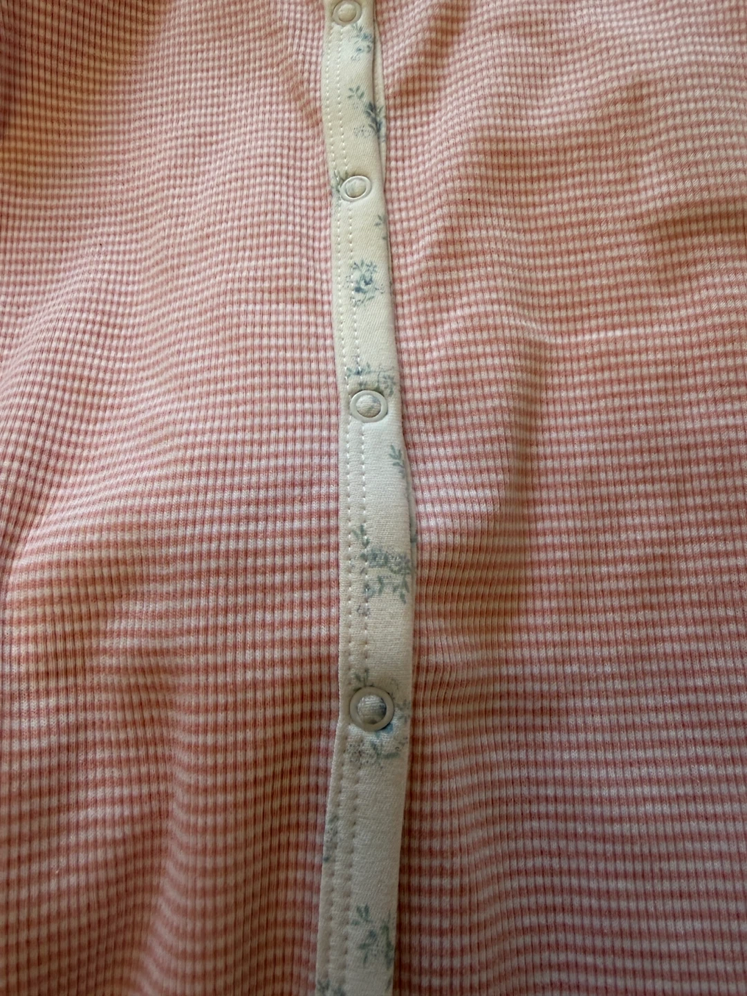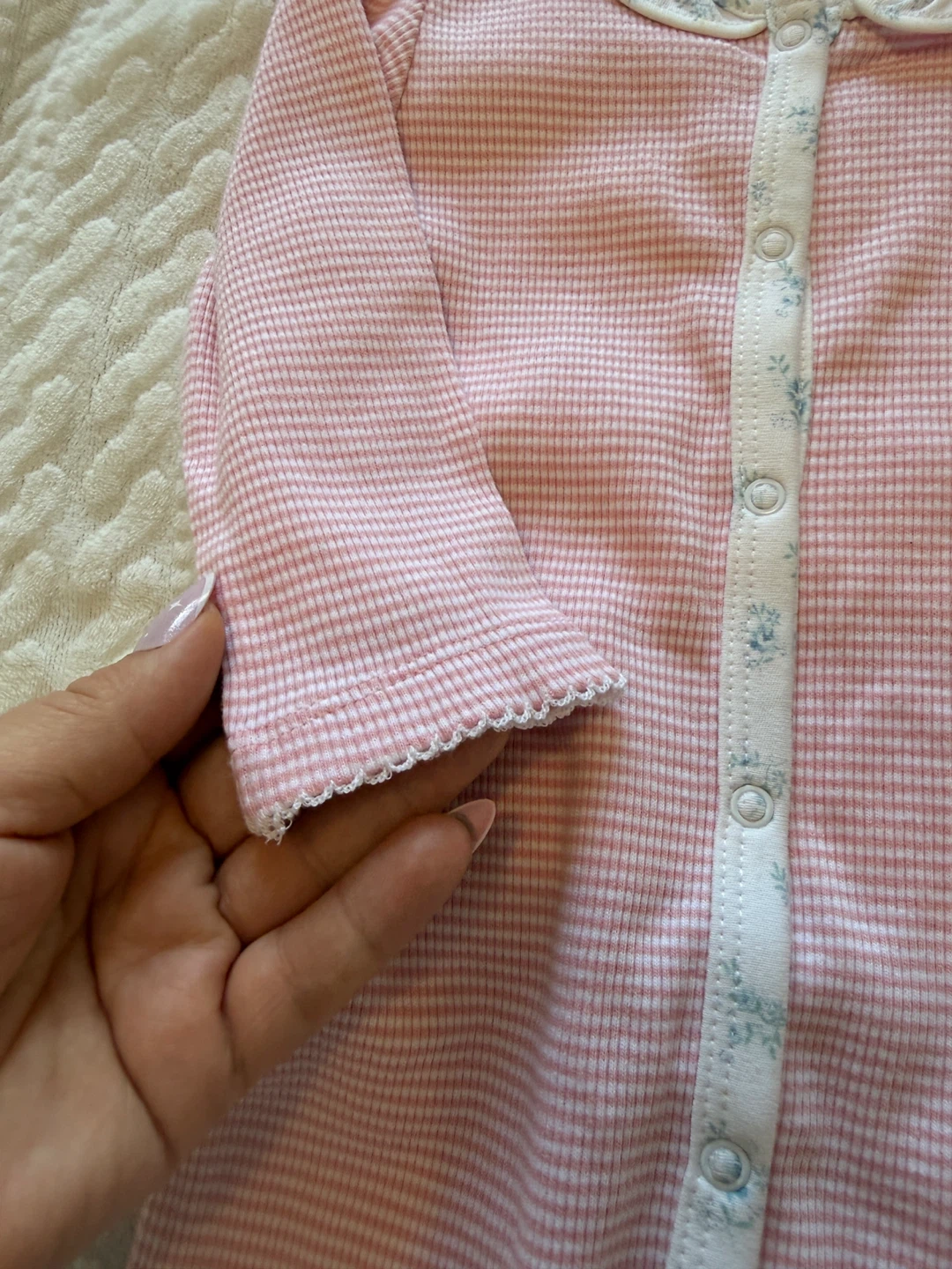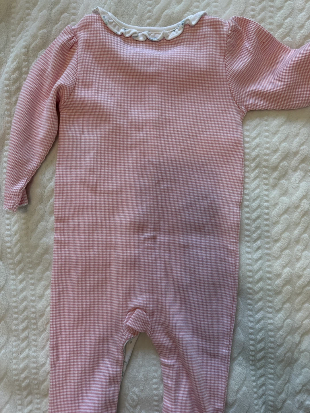 A sweet Ralph Lauren baby romper in size 9M. It features a pink and white striped pattern with a cute floral trim along the collar and button placket. Perfect for your little one!