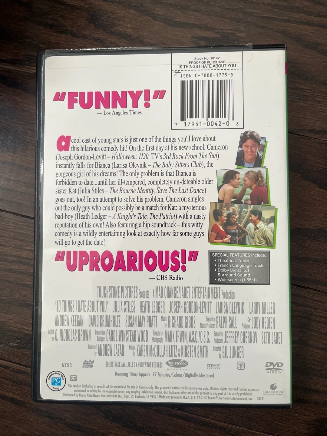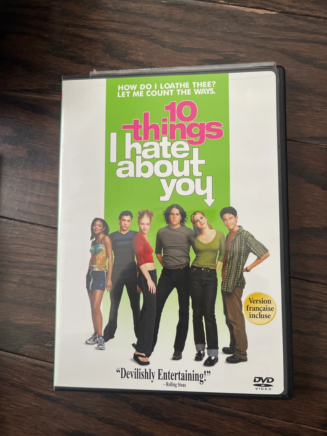 Selling the DVD of '10 Things I Hate About You'! A classic movie for anyone's collection. It's a hilarious and cool story about young love. The DVD includes special features like the theatrical trailer and French language track