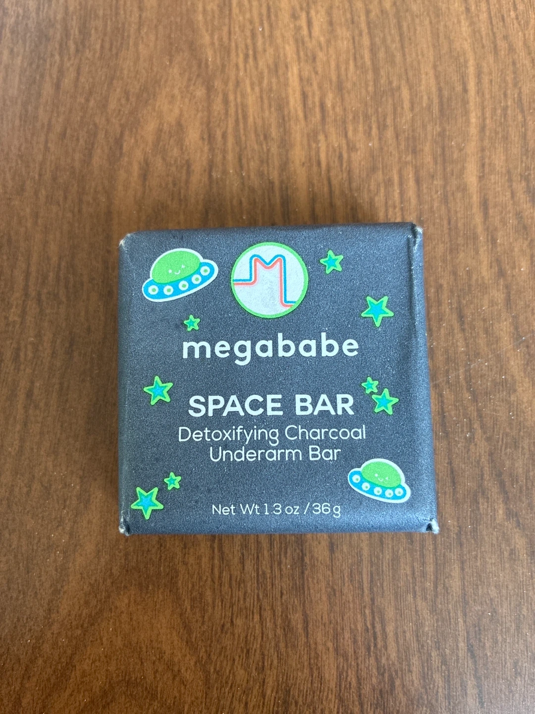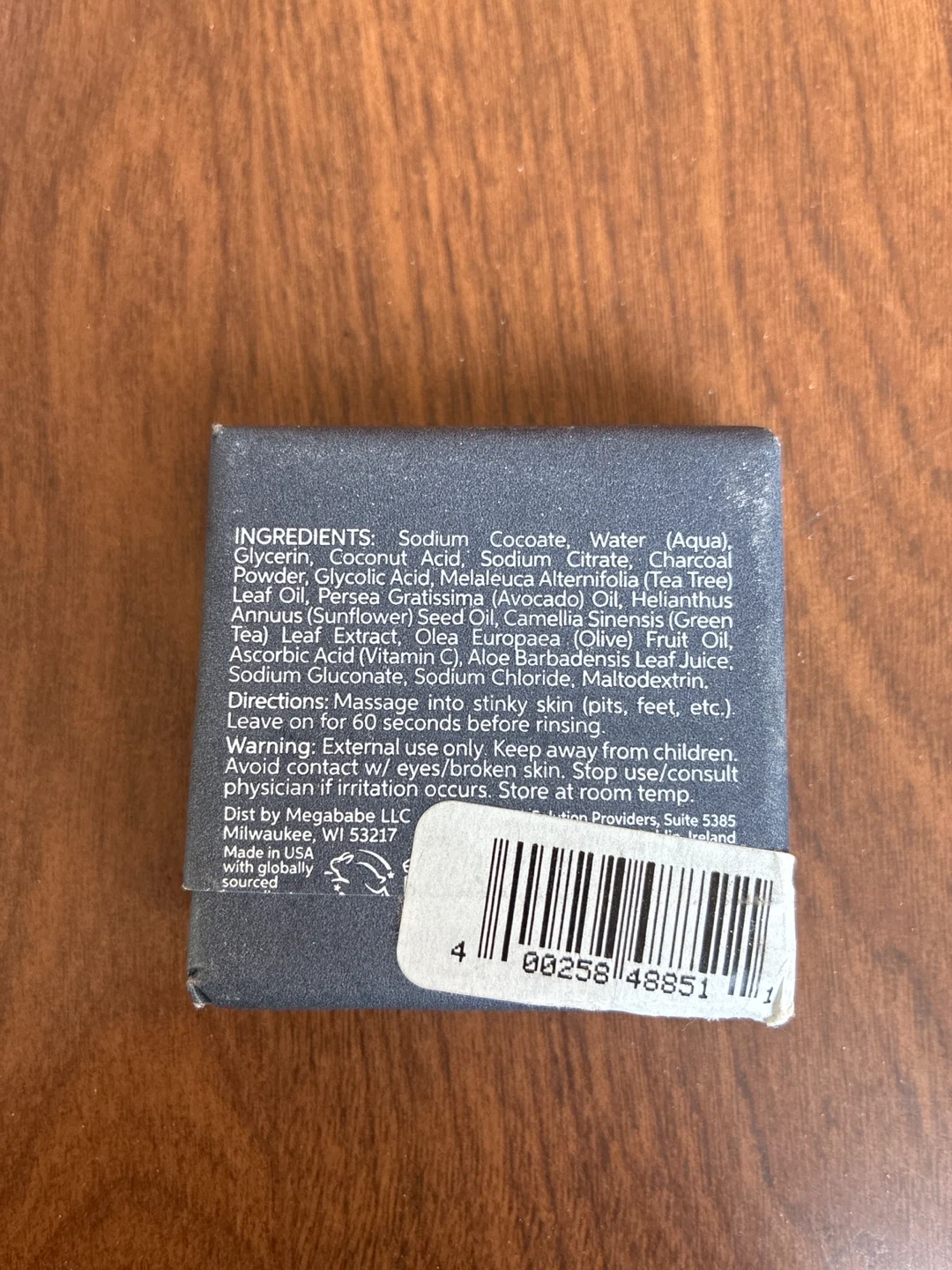 Selling a Megababe Space Bar Detoxifying Charcoal Underarm Bar. It's a net wt 1.3 oz / 36 g bar. It is made in USA with globally sourced ingredients. Massage into stinky skin (pits, feet, etc.) and leave on for 60 seconds before rinsing