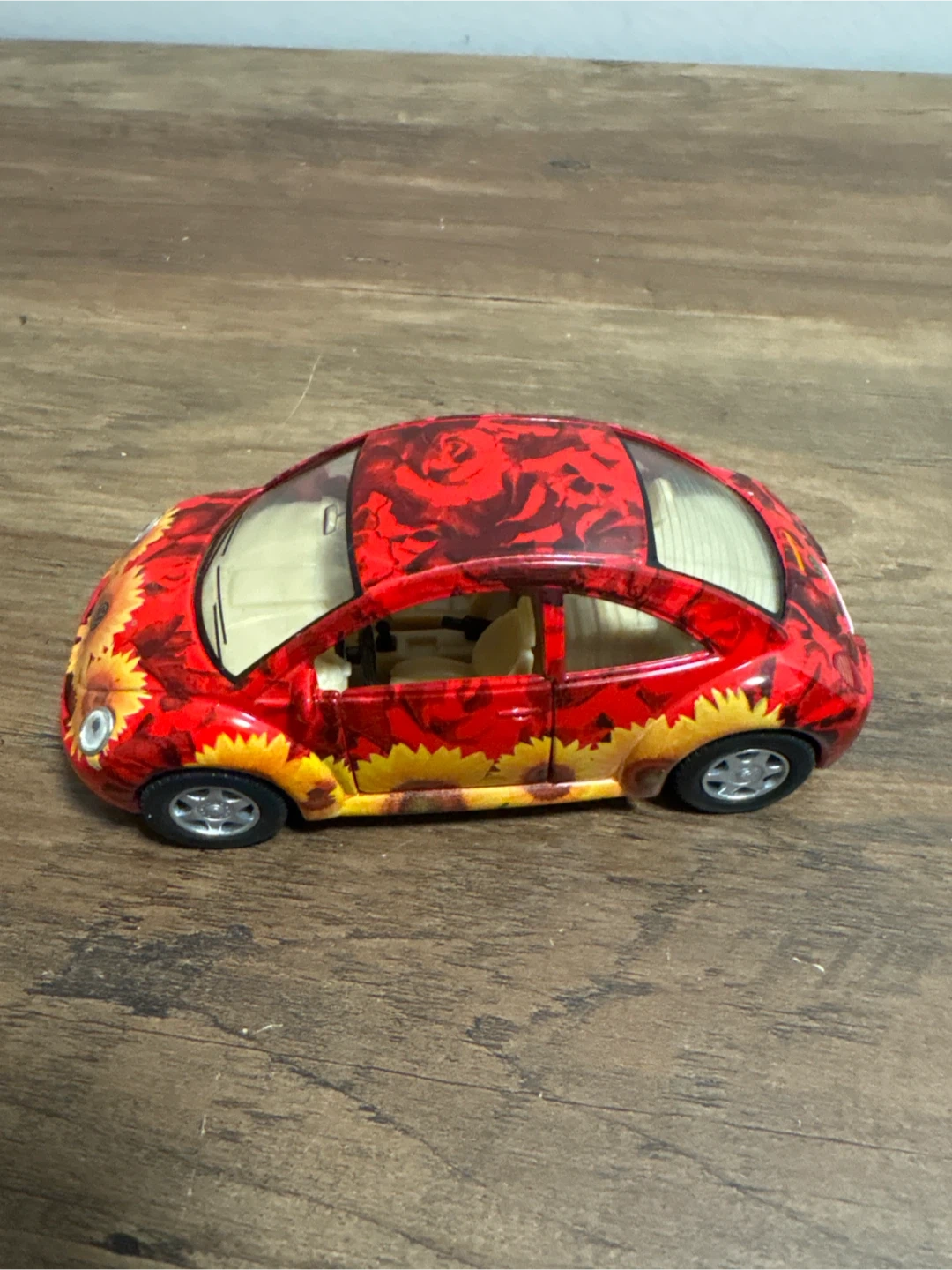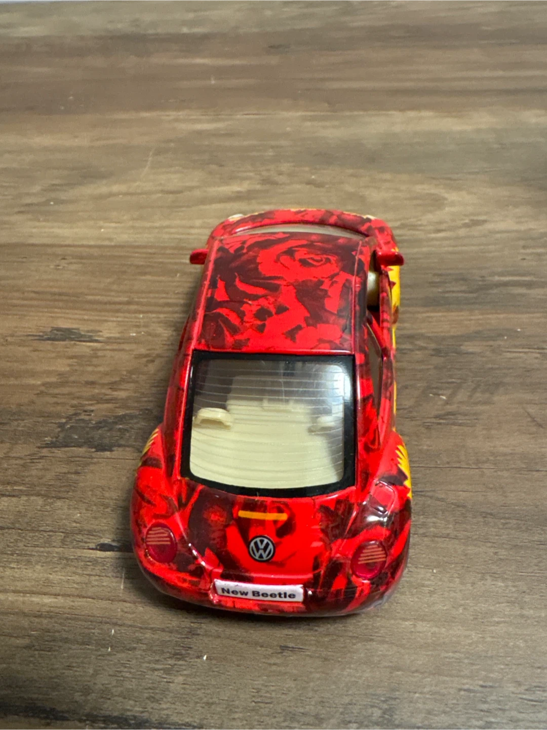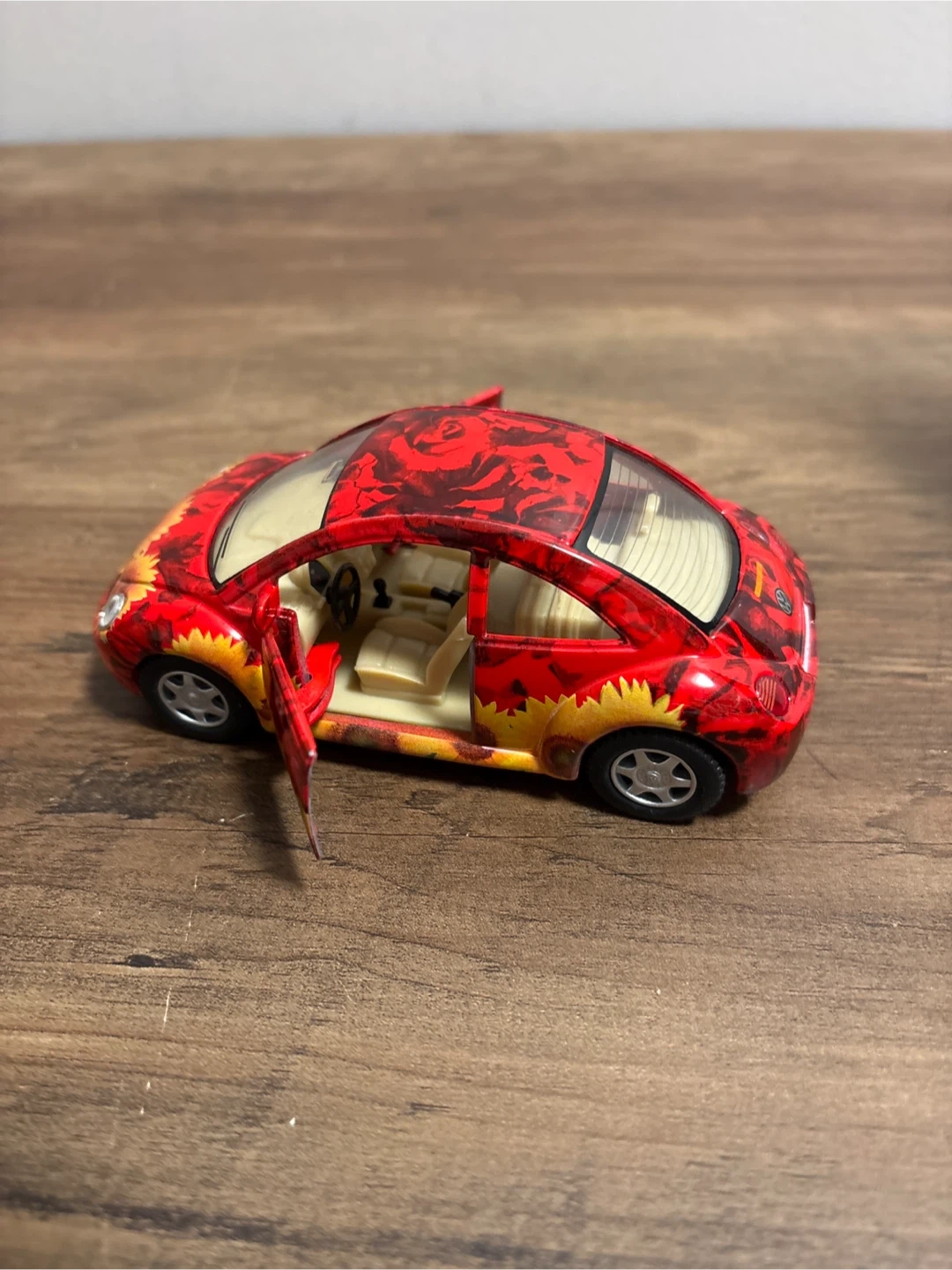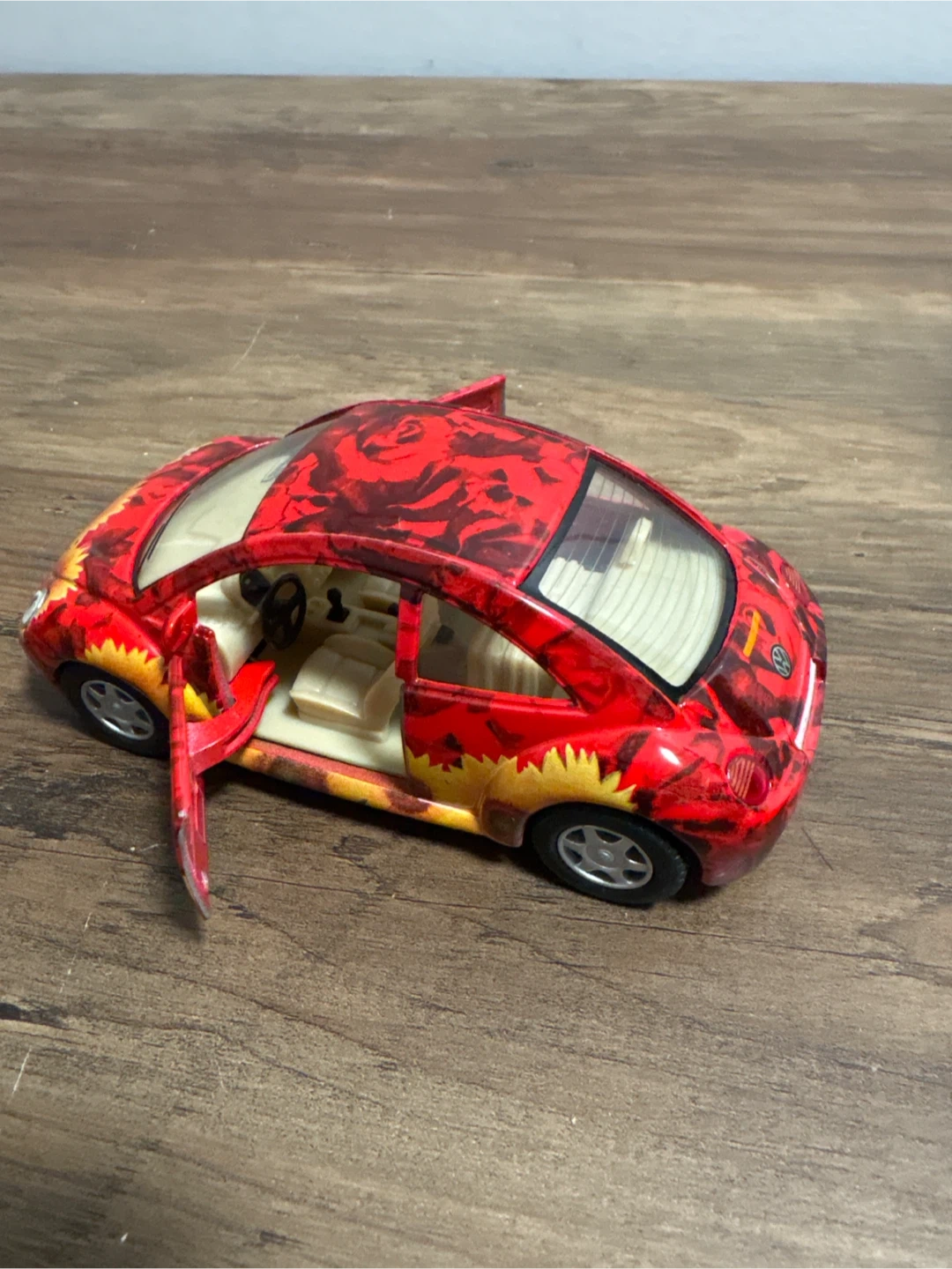 Selling a red Volkswagen New Beetle toy car! It has a unique floral and rose design on the body. The doors can also open, making it a fun collectible item!