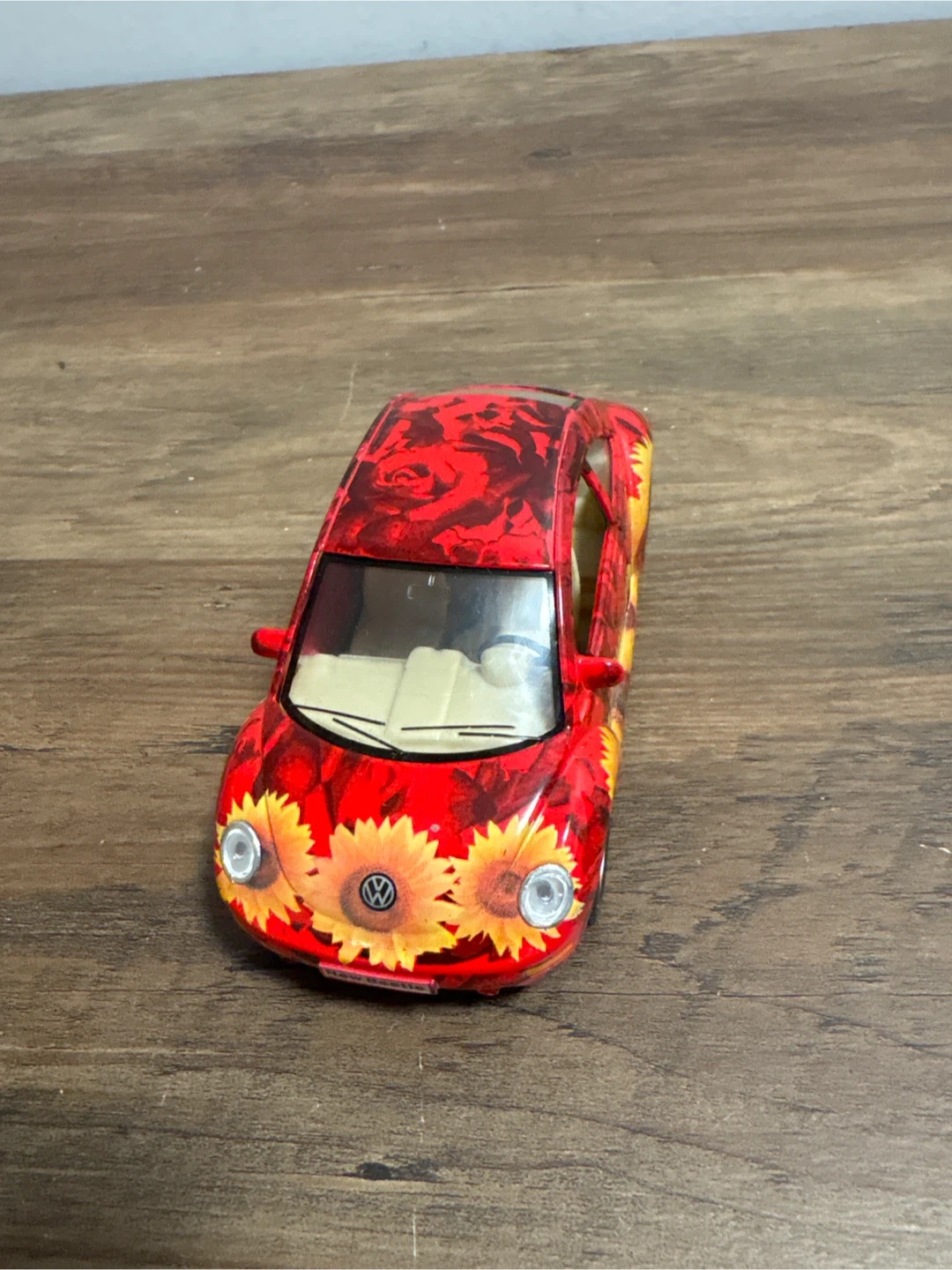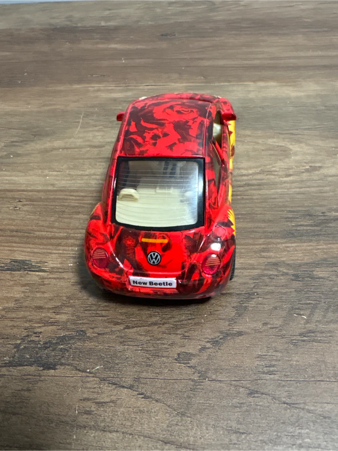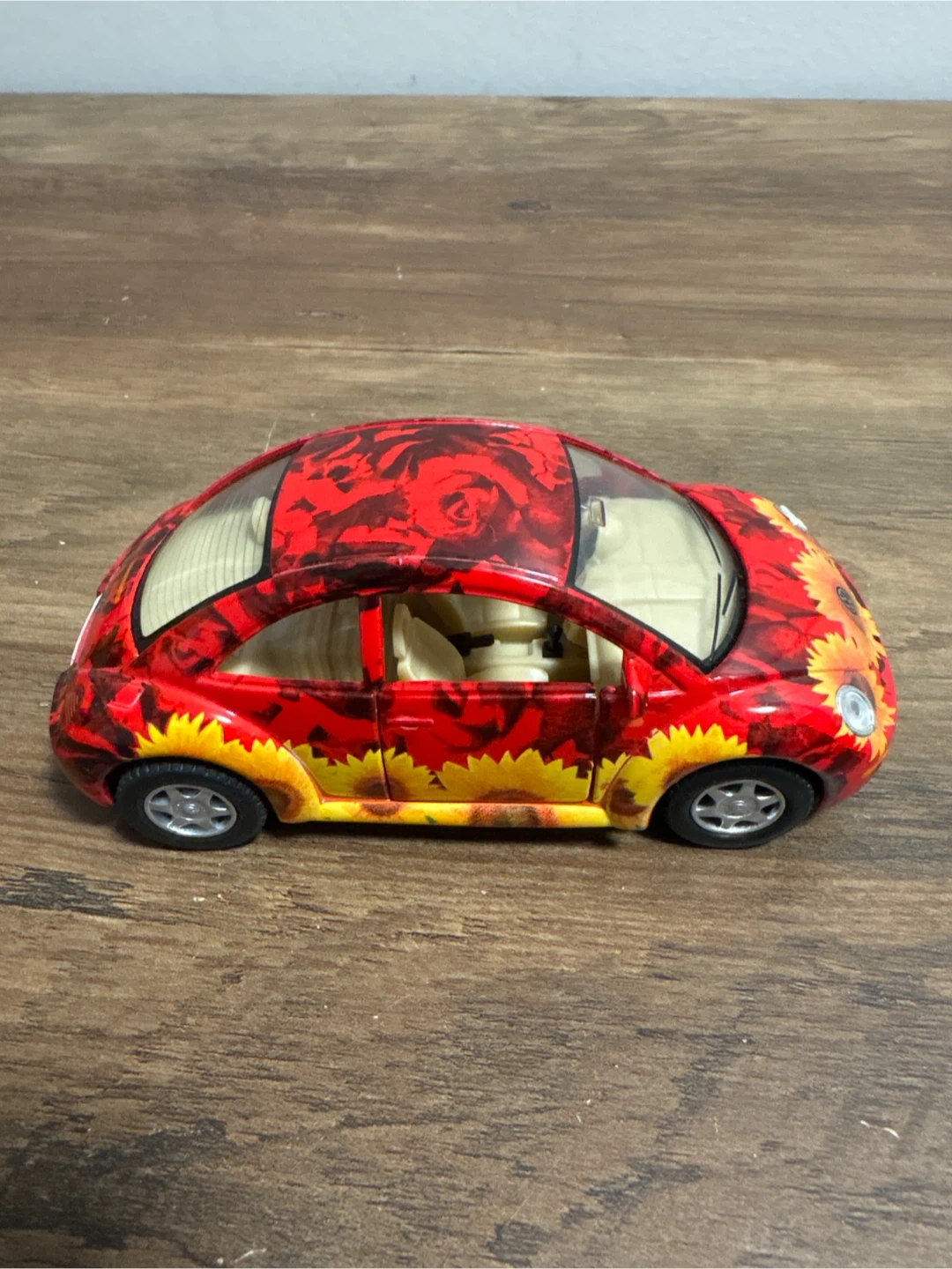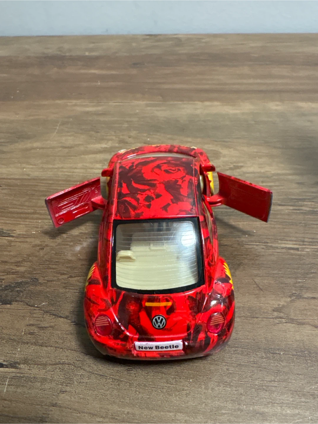 Selling a red Volkswagen New Beetle toy car! It has a unique floral and rose design on the body. The doors can also open, making it a fun collectible item!