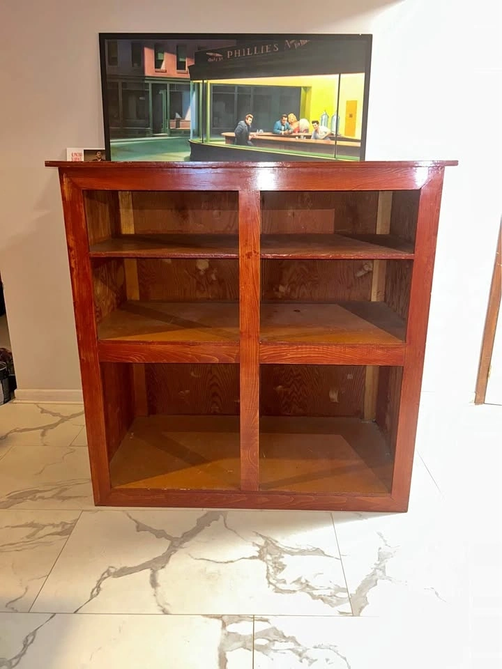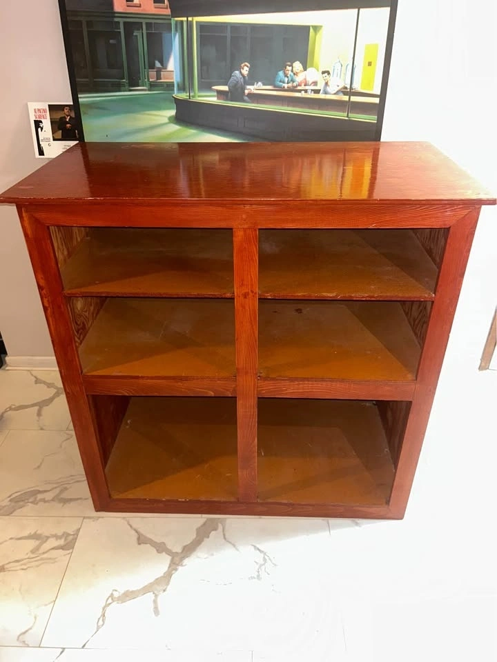 Large, solid wood shelving unit in great structural condition. This unit includes 2 large storage shelves on the bottom, 2 medium storage shelves in the middle, and 2 small storage shelves on the top.