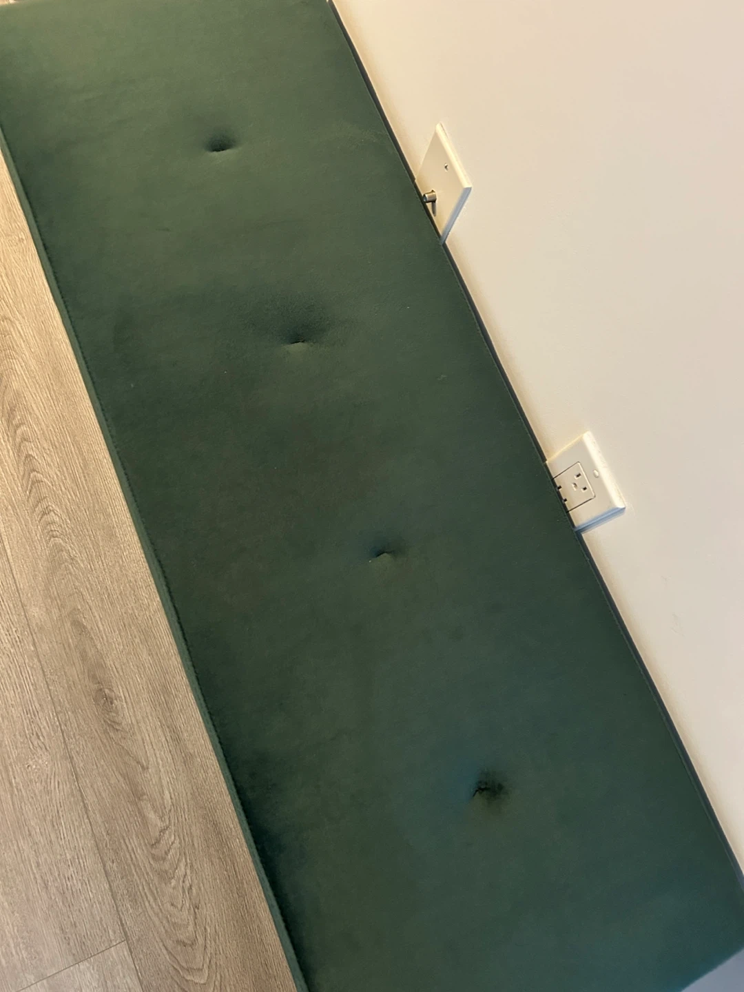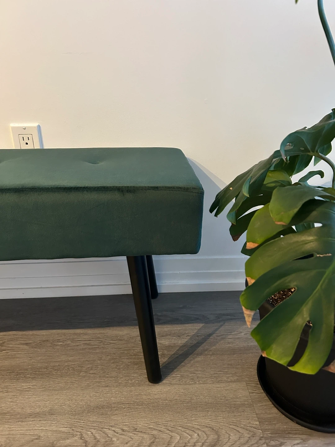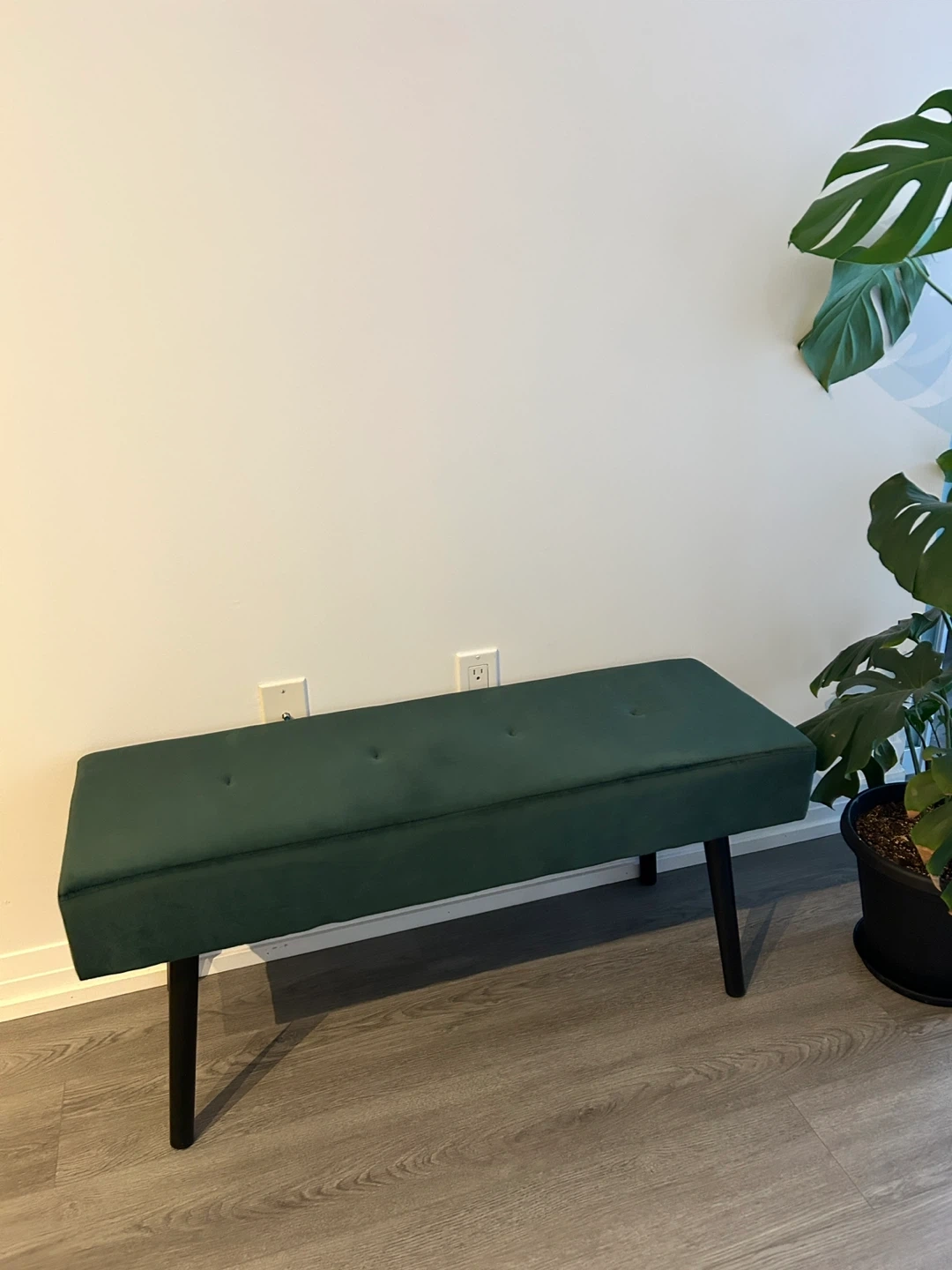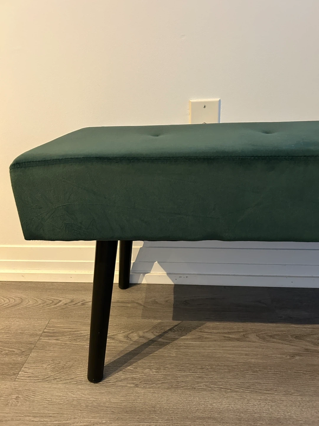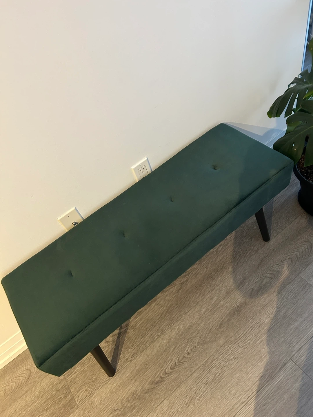 Selling a stylish green velvet bench because I’m moving. It's in great condition and would look great in any room! The bench features a plush velvet top with button tufting.