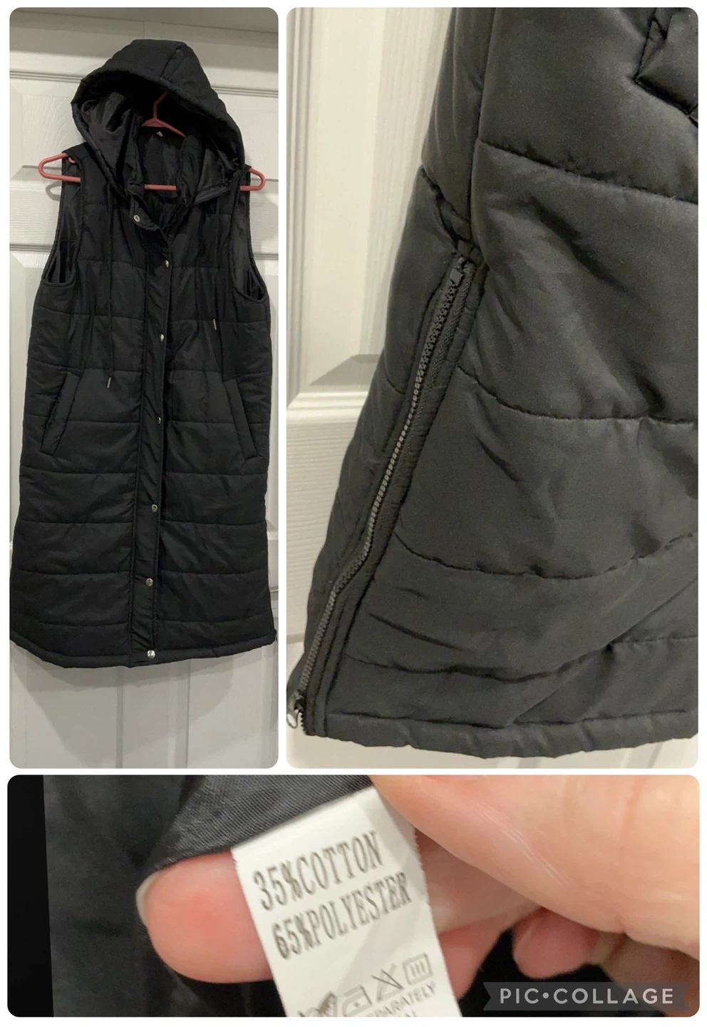 Here's a black puffer vest with a hood! It's made of 35% cotton and 65% polyester, so it's nice and comfy. Perfect for layering during those chilly days!