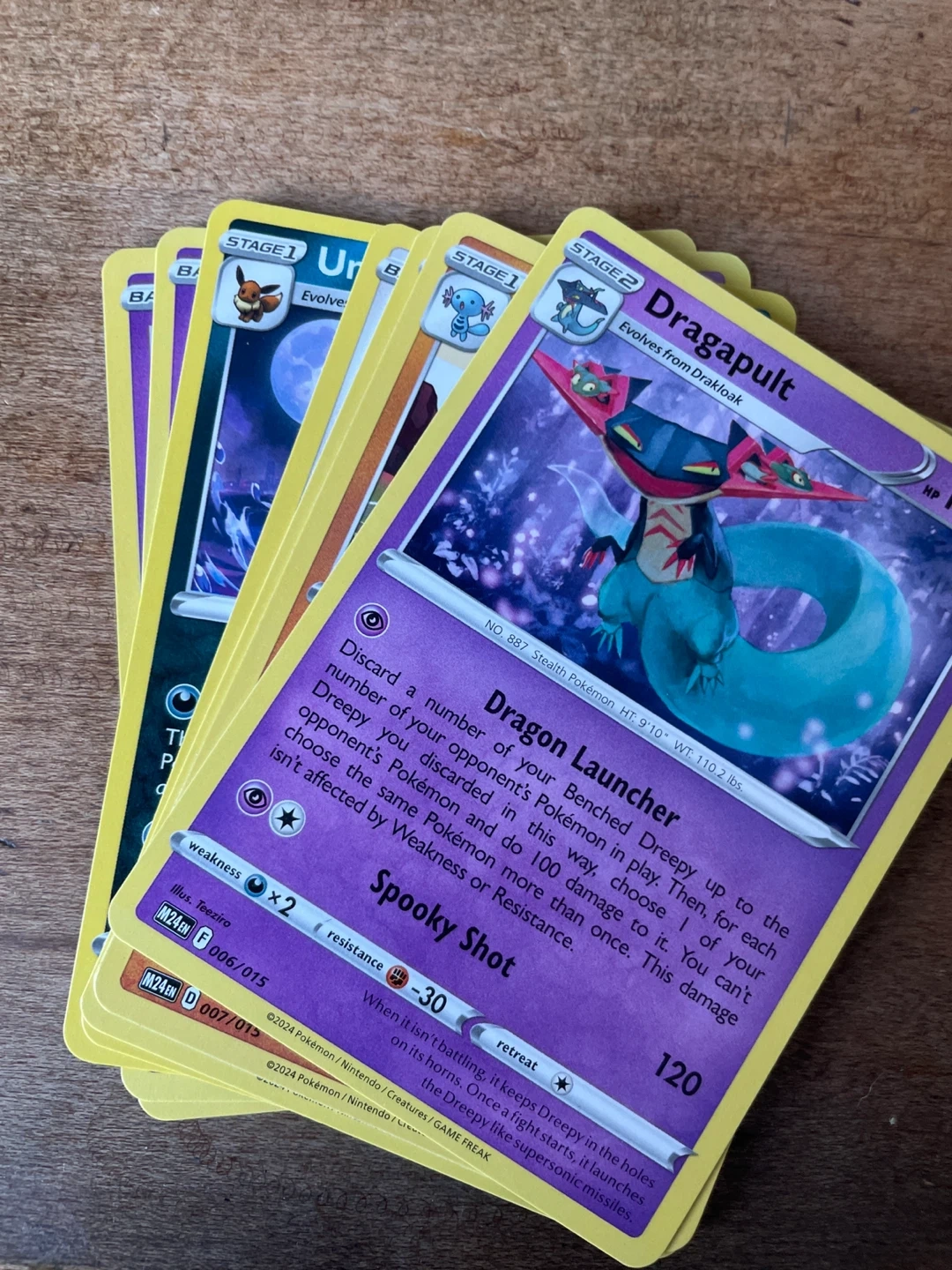 Selling a collection of Pokémon cards, including some rare finds like Dragapult and Charizard! Also included is a Happy Meal box featuring Umbreon and some stickers. Great for any Pokémon fan or collector