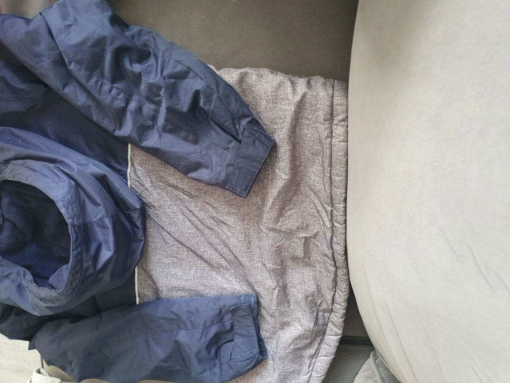 Here's a warm winter jacket in navy, orange and grey. It's in good condition and ready for some winter fun!