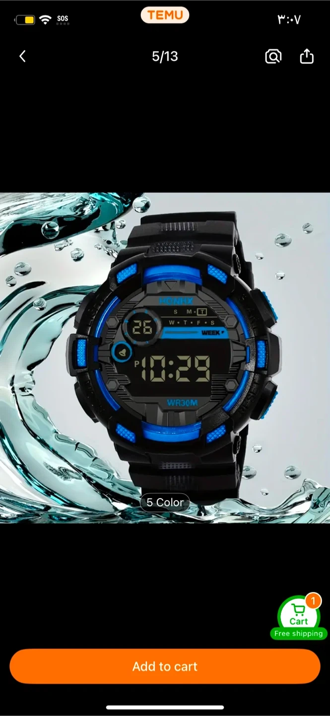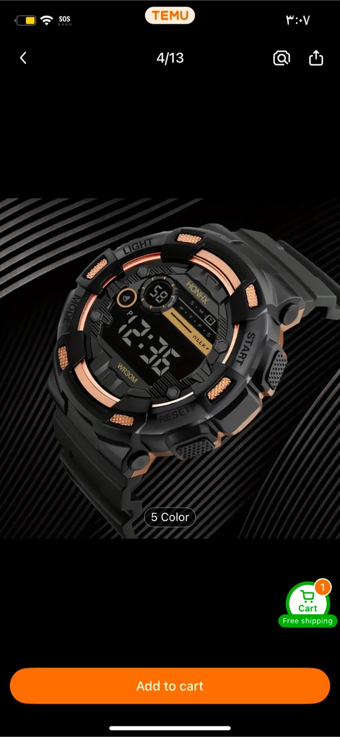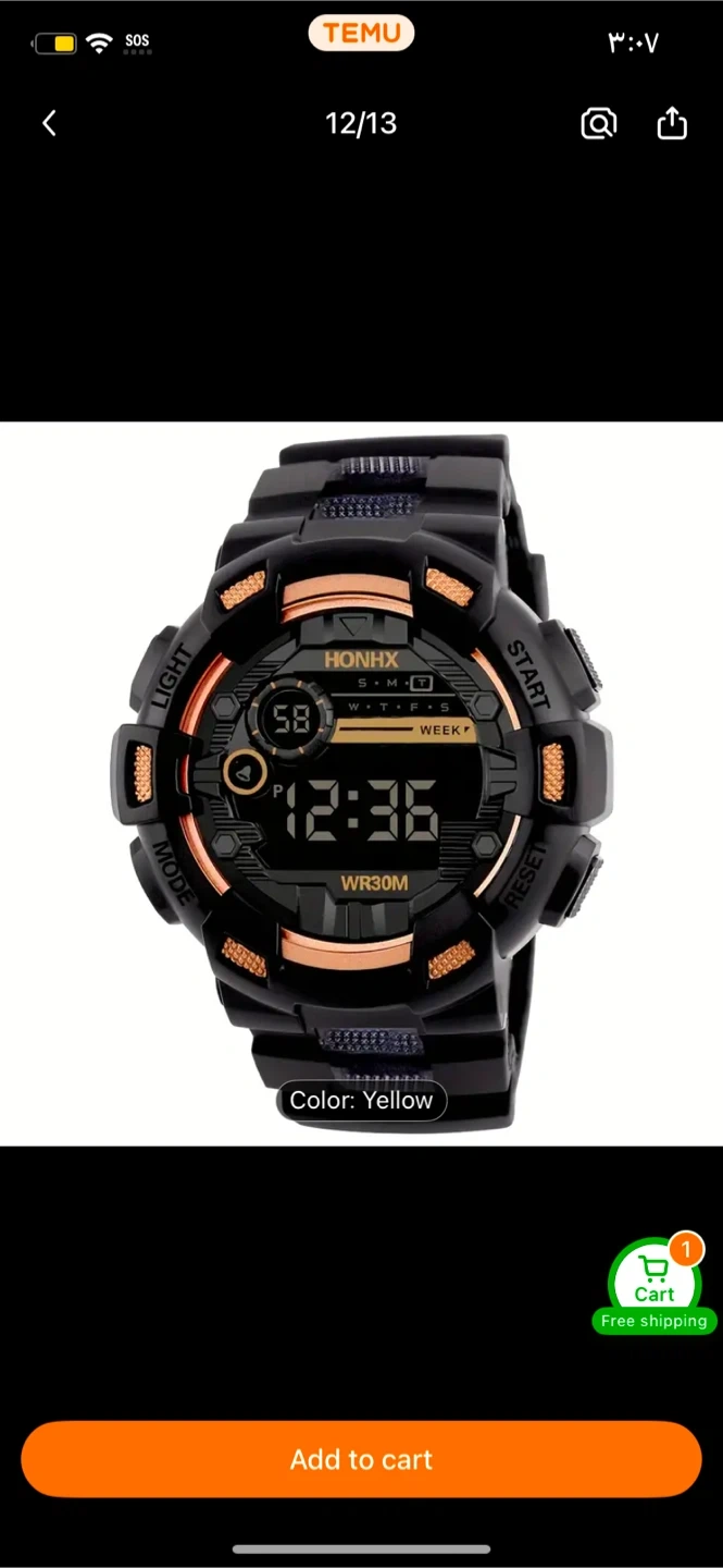 Selling a HONHX digital sports watch. It features a digital display and is water-resistant to 30m. The watch has a black band with yellow accents.