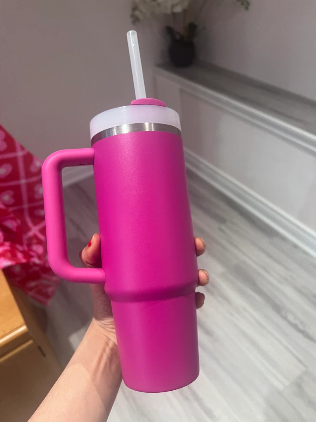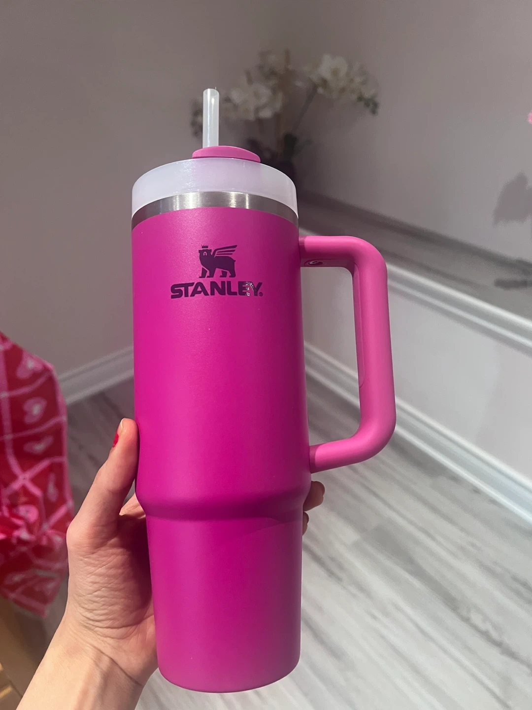 I'm selling a Stanley Quencher H2.0 FlowState Tumbler in pink. It holds 30oz/887mL. This tumbler is perfect for keeping your drinks cold or hot on the go!