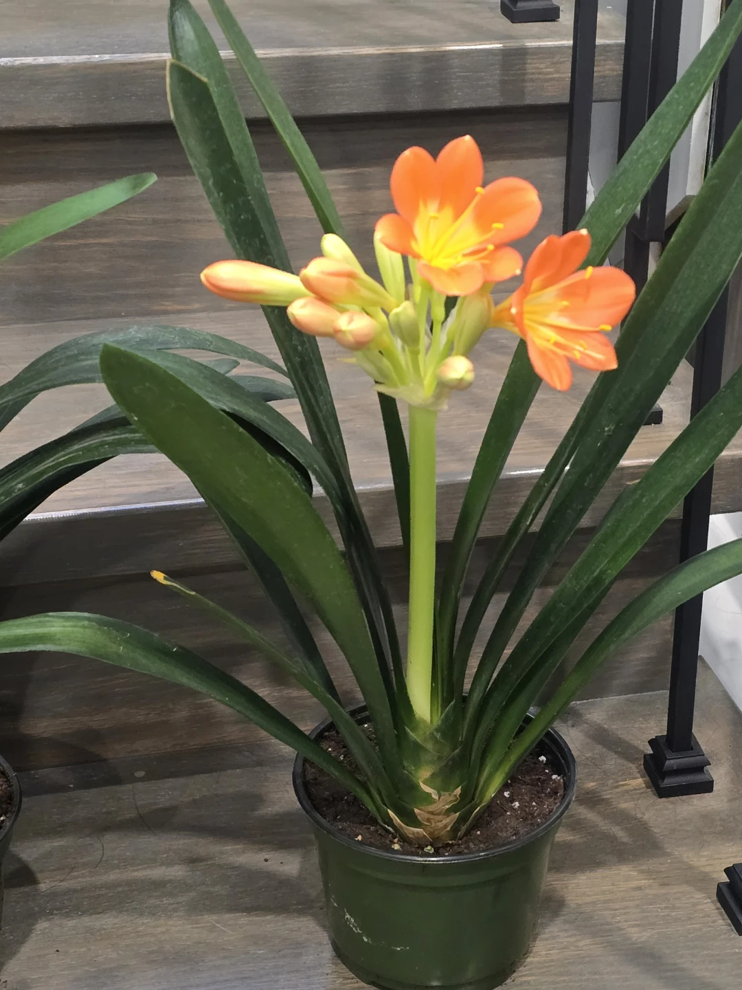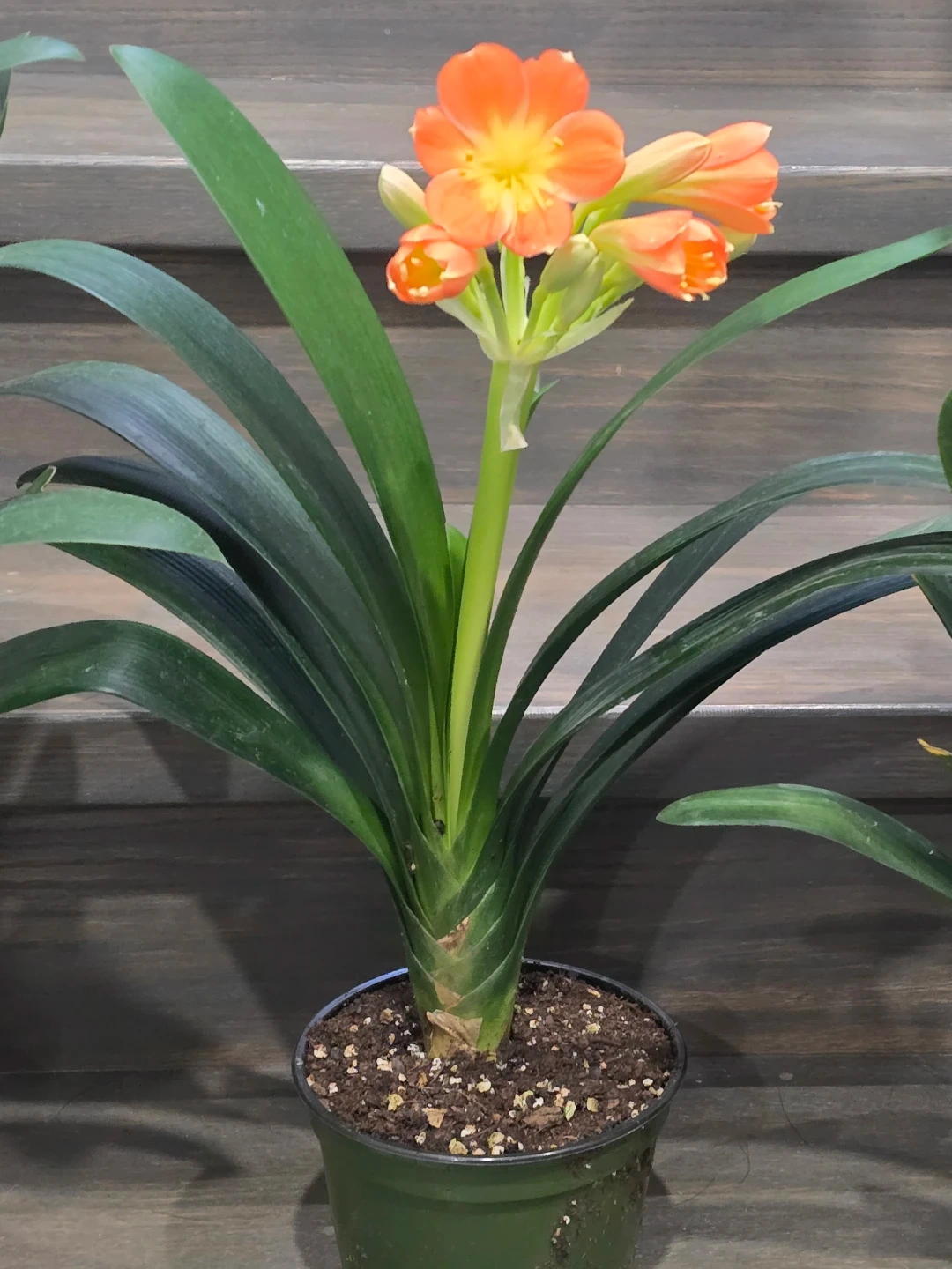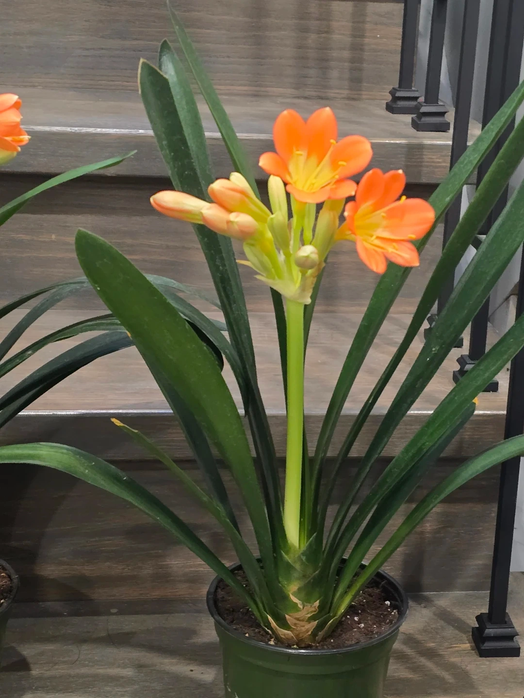 Selling a lovely Clivia plant, ready to brighten up your space! It's currently in a green pot and has vibrant green leaves. It looks like it's about to bloom with some beautiful orange flowers!