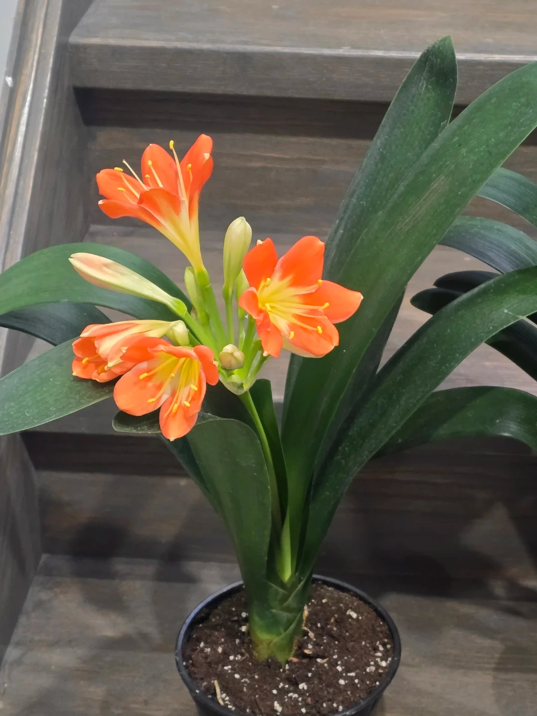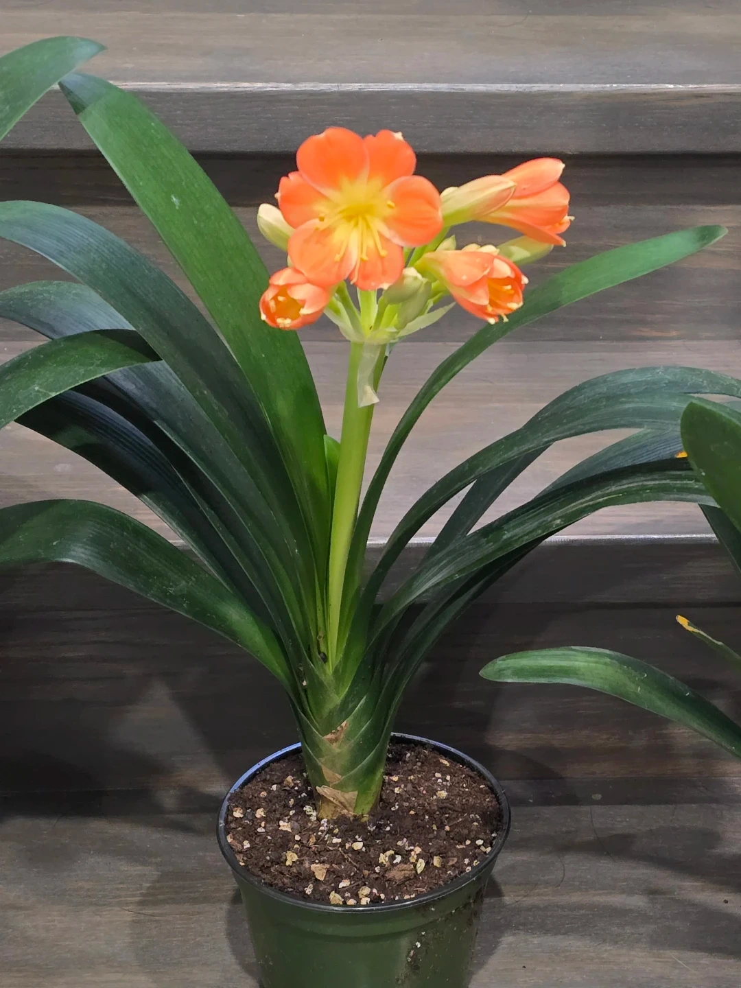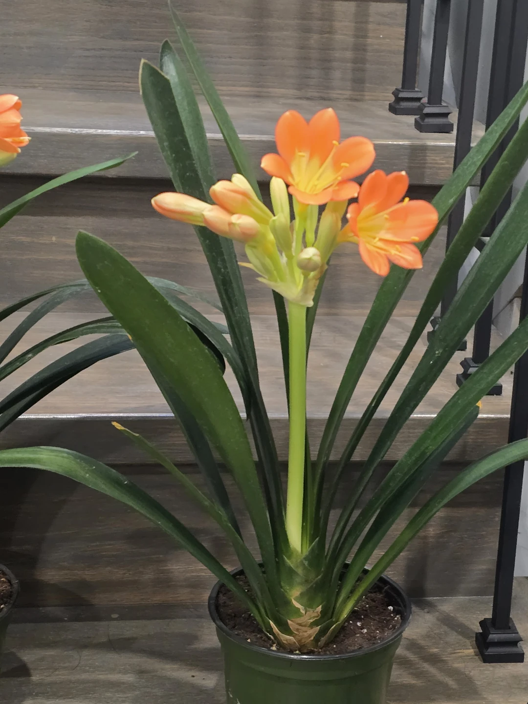 Selling a lovely Clivia plant, ready to brighten up your space! It's currently in a green pot and has vibrant green leaves. It looks like it's about to bloom with some beautiful orange flowers!