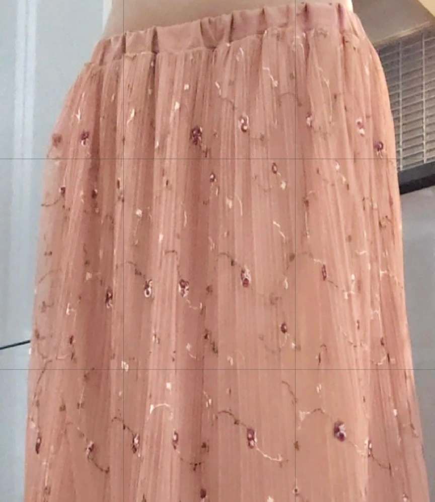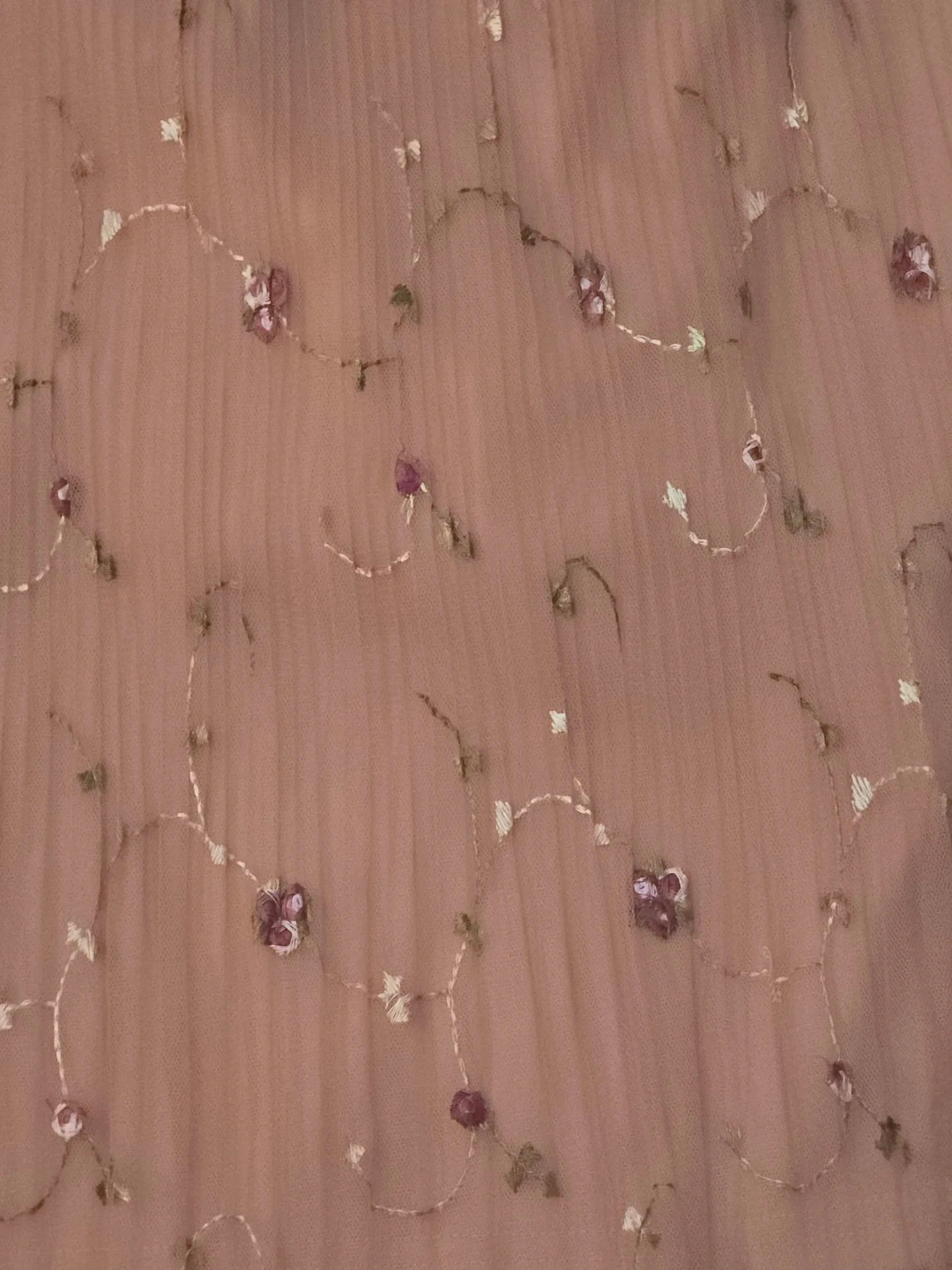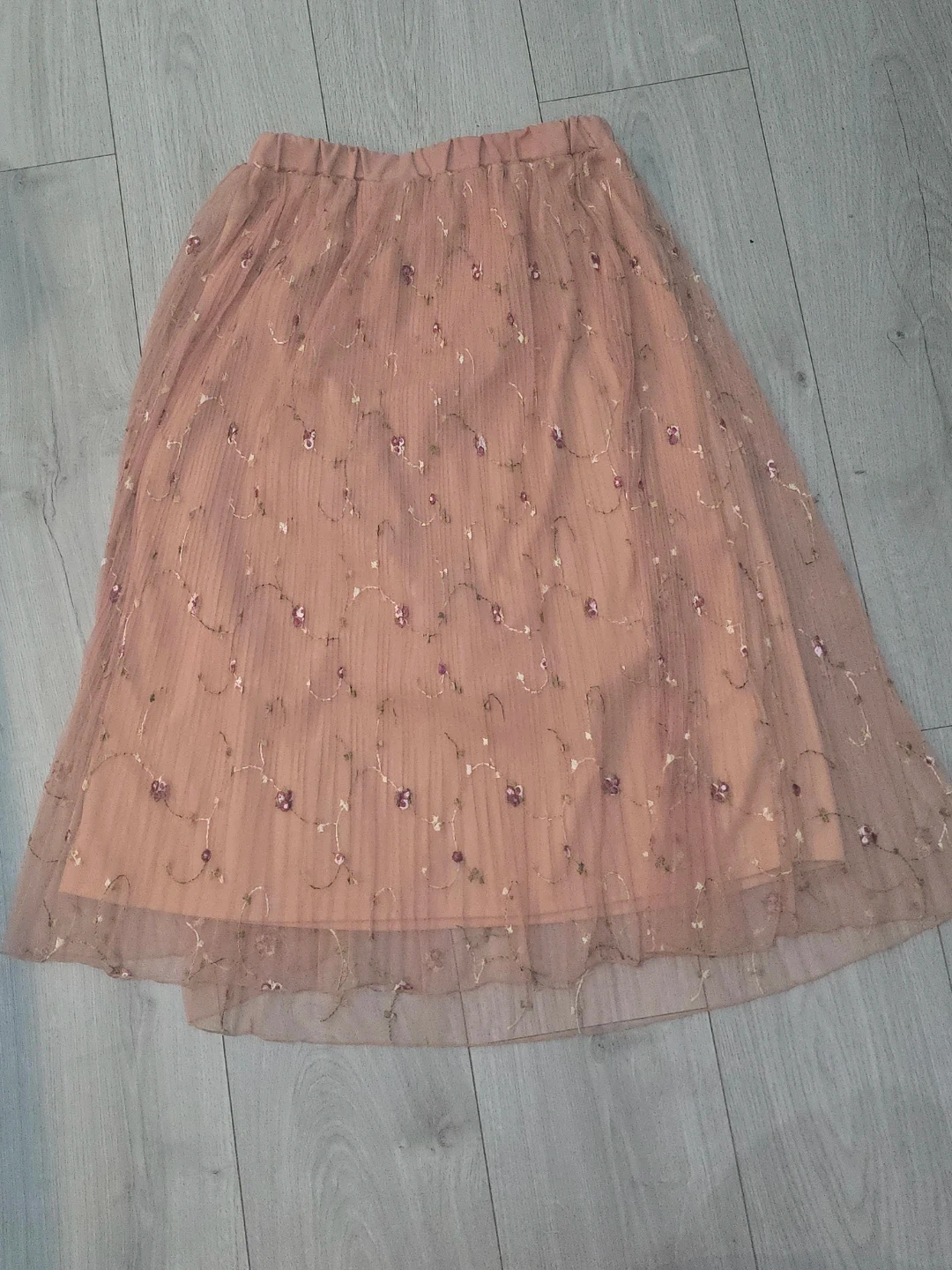 Selling a cute peach-coloured skirt with floral embroidery! It's made of a lightweight tulle material and has a comfortable elastic waistband. Perfect for spring or summer!