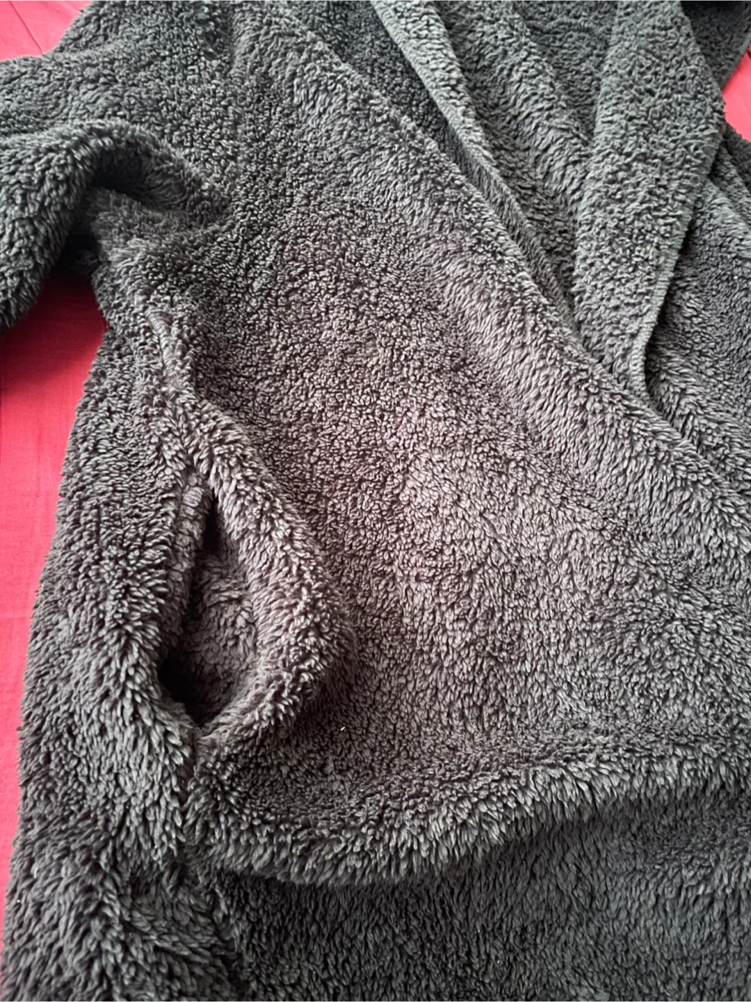 Cozy up in this soft, fuzzy grey robe! It's in great condition and perfect for chilly evenings. It features a hood and pockets for extra warmth and convenience