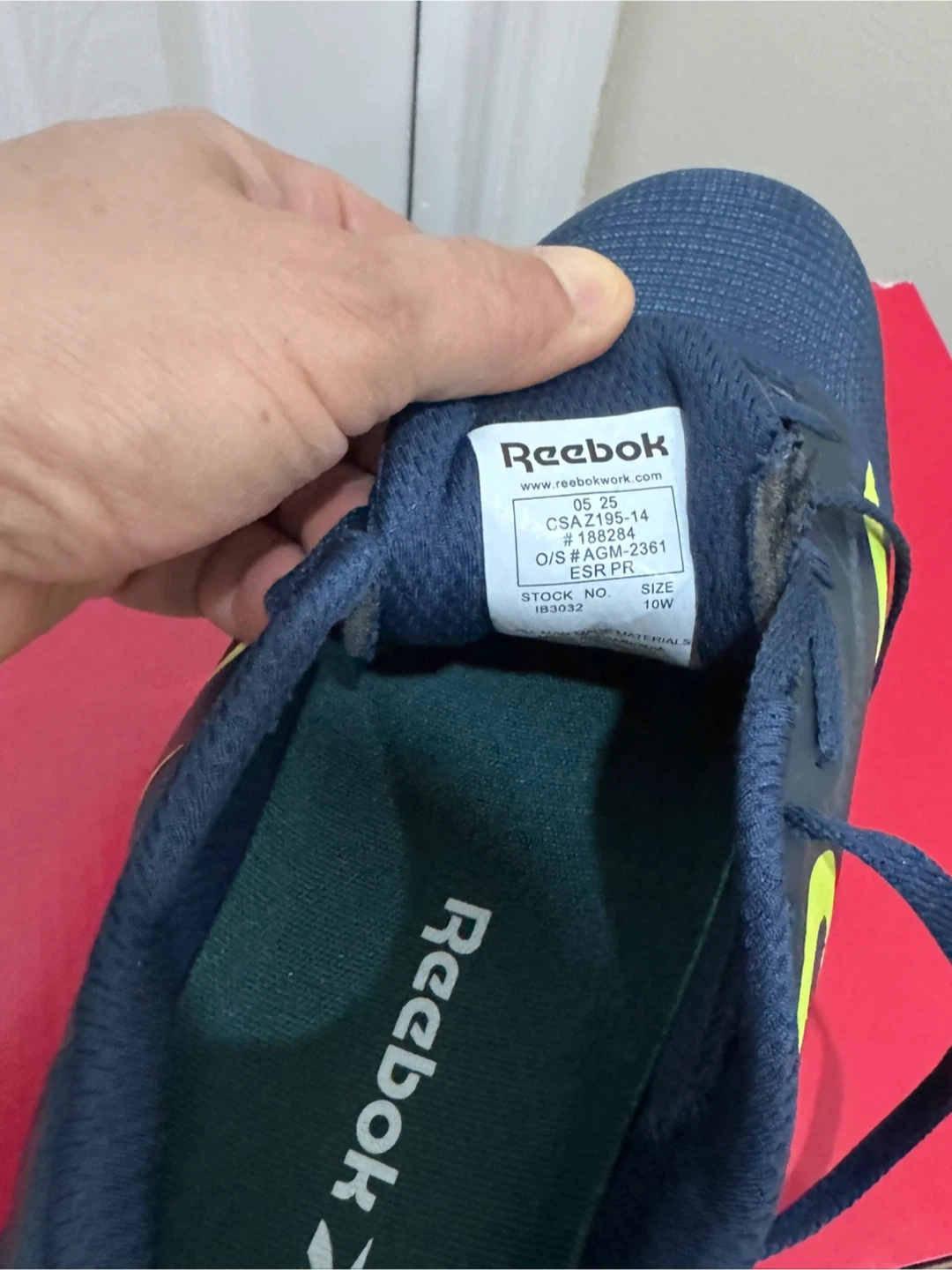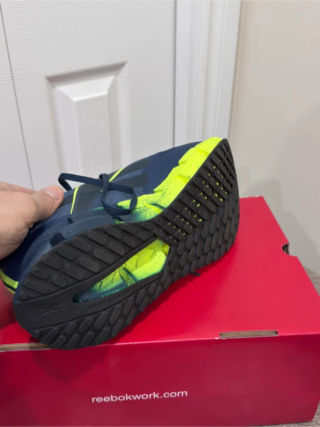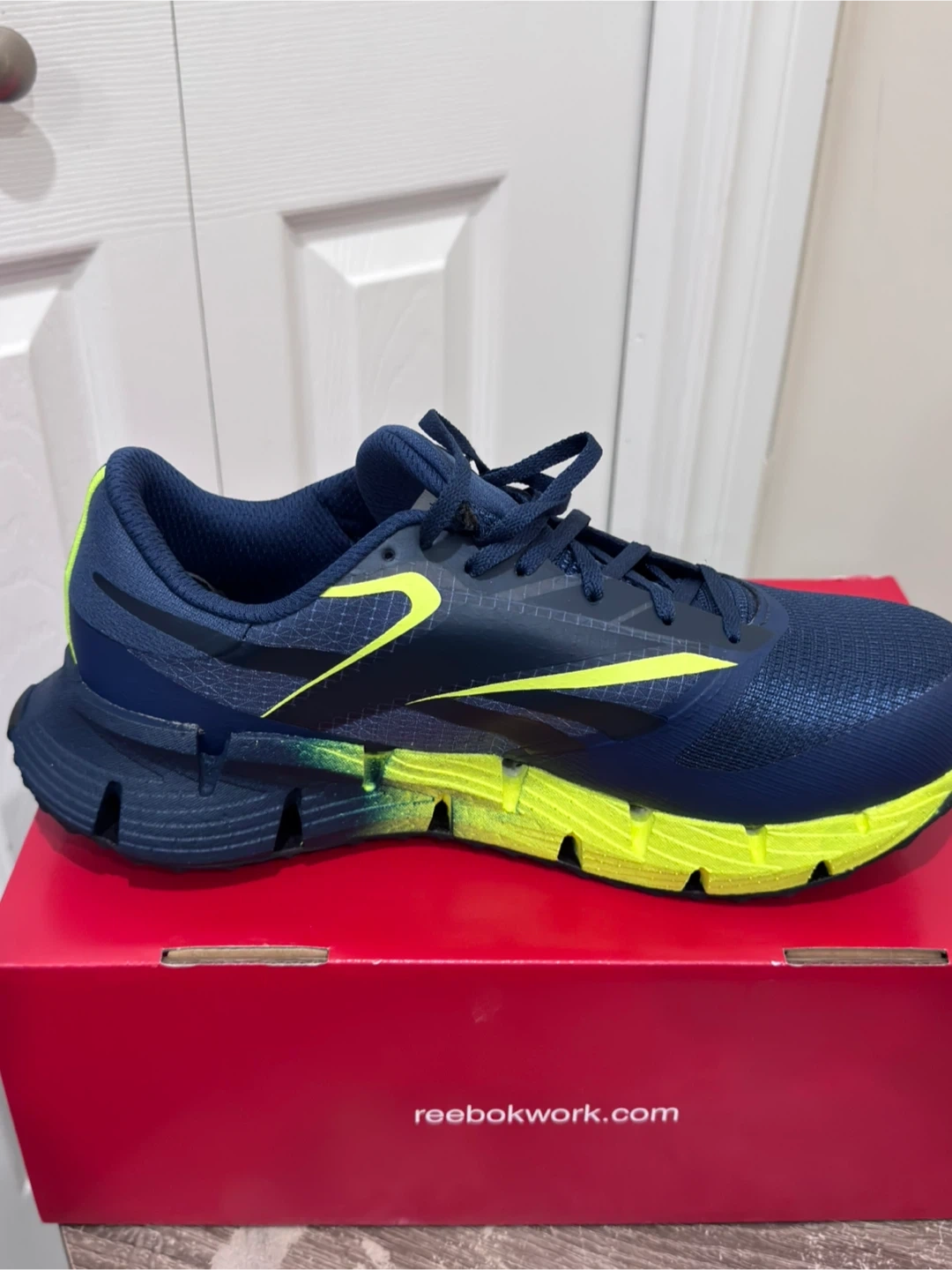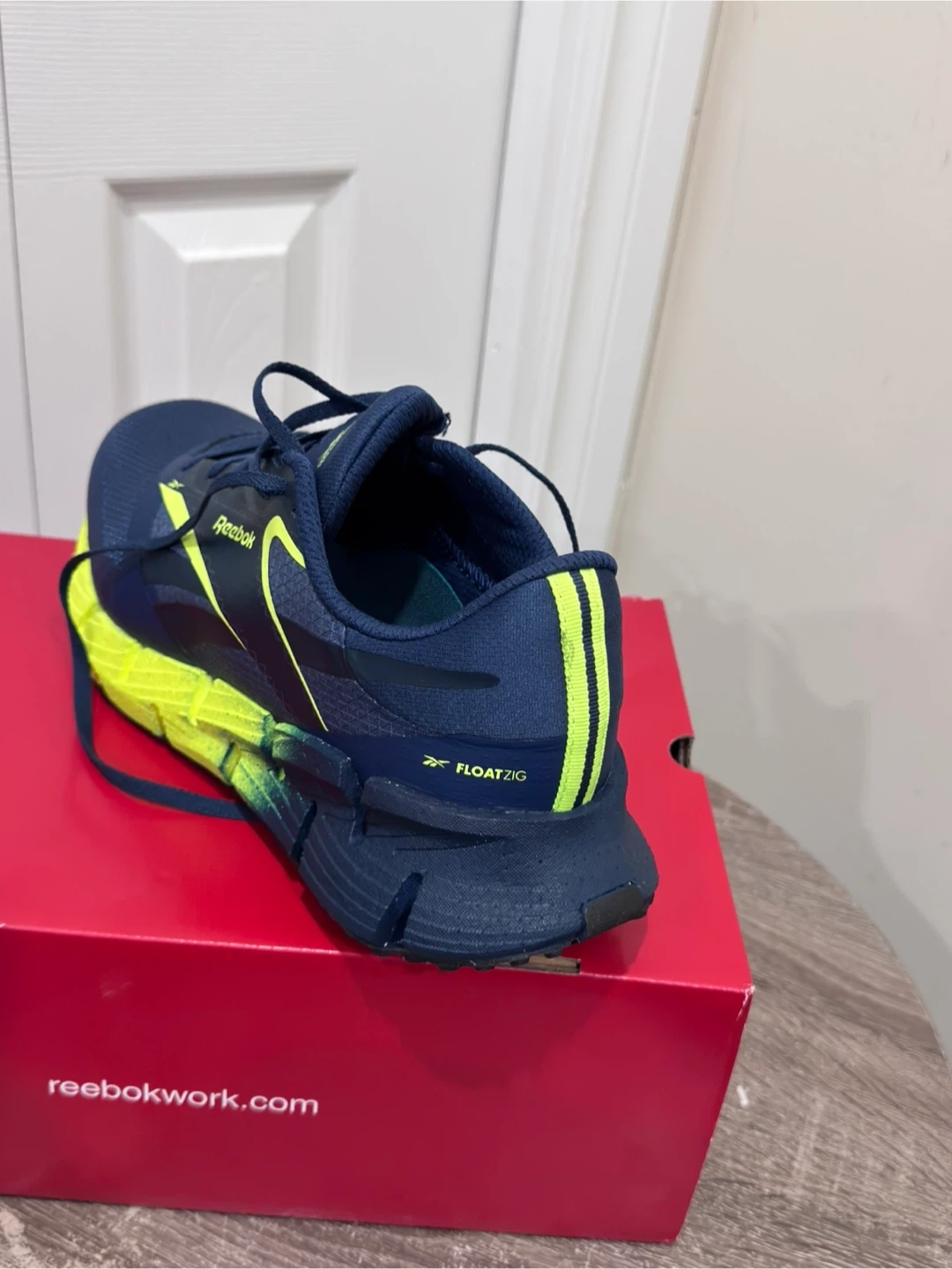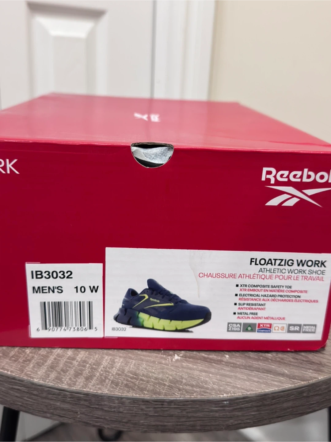 Selling a pair of Reebok FloatZig safty shoes for men in size 10W. They a new and come with the original box. The shoes feature a navy and yellow colour scheme and FloatZig technology for a comfortable !