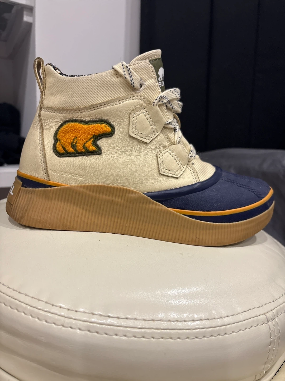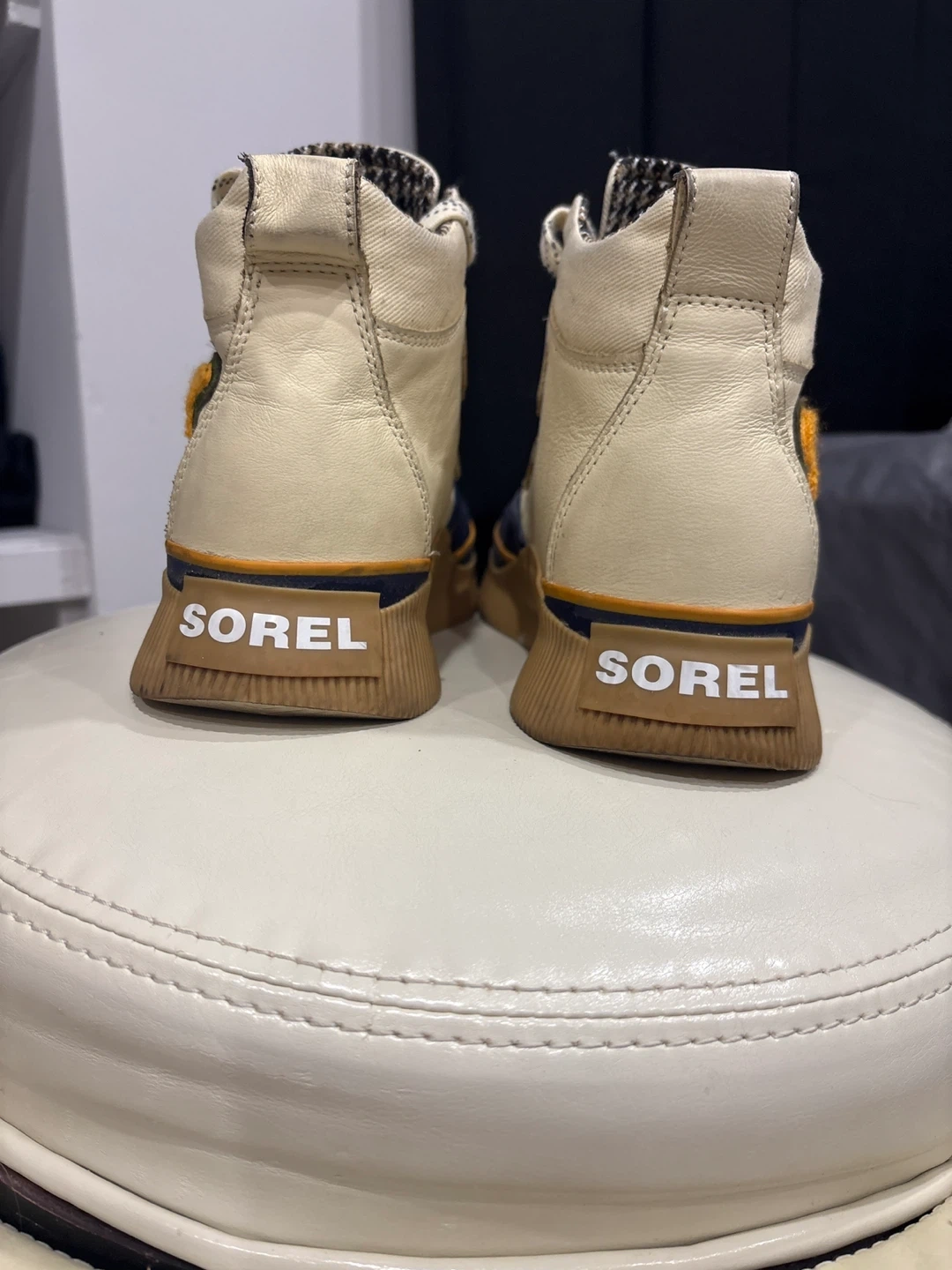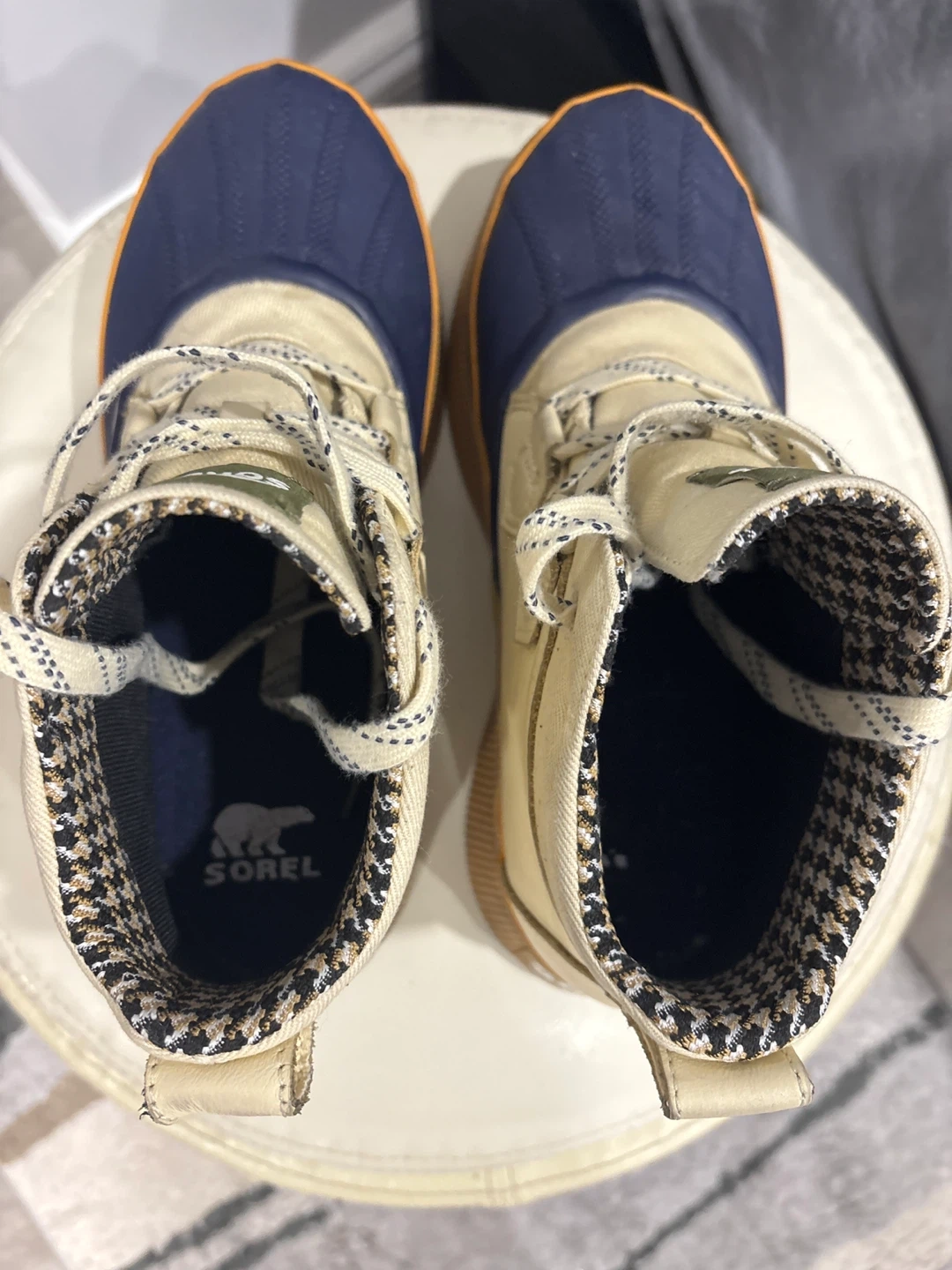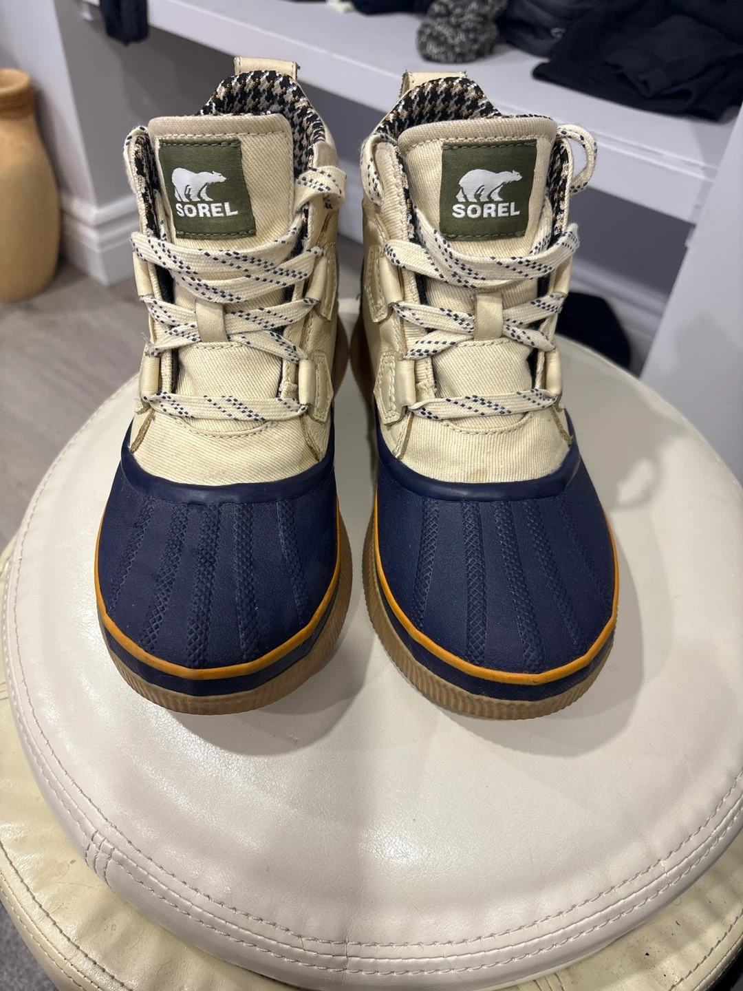 Selling a pair of Sorel waterproof boots in great condition! They're a size 8.5 and feature a stylish design with a navy blue and beige colour scheme. Perfect for keeping your feet dry and comfortable in wet weather. Wore twice. Women 8.5 US