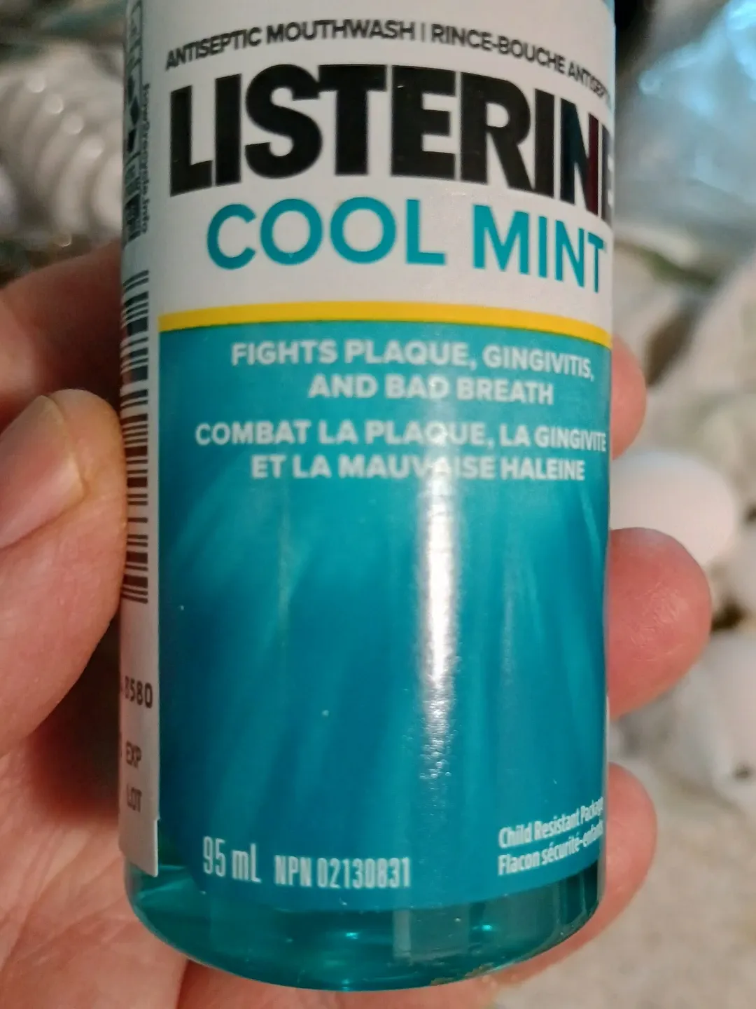 I'm selling a bottle of Listerine Cool Mint antiseptic mouthwash. It fights plaque, gingivitis, and bad breath. The bottle contains 95 mL.