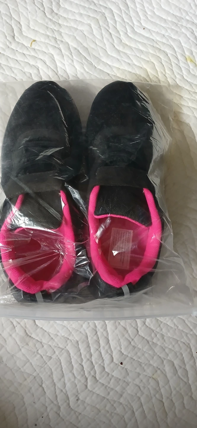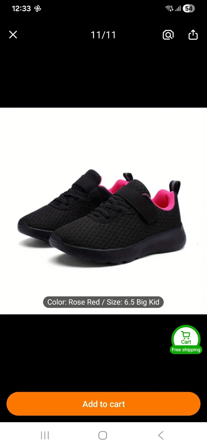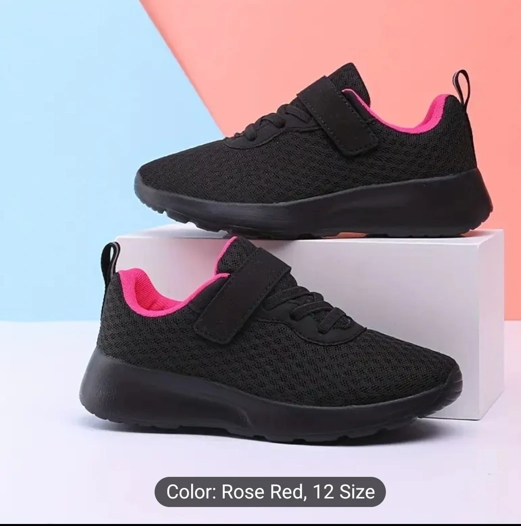 I have a pair of kids' sneakers in black with rose red accents. They feature a convenient velcro strap. Available in size 6.5 (Big Kid)