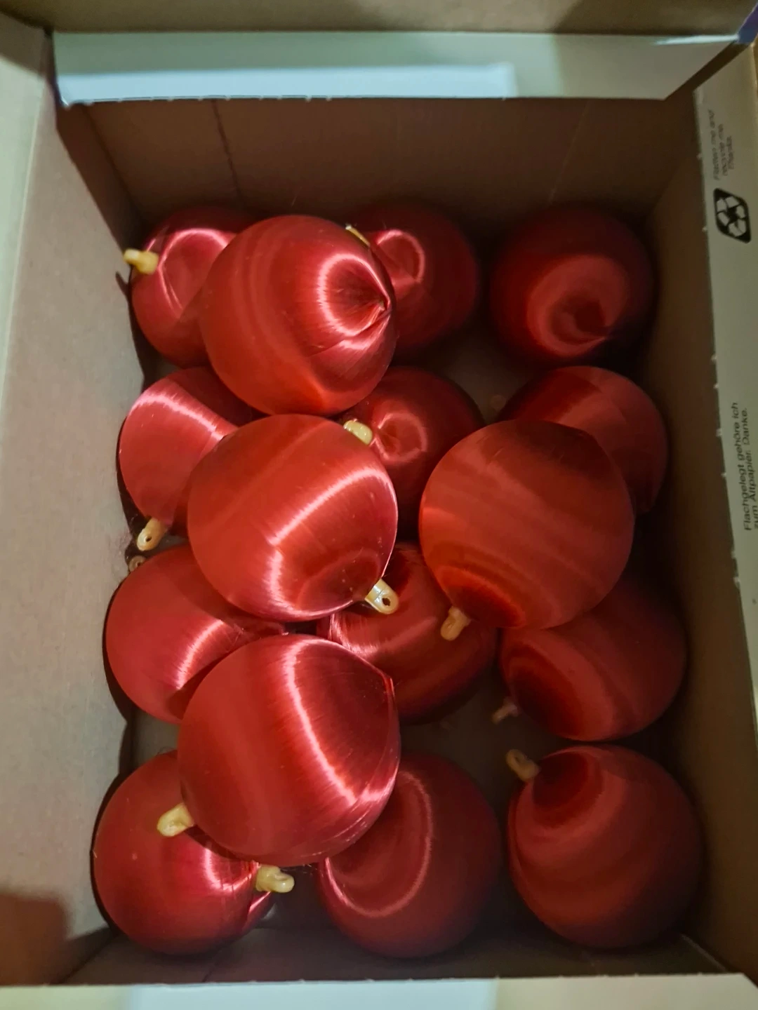 Selling a box of 15(ish) red satin Christmas ornaments! They have a lovely satin finish and are ready to add some festive cheer to your tree 🌲