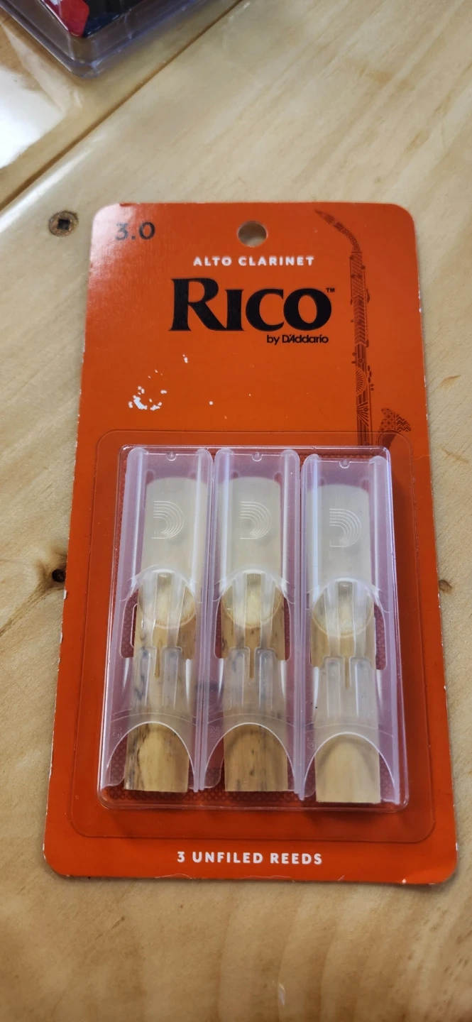 Selling a pack of Rico Alto Clarinet Reeds, size 3.0. This pack contains 3 unfiled reeds. Perfect for clarinet players looking for quality reeds!