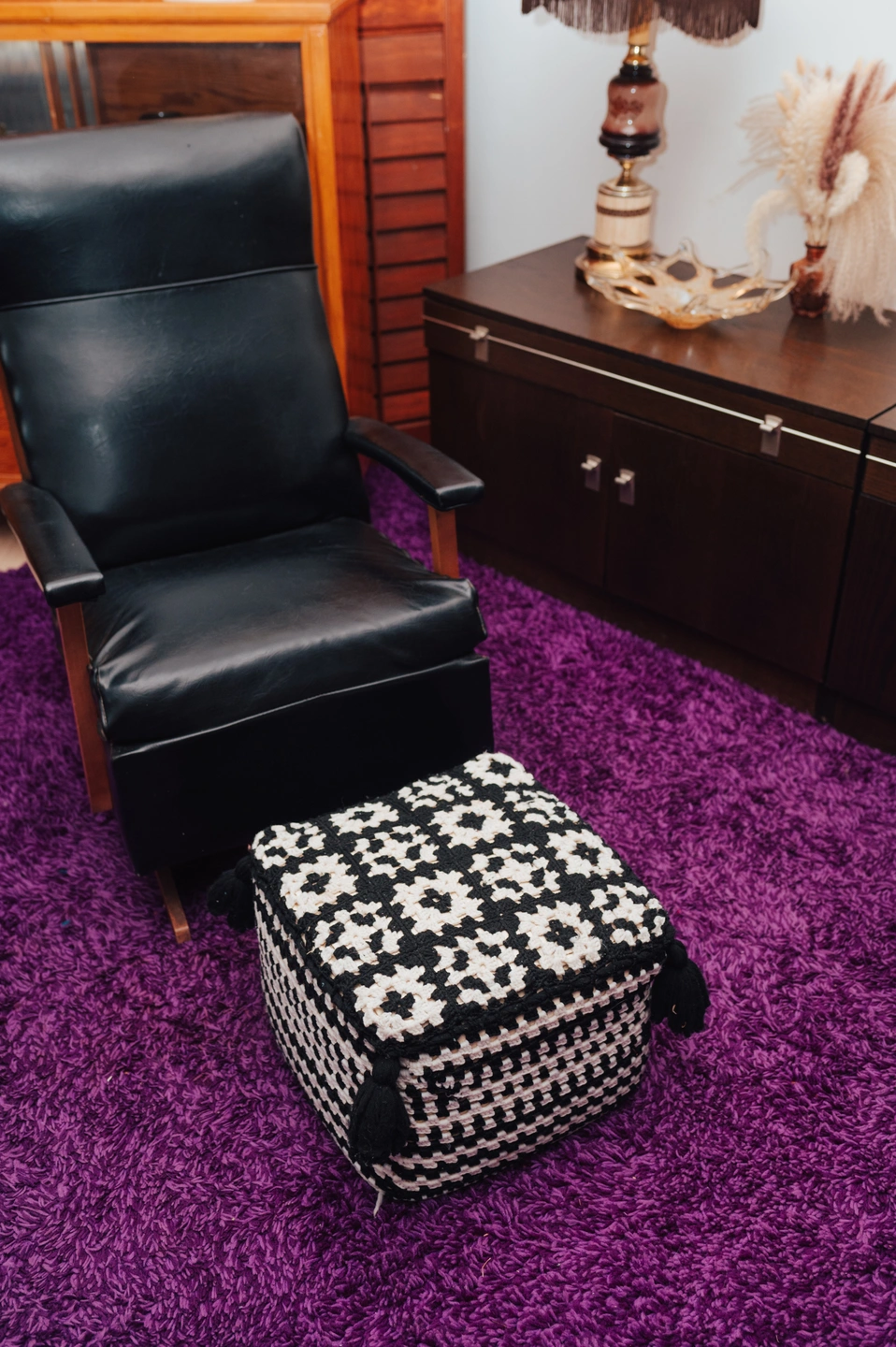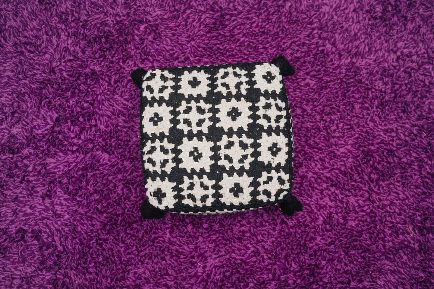 Beautiful handwoven ottoman in a classic black and white pattern.