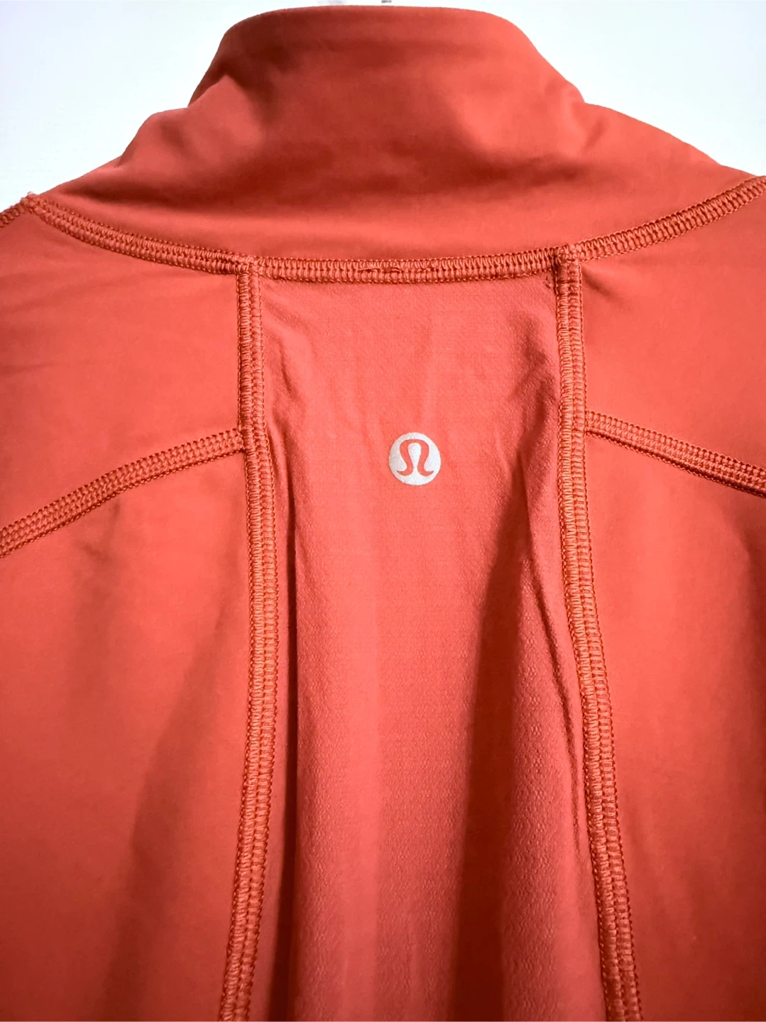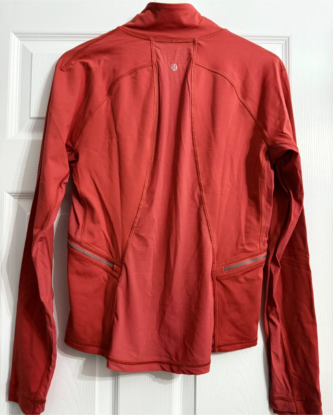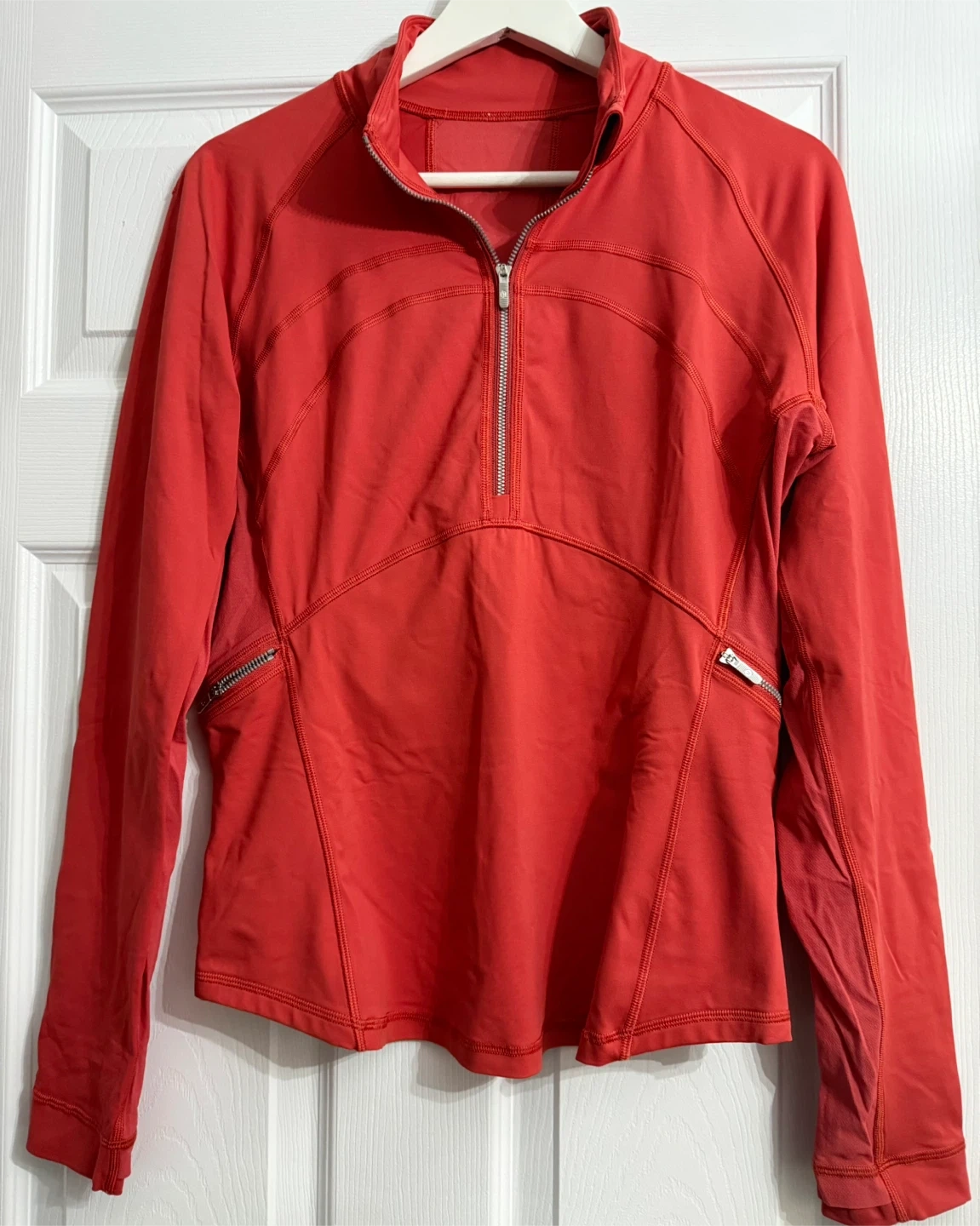 Selling a Lululemon long sleeve top in a vibrant coral colour! It's in great condition and perfect for workouts or casual wear. The design features a front zipper and convenient side pockets with zippers. It's a stylish and functional piece to add to your wardrobe!