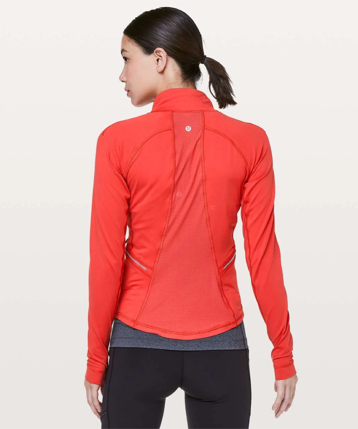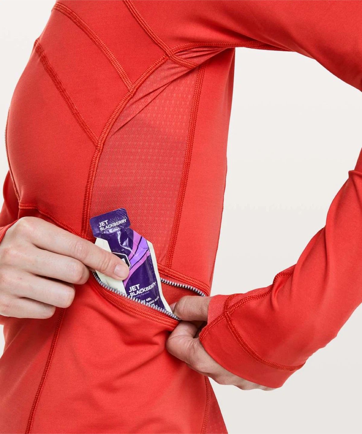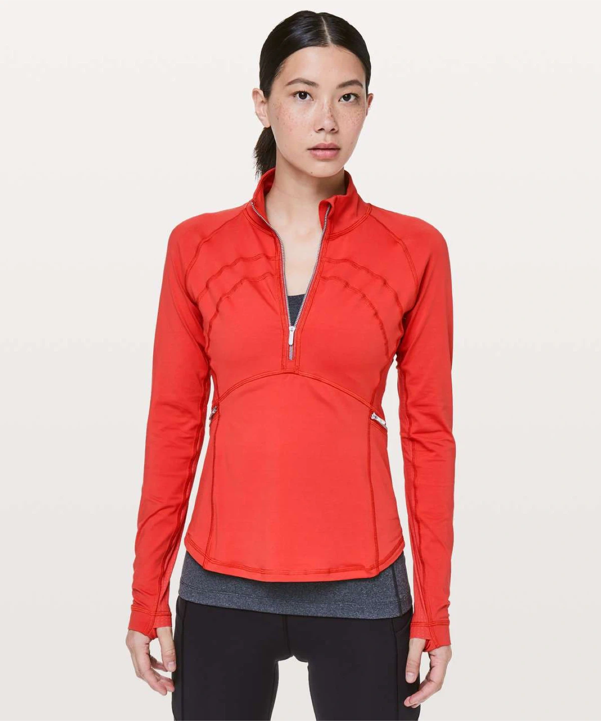 Selling a Lululemon long sleeve top in a vibrant coral colour! It's in great condition and perfect for workouts or casual wear. The design features a front zipper and convenient side pockets with zippers. It's a stylish and functional piece to add to your wardrobe!