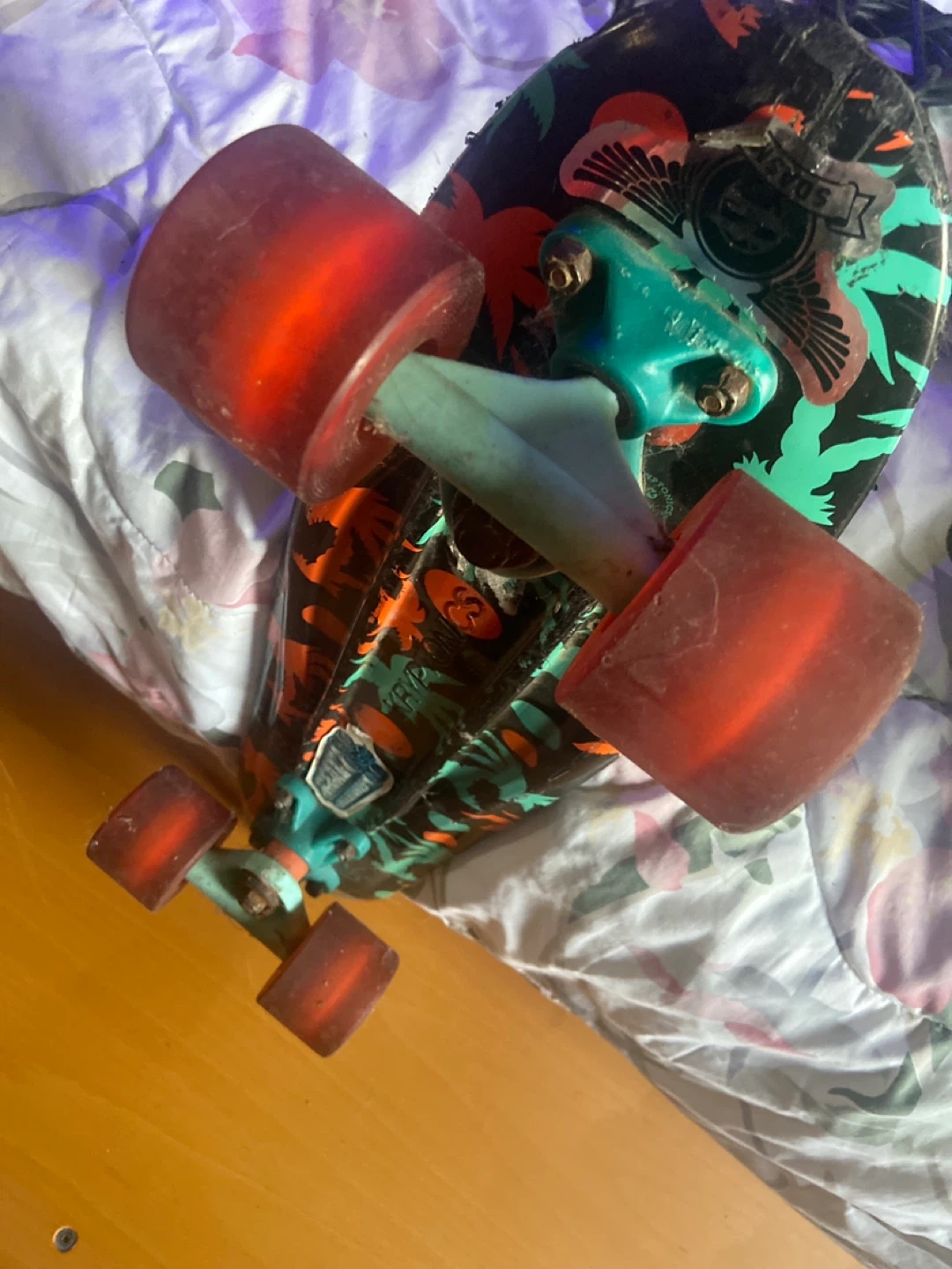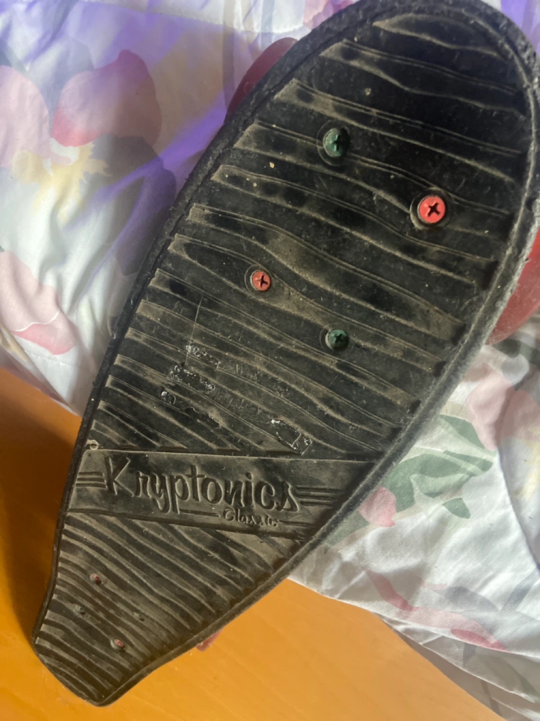 Selling a Kryptonics Classic skateboard. It has a cool floral design on bottom and red wheels. It's in used condition, but still has lots of life left! Perfect for cruising around town