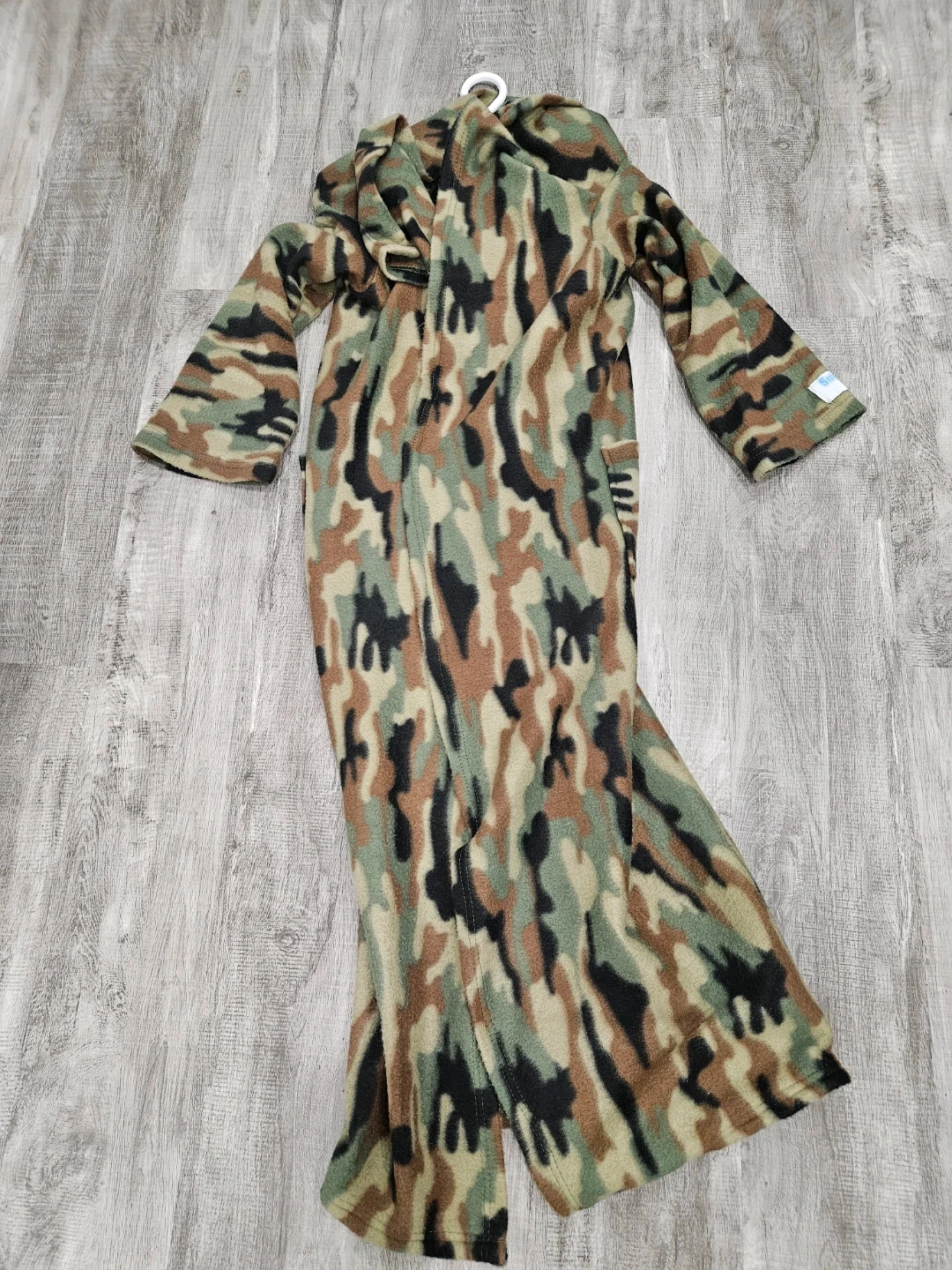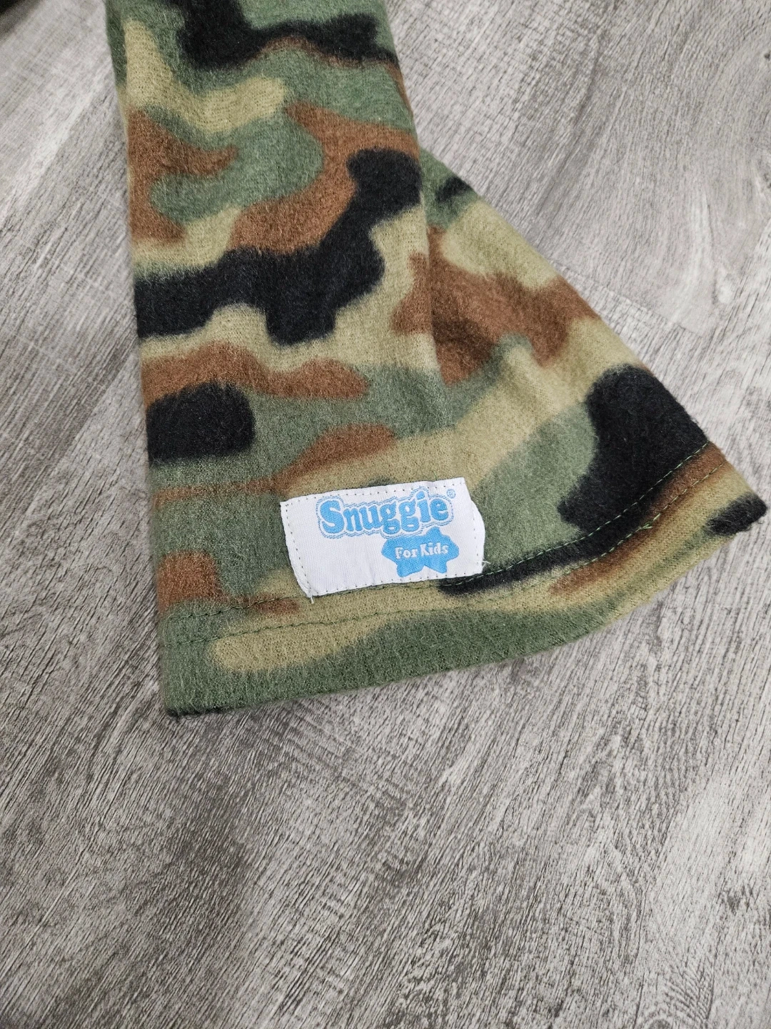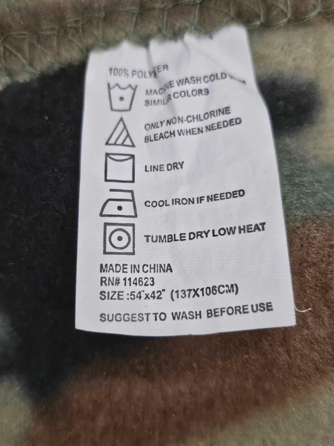 The camo pattern is super fun, and it's made of 100% polyester. It measures 54" x 42" (137 x 106 cm).