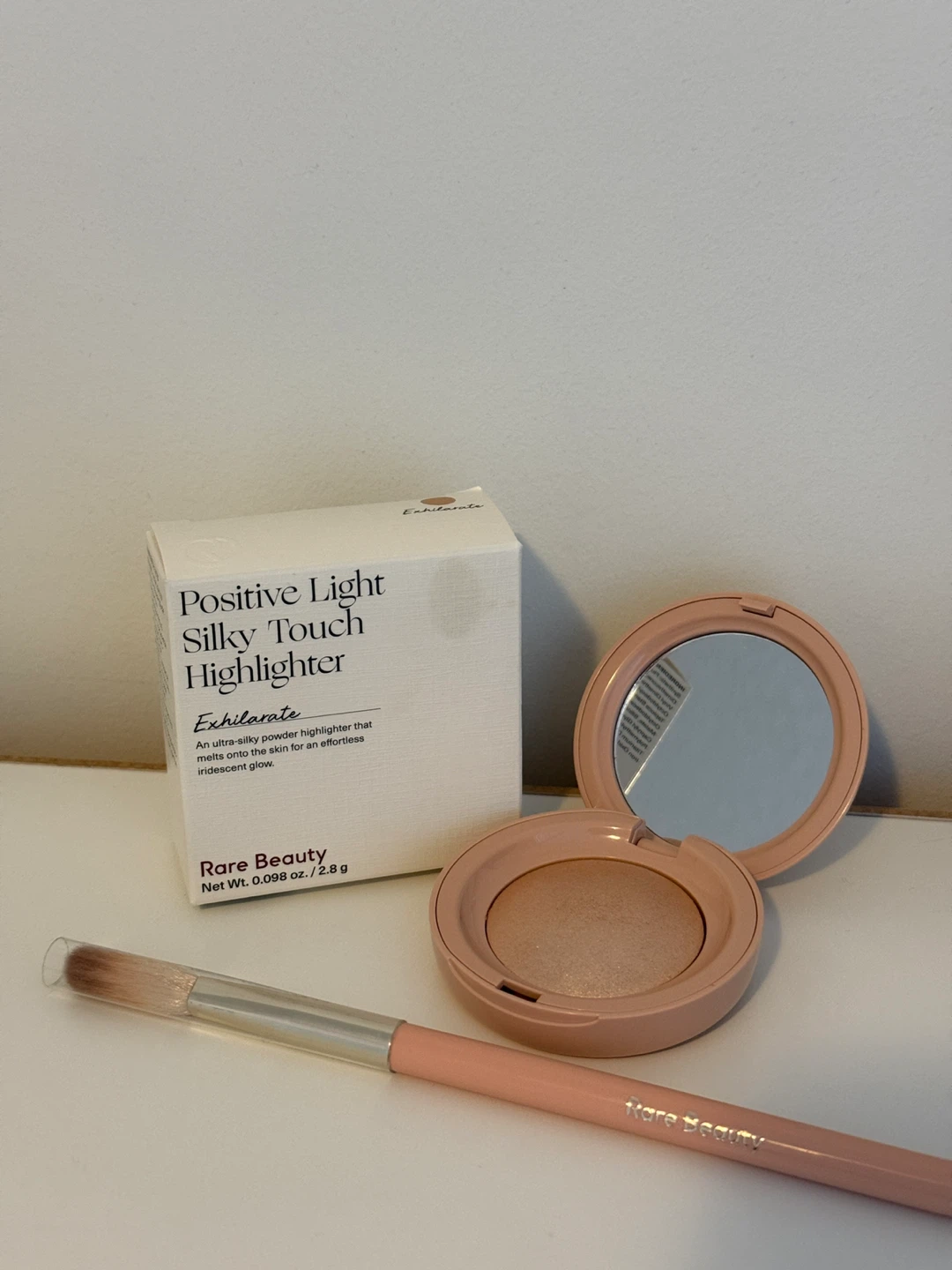 Selling a Rare Beauty Positive Light Silky Touch Highlighter in the shade Exhilarate including the Rare Beauty Precision Highlighter Brush! It's an ultra-silky powder highlighter that melts onto the skin for an effortless iridescent glow. Comes with the box and a brush! Highlighter only swatched once but never used. Brush is brand new. Selling both for $15.