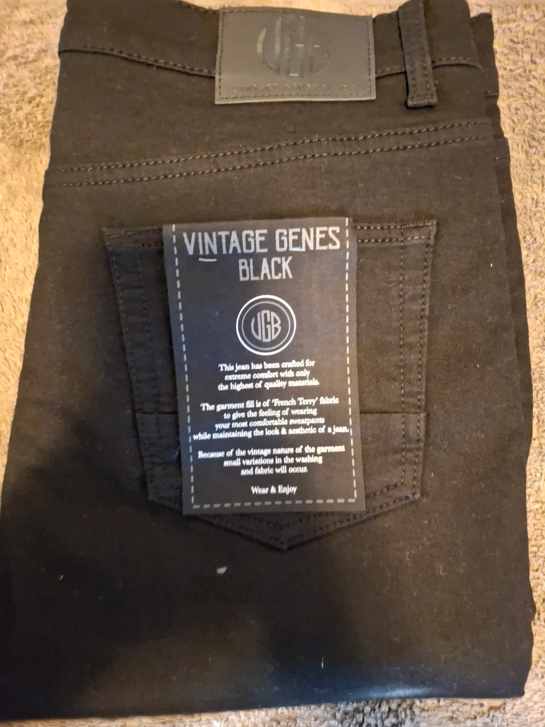 I'm selling a pair of Vintage Genes Black jeans in size 34x30. These jeans are crafted for extreme comfort with only the highest quality materials. The garment fill is of 'French Terry' fabric to give the feeling of wearing sweatpants while maintaining the look and aesthetic of a jean. Because of the vintage nature of the garment, small variations in the washing and fabric will occur