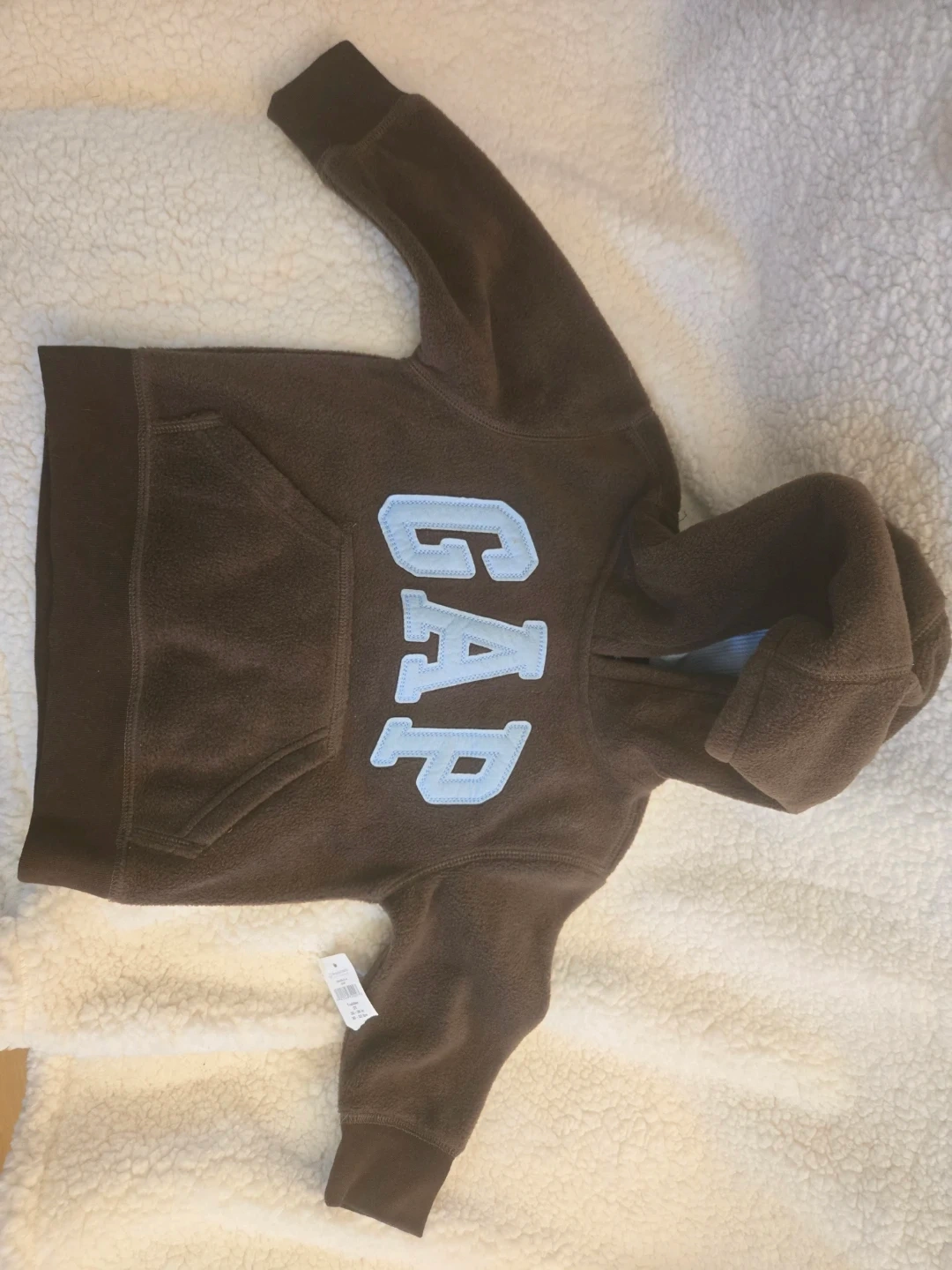This is a cozy brown fleece hoodie from GAP in toddler size 2T. It's designed for toddlers weighing 30-33 lbs and measuring 33-36 inches. Perfect for keeping your little one warm!