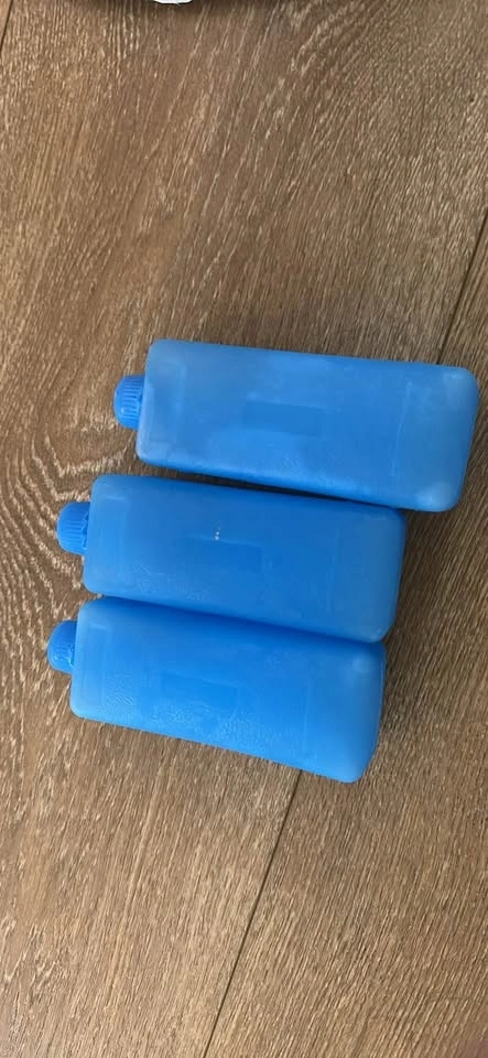 Standing cooling fan with remote control. Can be filled with water to add a cooling mist. Comes with 3 ice blocks to add additional cooling.