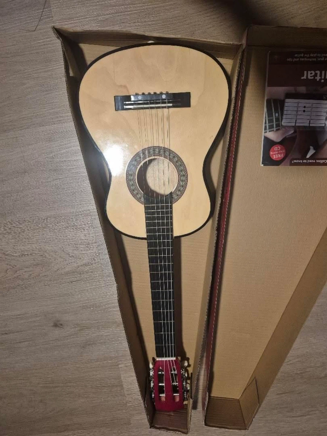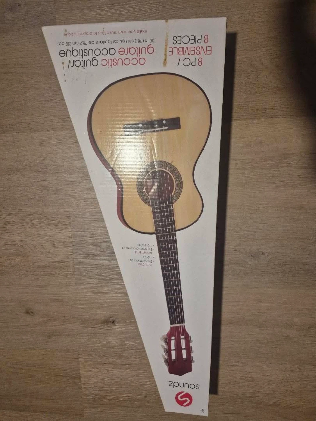 Selling a Soundz acoustic guitar set! It's an 8-piece ensemble that includes everything you need to start playing. Comes with a guitar, learning materials, and other accessories. Perfect for beginners or anyone looking to pick up a new hobby! The box is included.